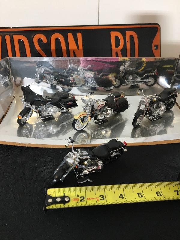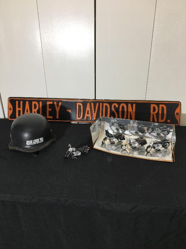 Harley Davidson Metal Sign, Set of 4 Mini Collector Bikes, Helmet