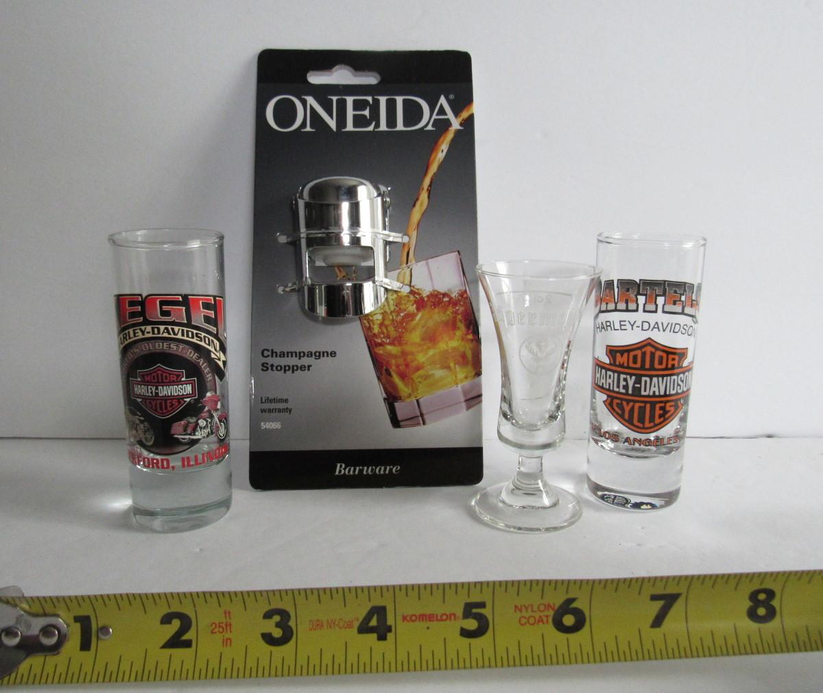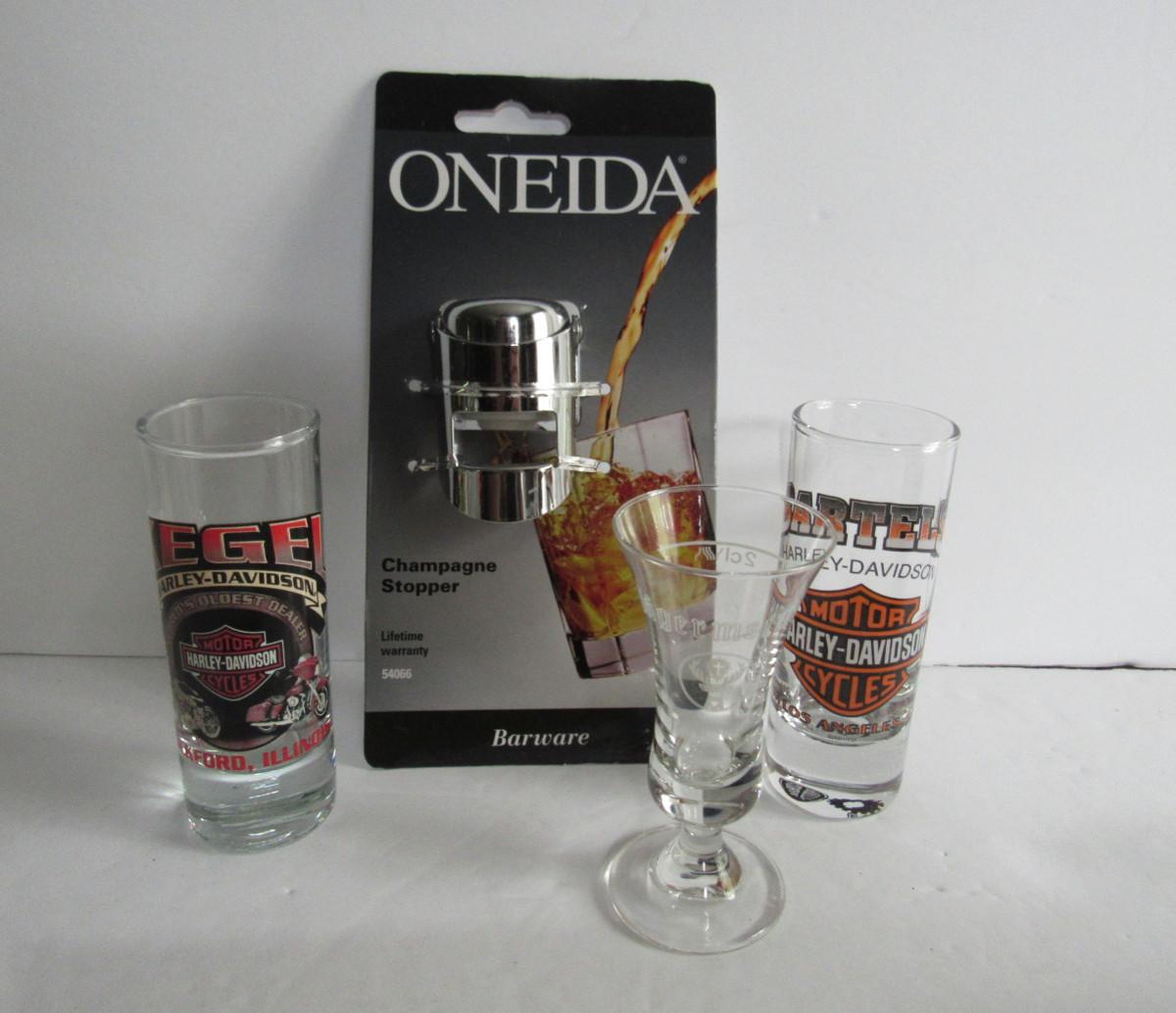 Harley Davidson Shot Glasses, Oneida Champagne Stopper