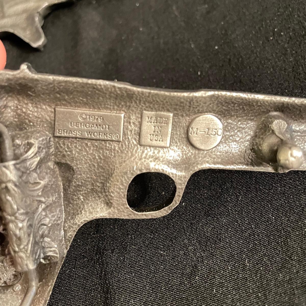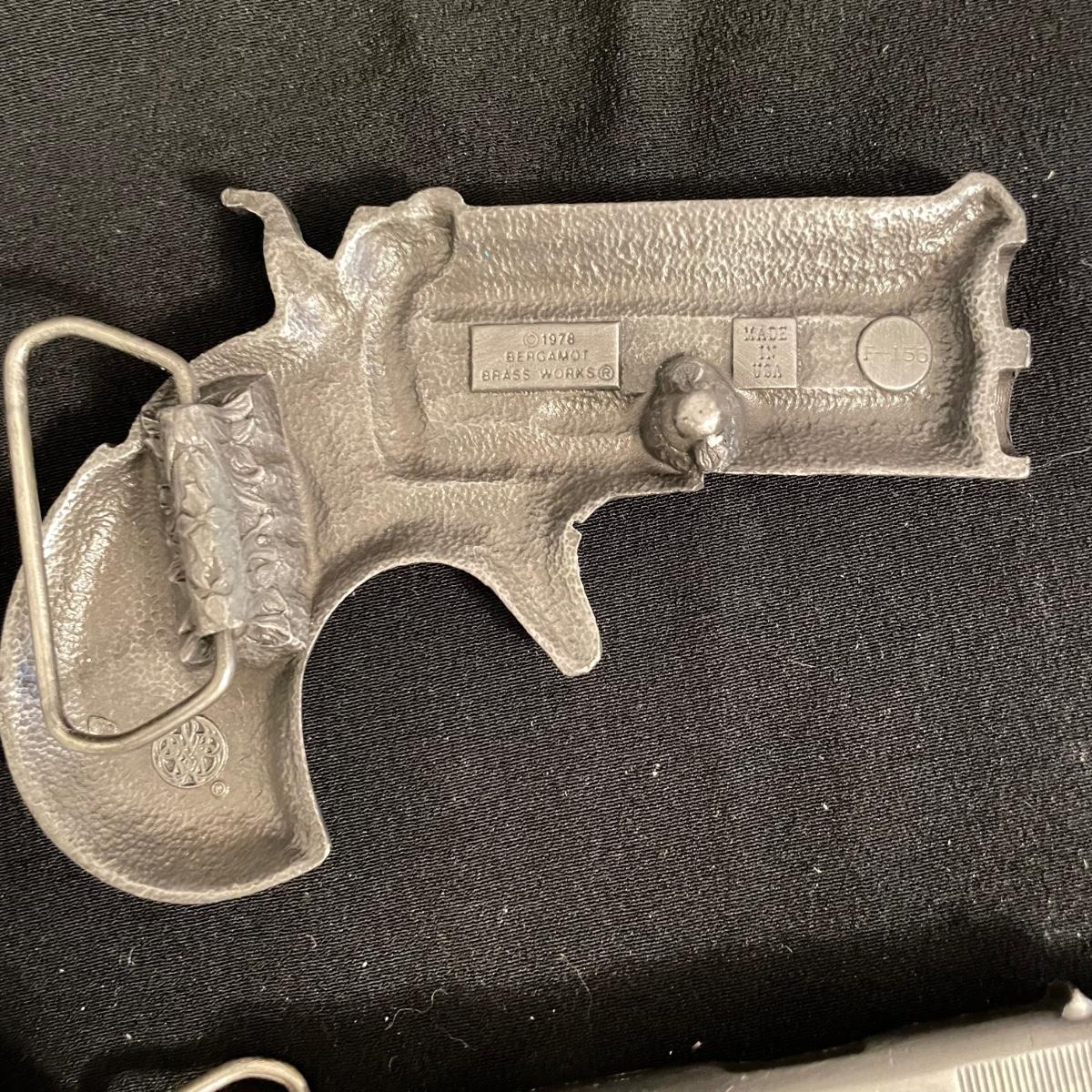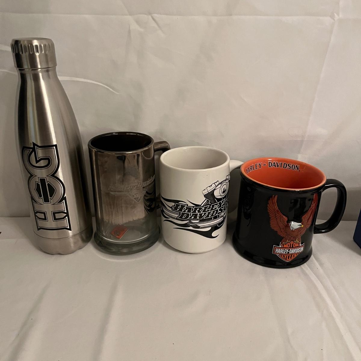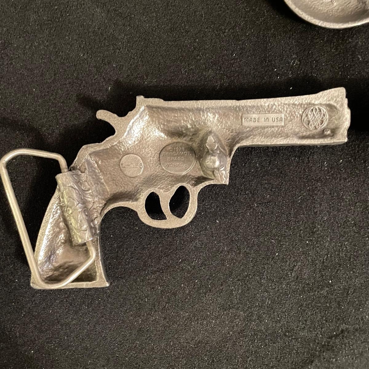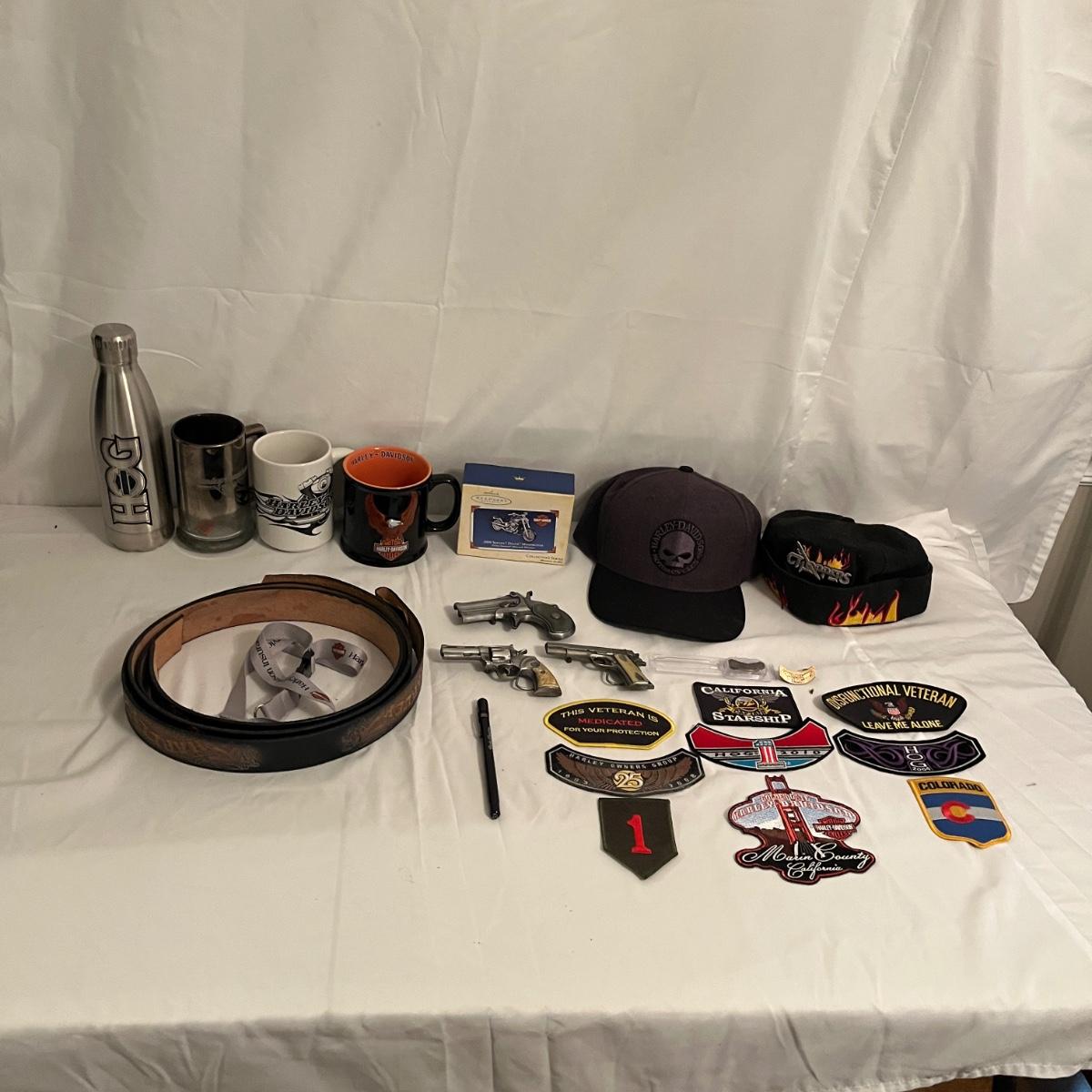 Lot includes three Bergamot pistol belt buckles, array of patches, two hats, Hallmark ornament, three mugs, water bottle and two leather belts that measure 1.25” x 52”Long.