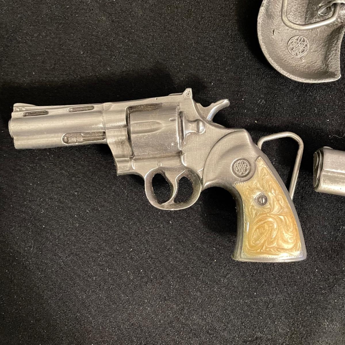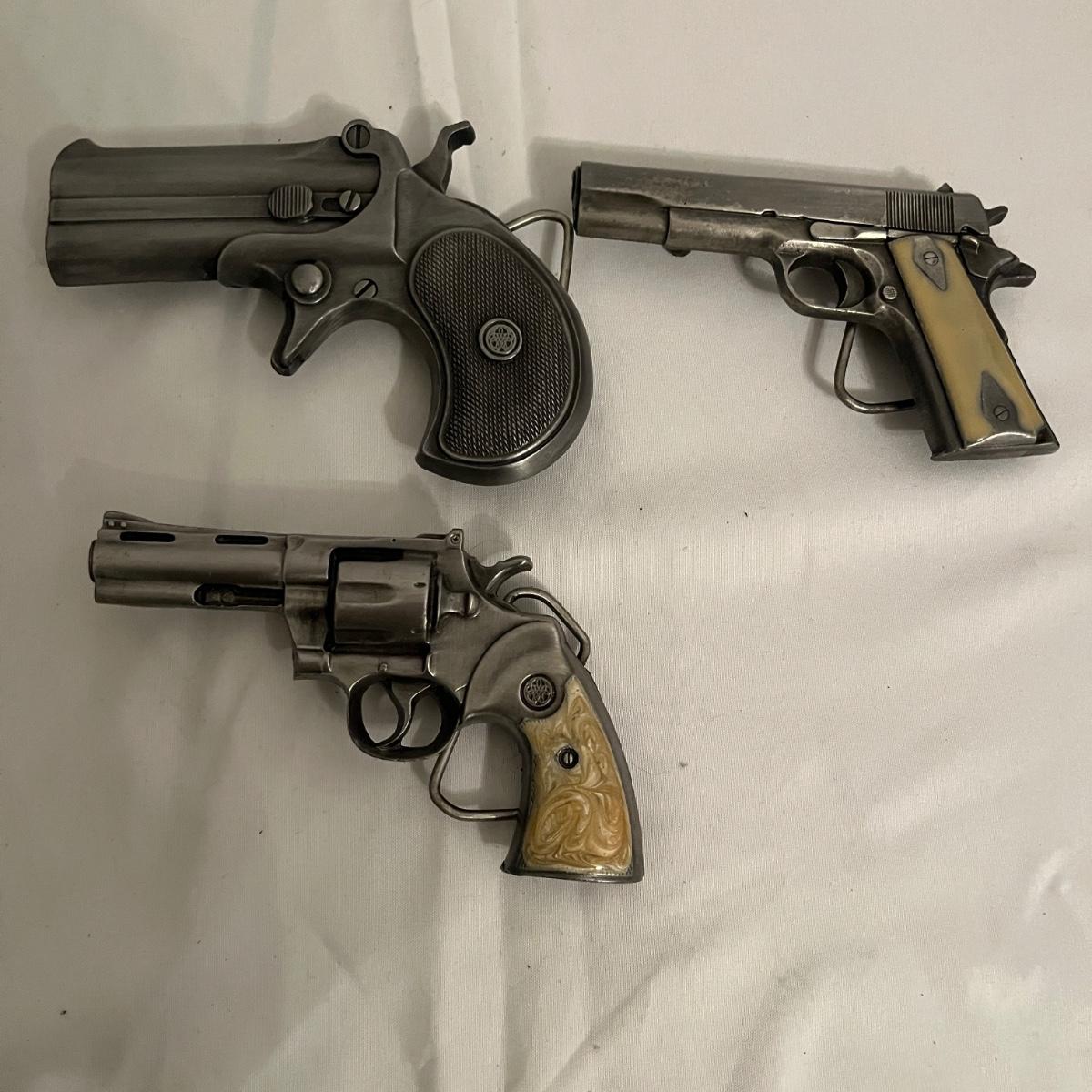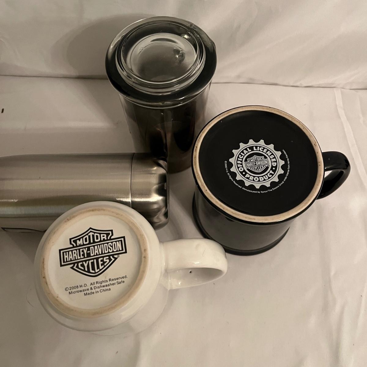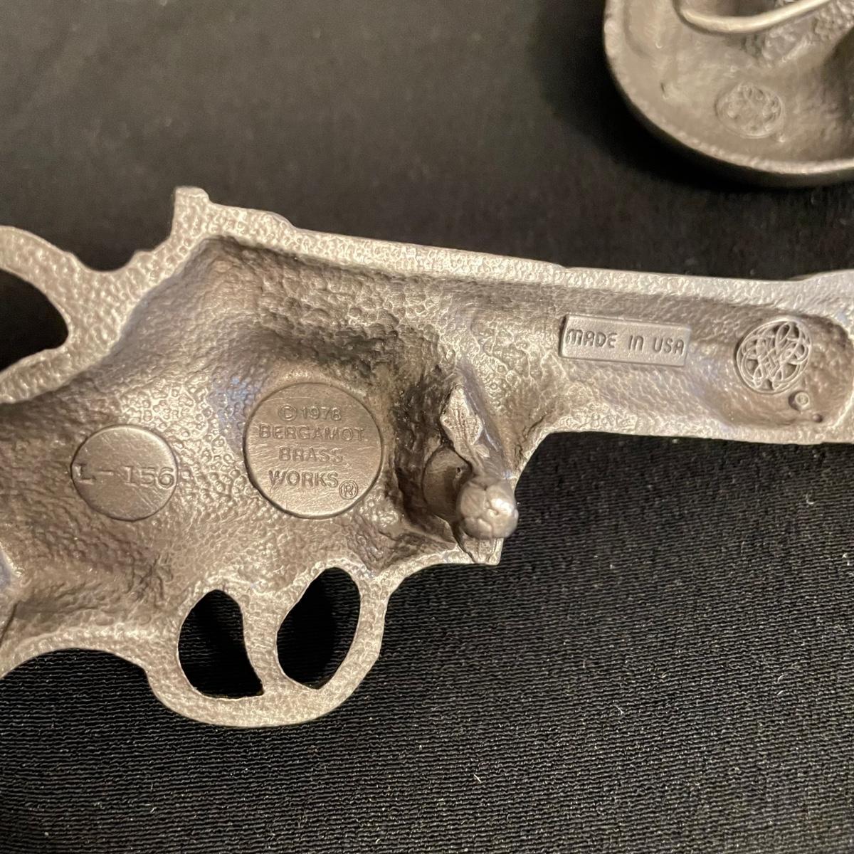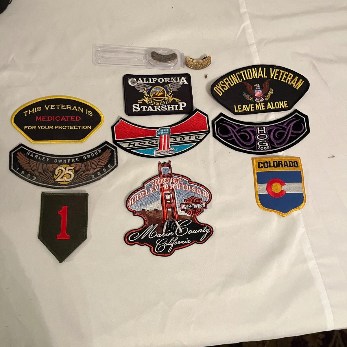 Lot includes three Bergamot pistol belt buckles, array of patches, two hats, Hallmark ornament, three mugs, water bottle and two leather belts that measure 1.25” x 52”Long.