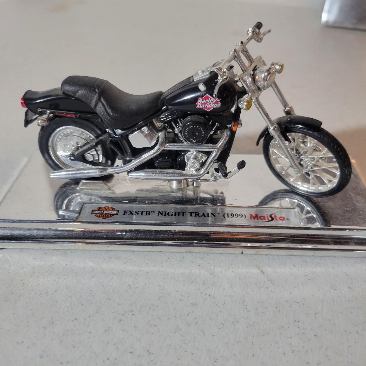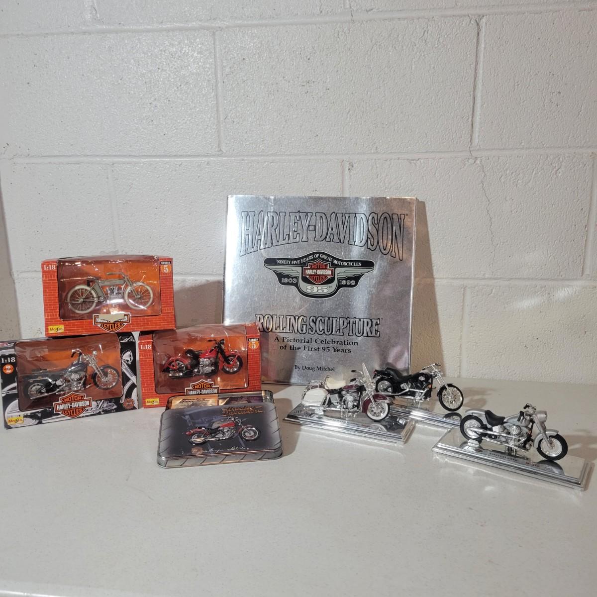 An assortment of Harley-Davidson collectibles, all in good condition. Included are six die cast models of popular HD motorcycles. Three are in their original packaging. Packaging does show some damage. Three are silver colored bases. These are all a 1:18 scale. For reference, the 1999 Night Train’s base measures 7” x 2.75”. Also included is photo book of 95 years of HD motorcycles and two unused card decks in a collectable tin. Shipping available