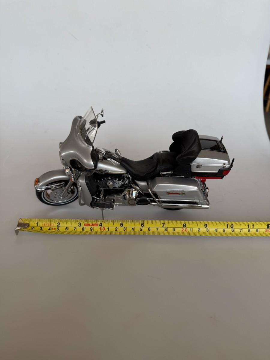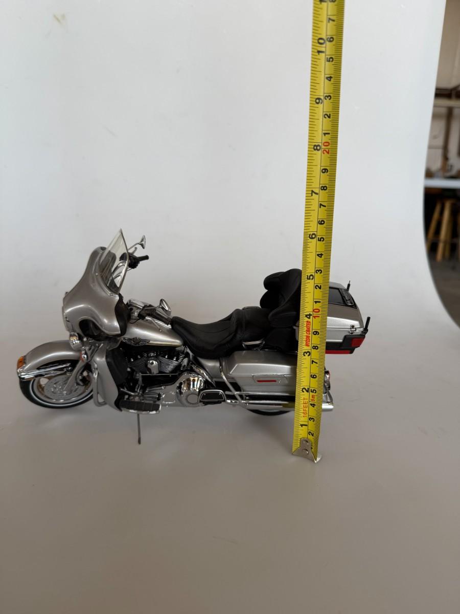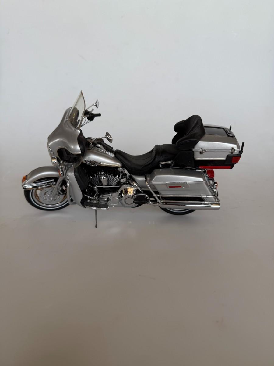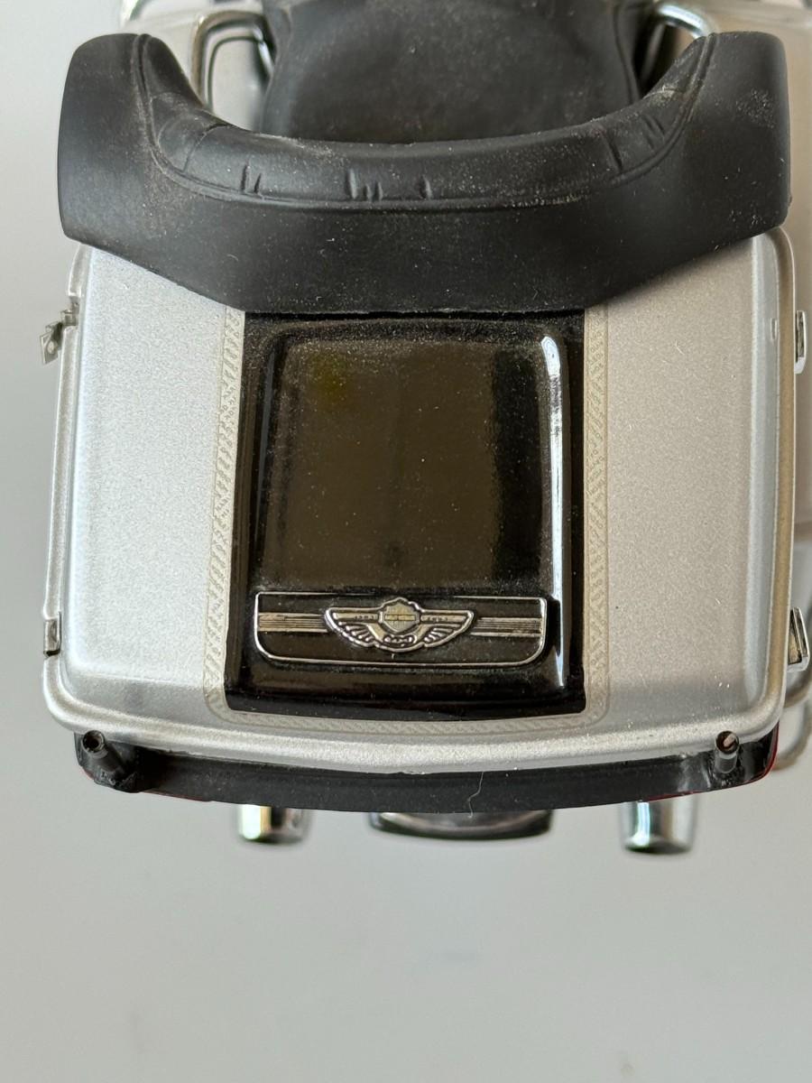 Silver die-cast scale model of a Harley-Davidson touring motorcycle. Highly detailed with chrome accents, saddle bags, and functional kickstand. Display or gift item.