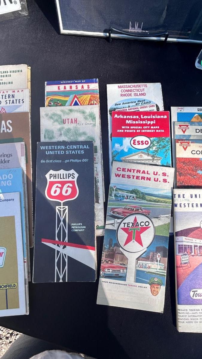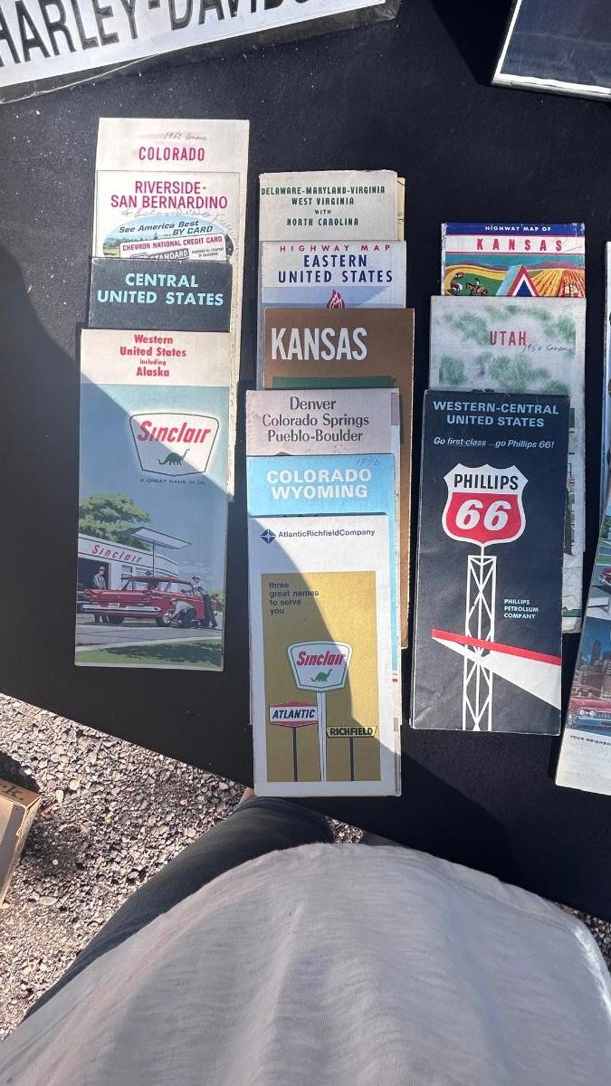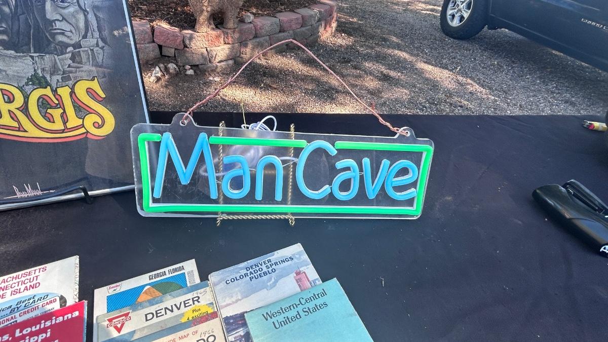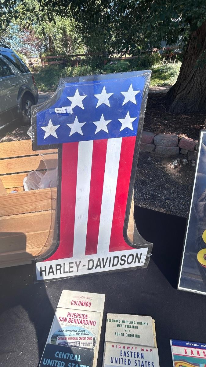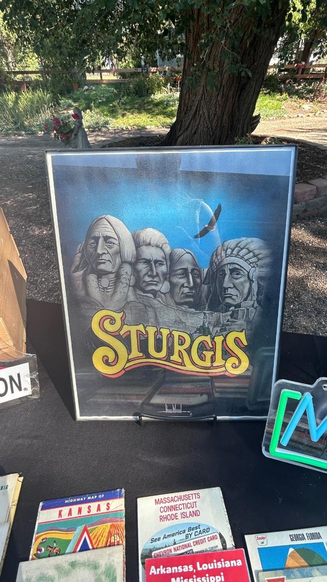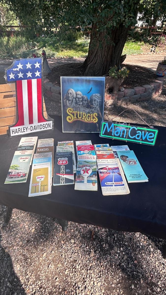 HARLEY DAVIDSON TIN SIGN, STURGIS FRAMED PRINT, VTG ROAD MAPS WITH MAN CAVE LED LIGHT