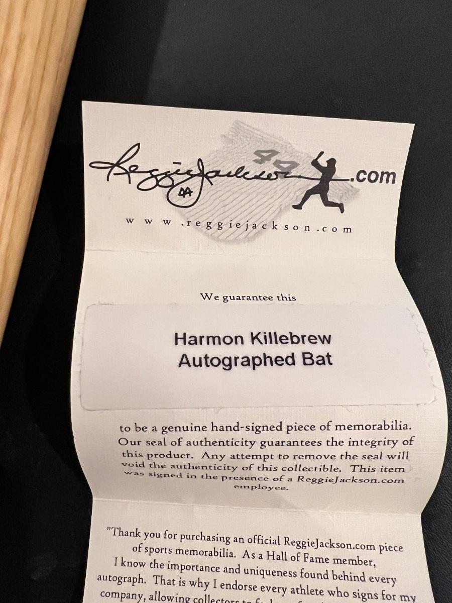 Harmon Killebrew Autographed Bat w Authenticity Certificate