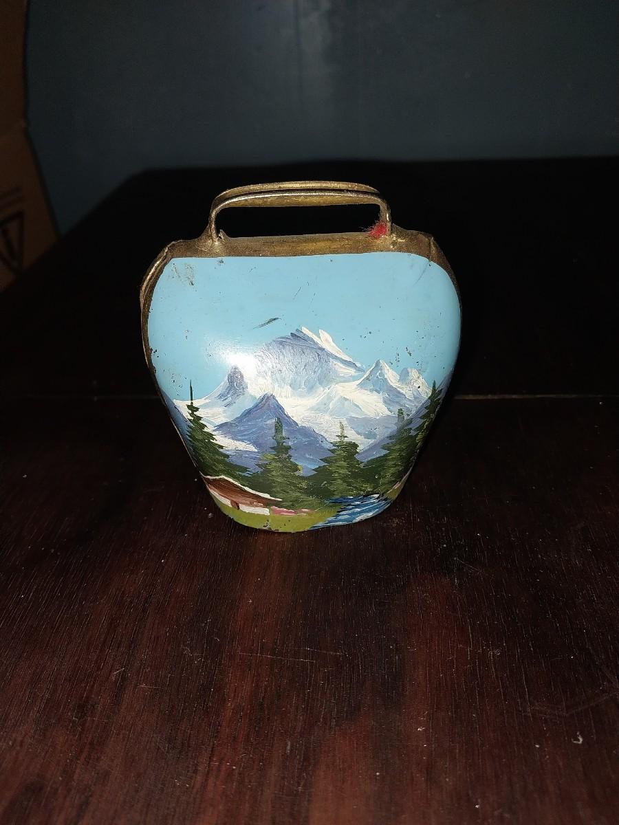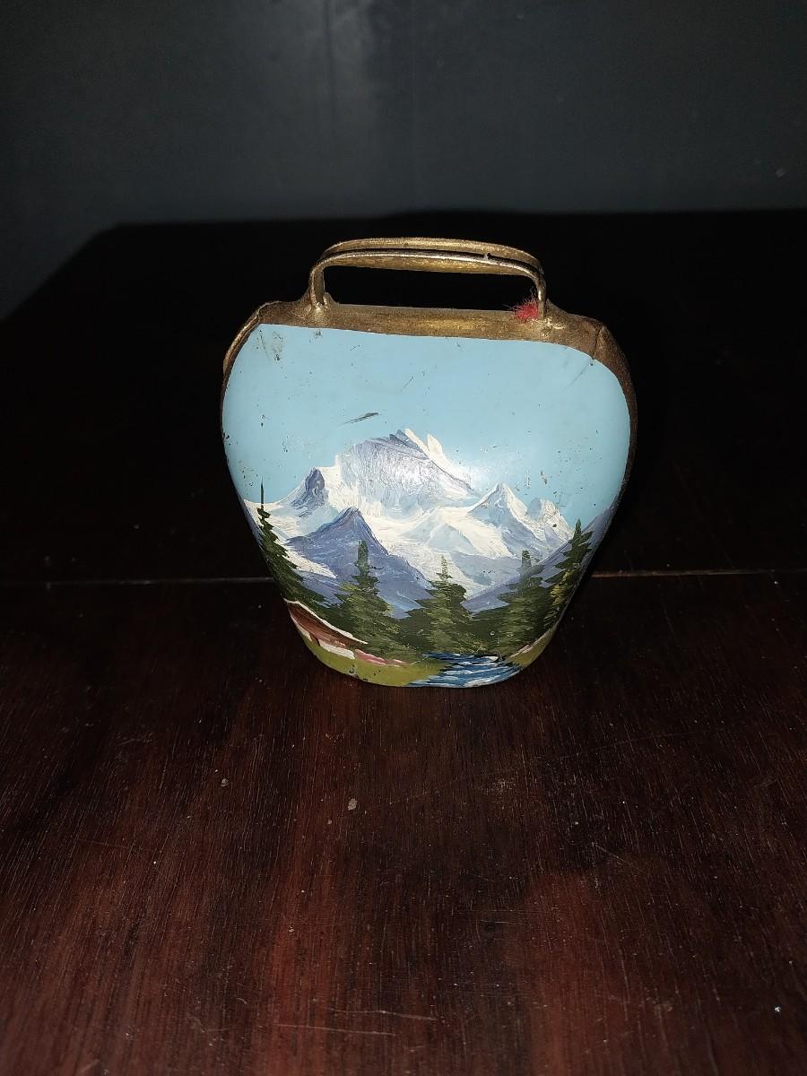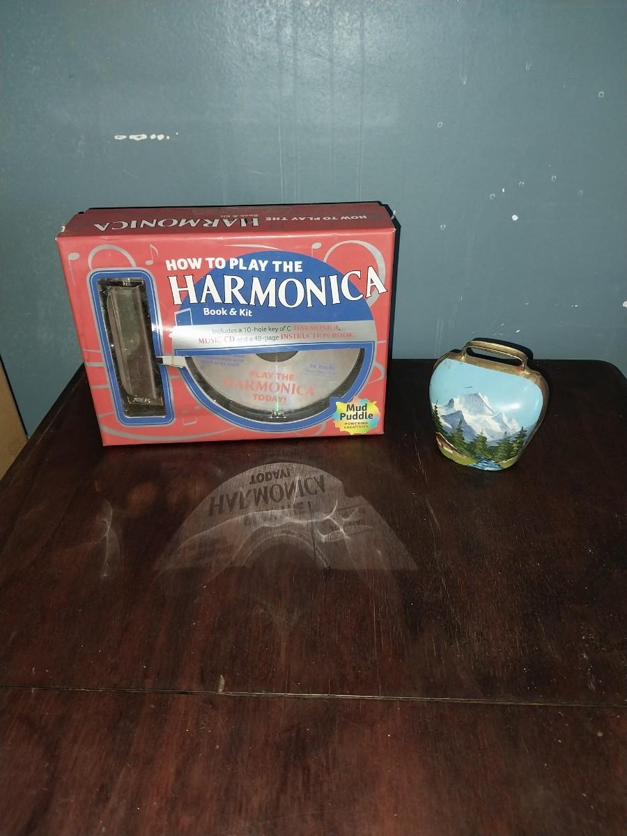 HARMONICA IN BOX AND PAINTED BRASS BELL