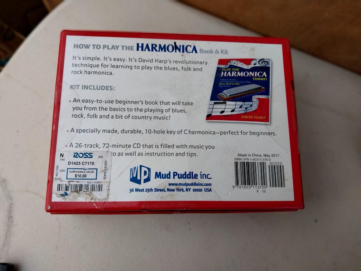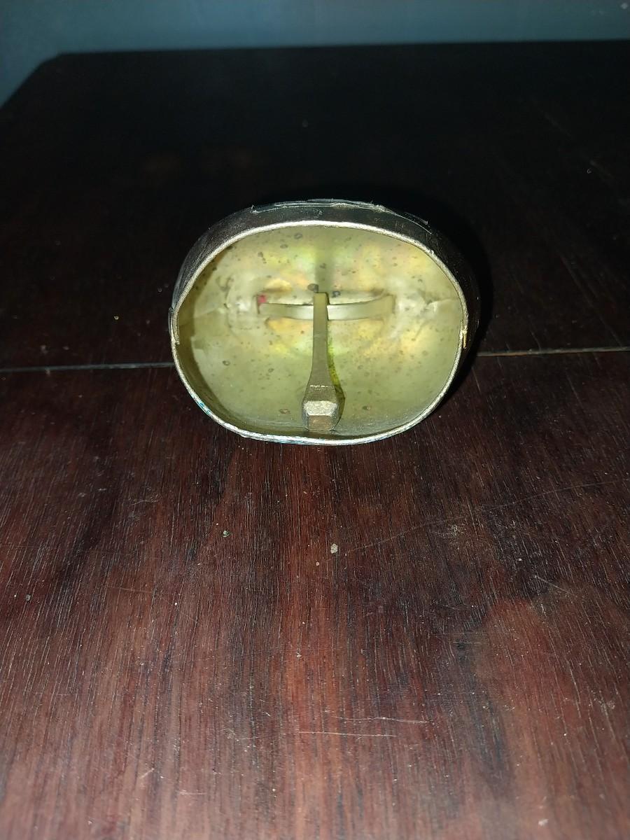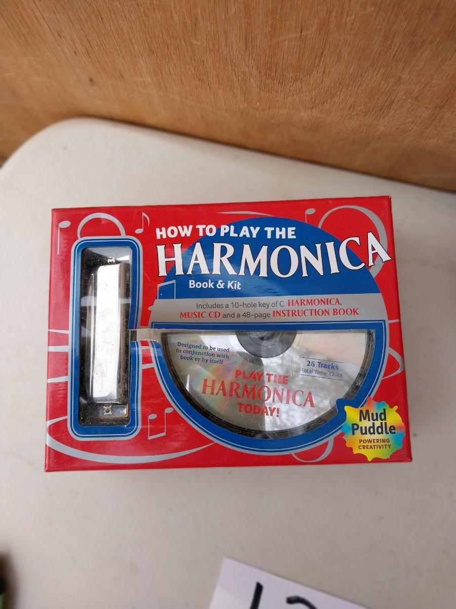 HARMONICA IN BOX AND PAINTED BRASS BELL