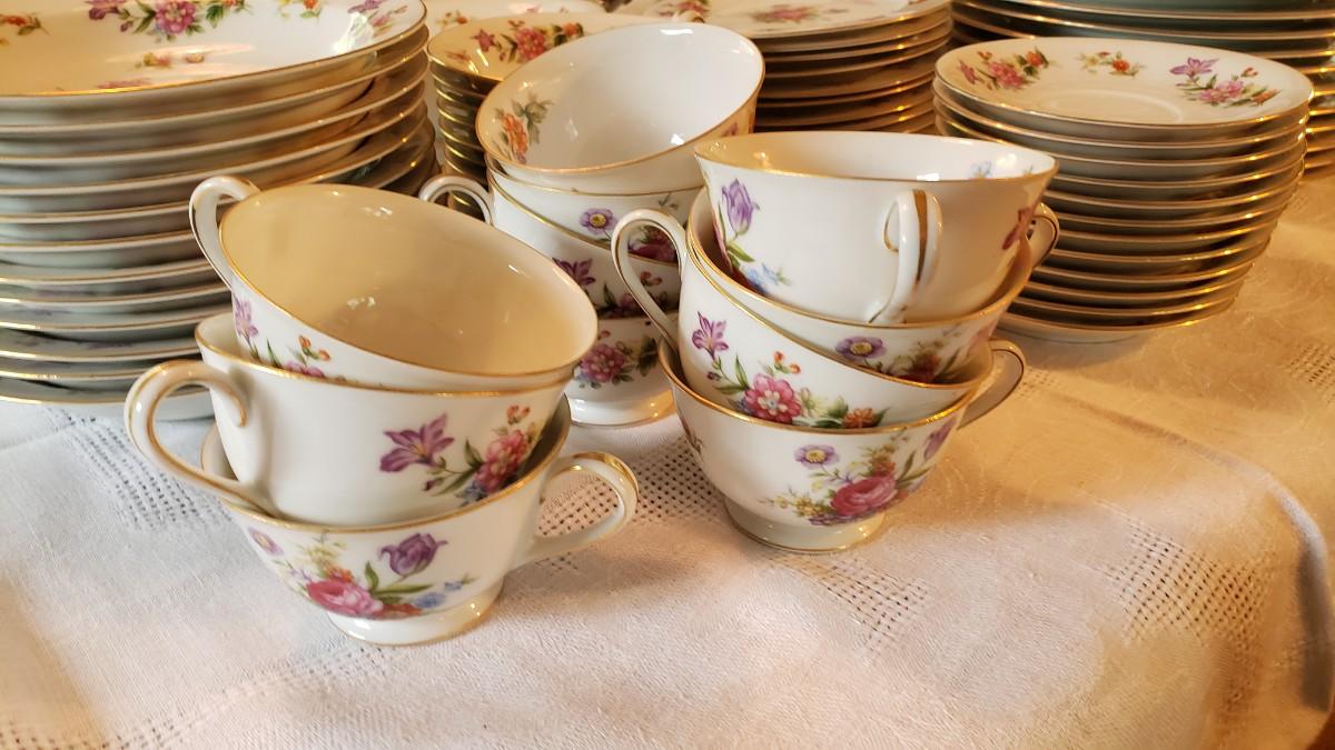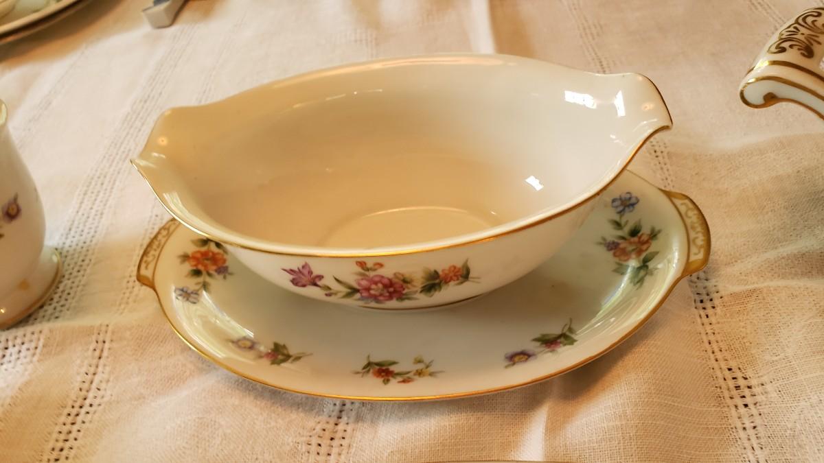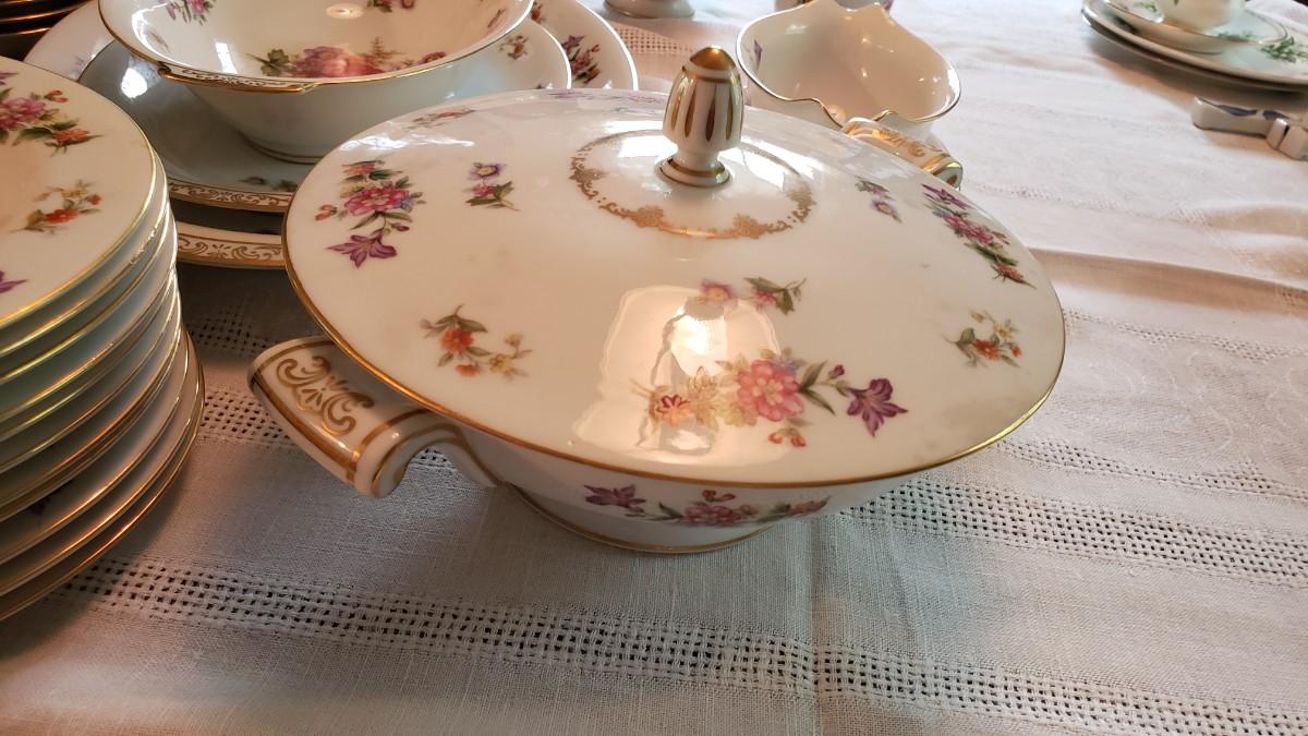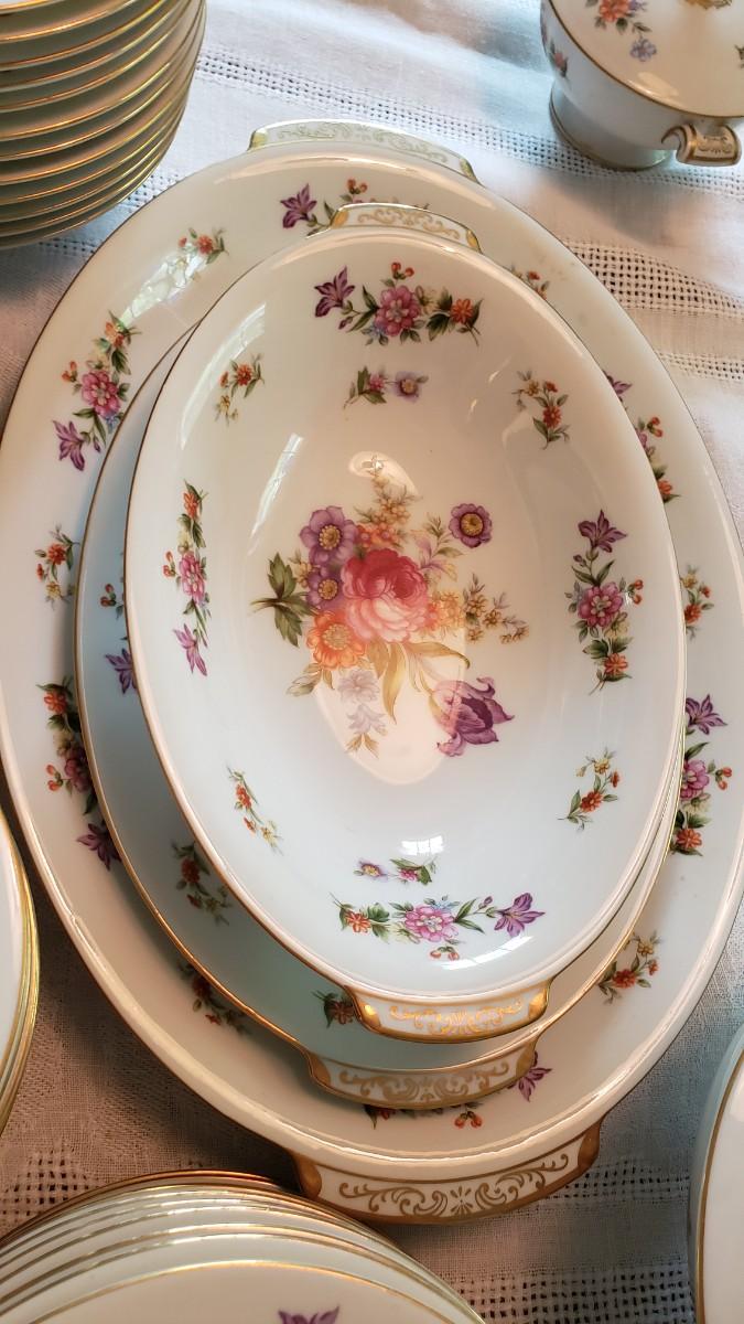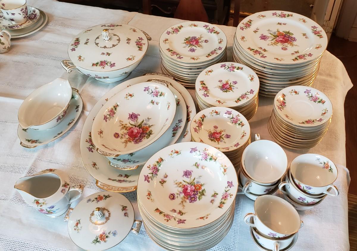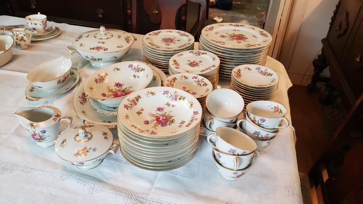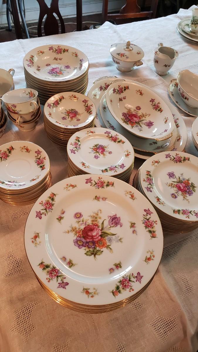 Service for 10 with one or two extra of some items. Gravy boat and serving dishes sugar bowl and creamer
