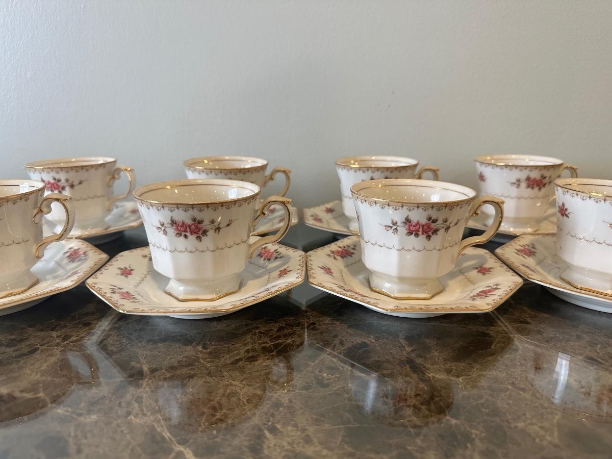 Harmony House “Rosette” fine china tea set, made in Japan. Includes eight cups with matching saucers, plus creamer and lidded sugar bowl. Features pink rose pattern with gold trim.