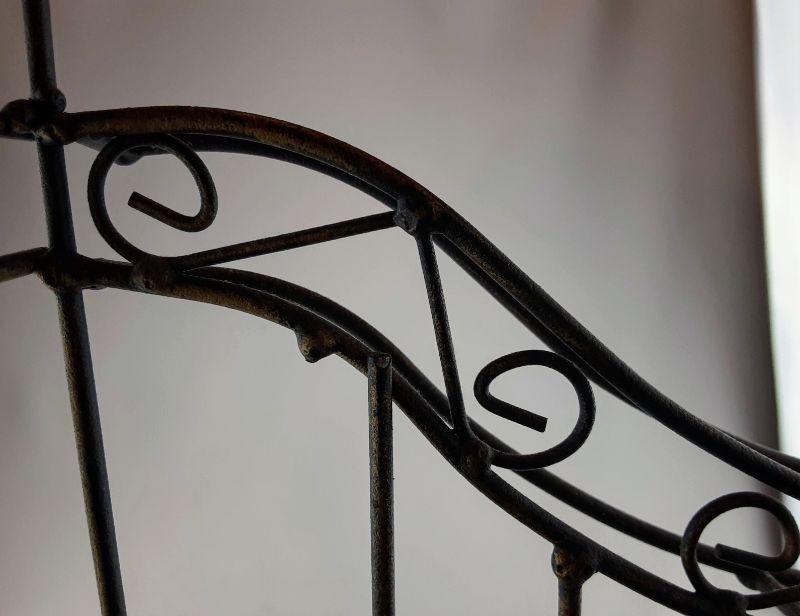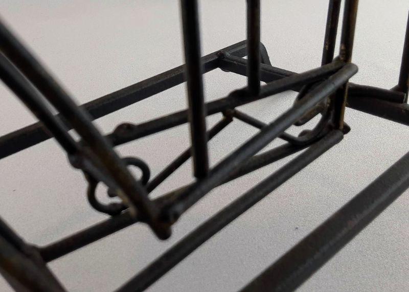 Metal harp with one top string not connected and one bottom string not connected. Measures 14.5in. tall by 12in.