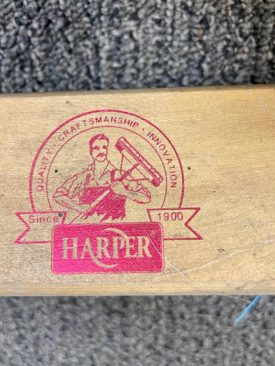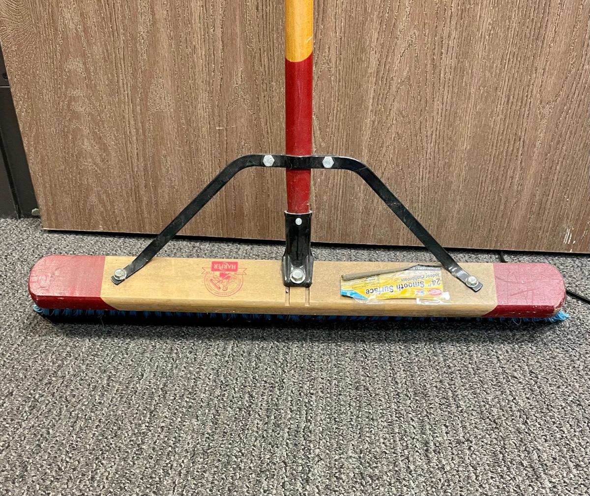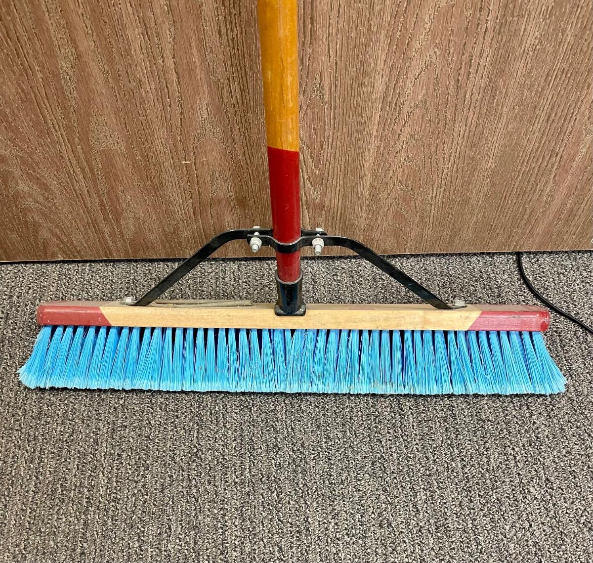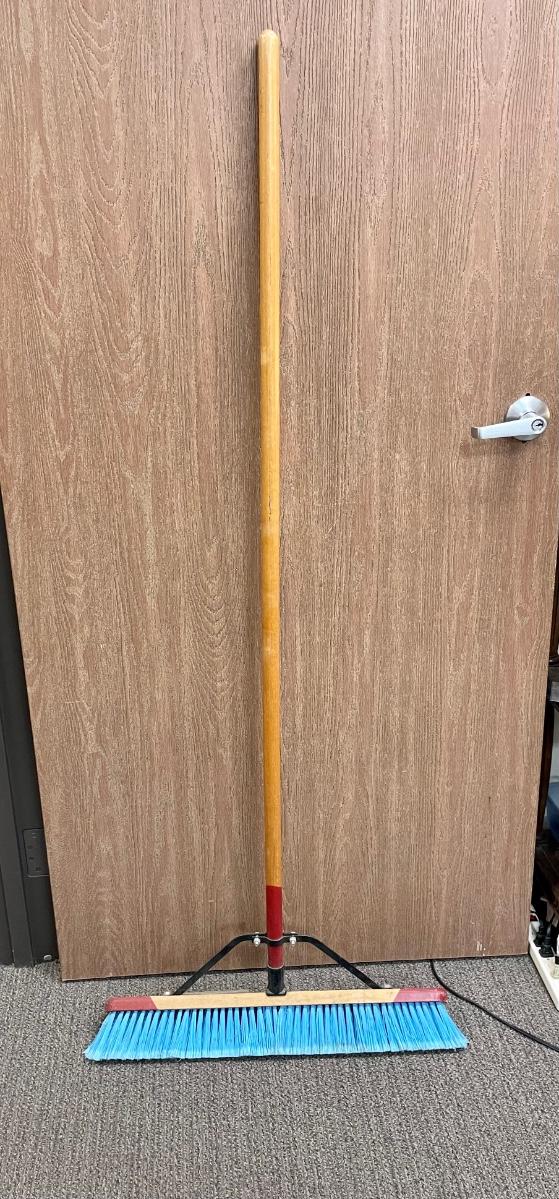 Wood handle and wood brush head 24” push broom, made by Harper.