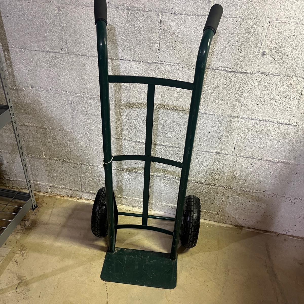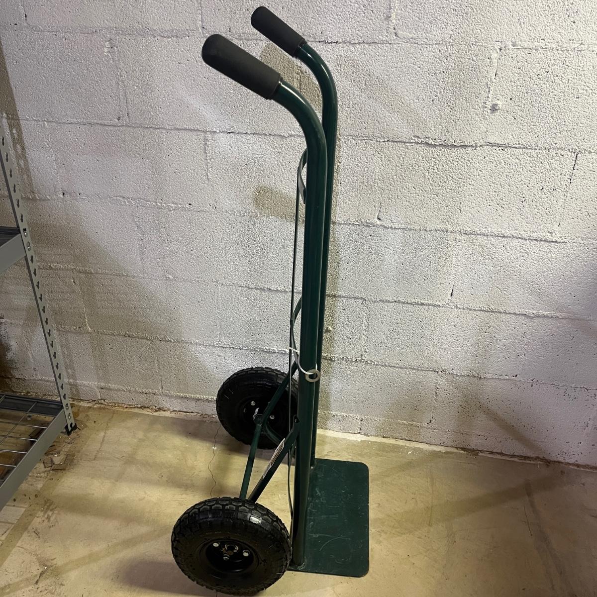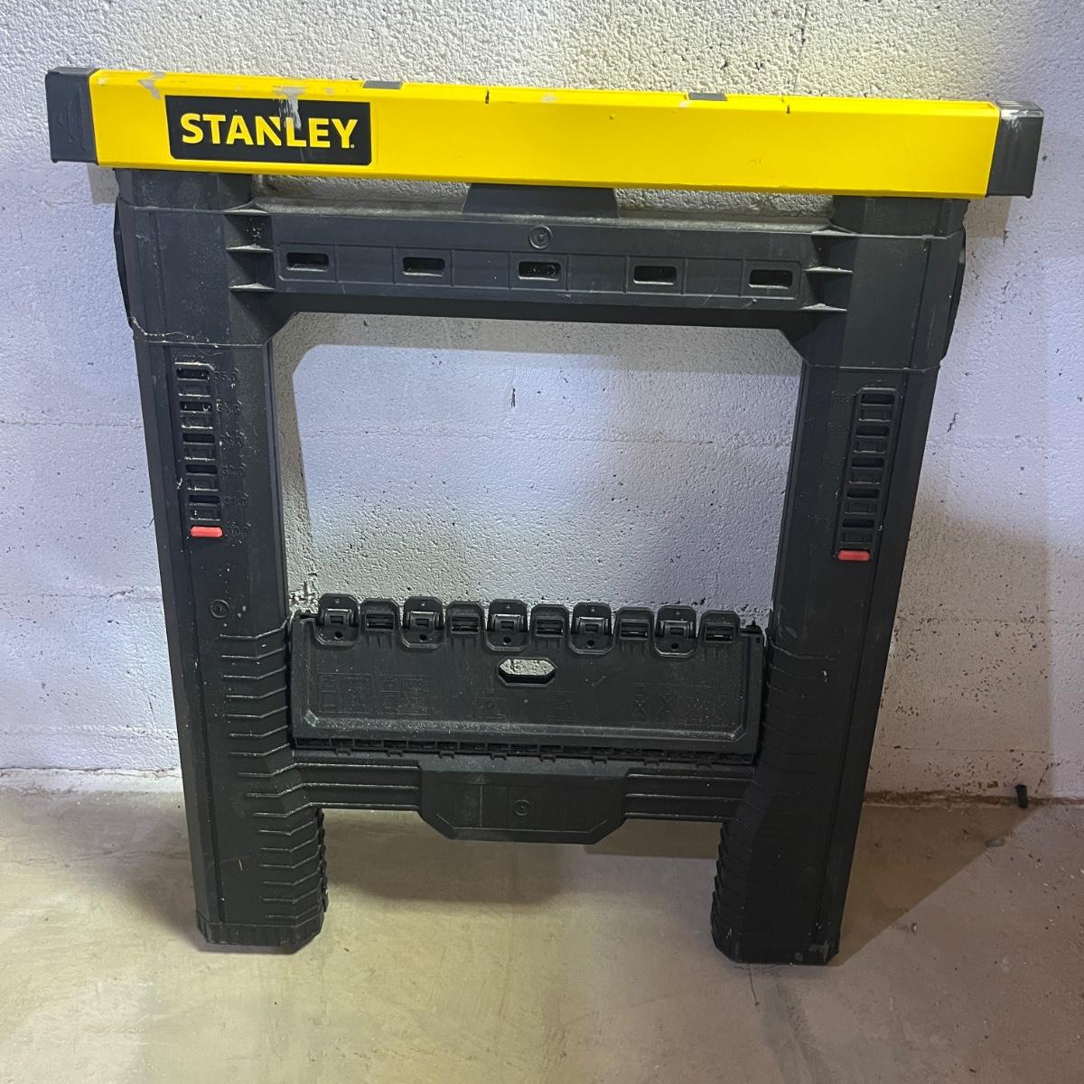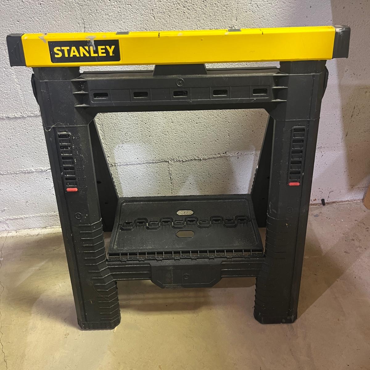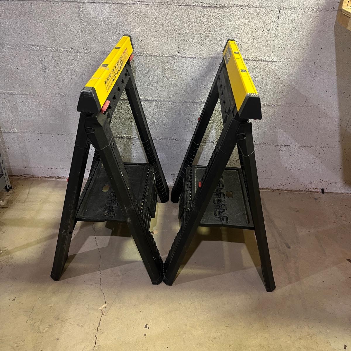 Lot includes two plastic folding Stanley sawhorses and a metal Harper hand truck with pneumatic tires. Hand truck measures 21" x 17" x 45"H. One sawhorse has two spots where someone has cut into the top, see pictures.
