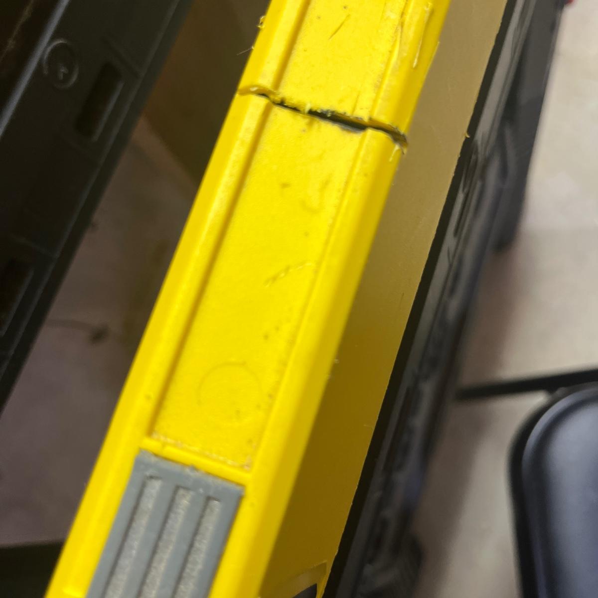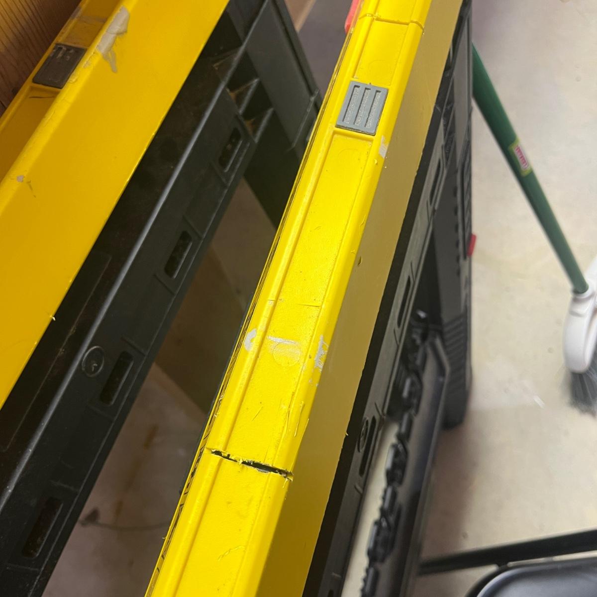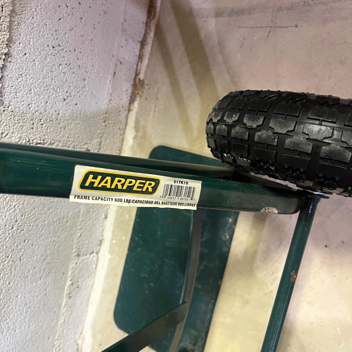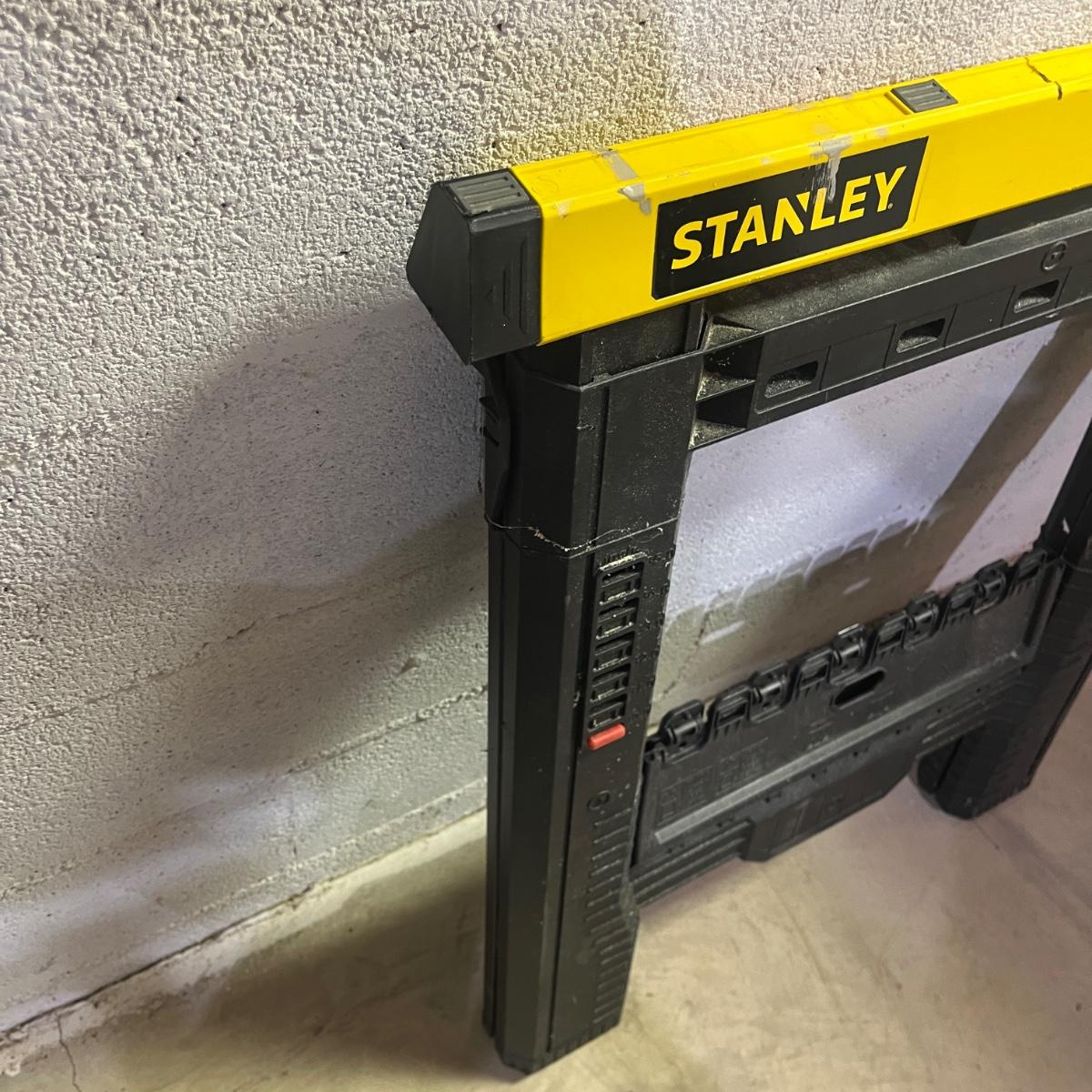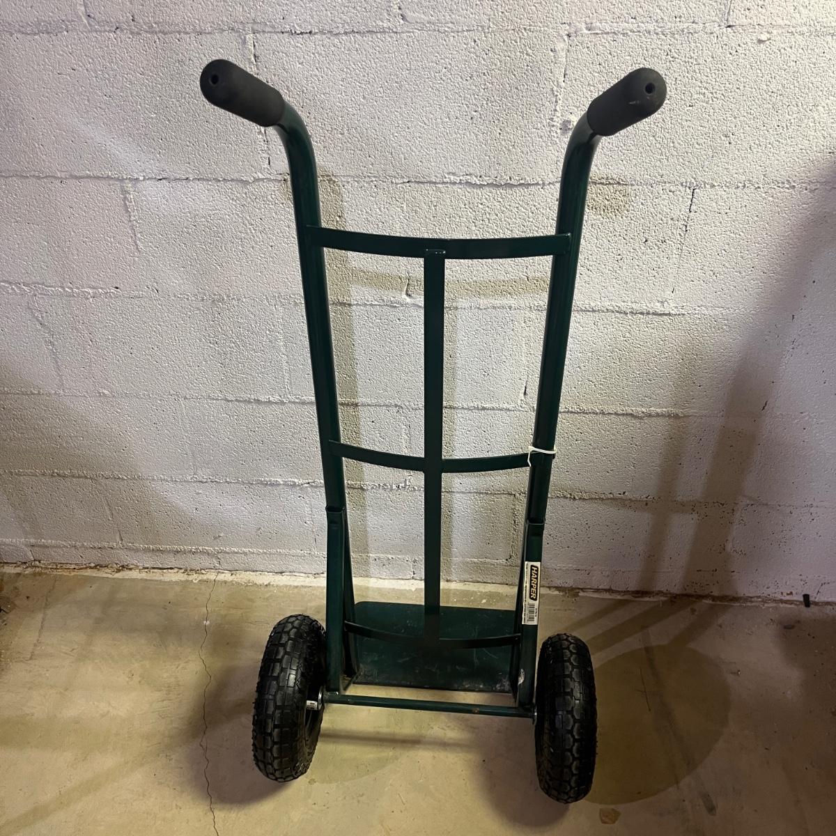 Lot includes two plastic folding Stanley sawhorses and a metal Harper hand truck with pneumatic tires. Hand truck measures 21" x 17" x 45"H. One sawhorse has two spots where someone has cut into the top, see pictures.