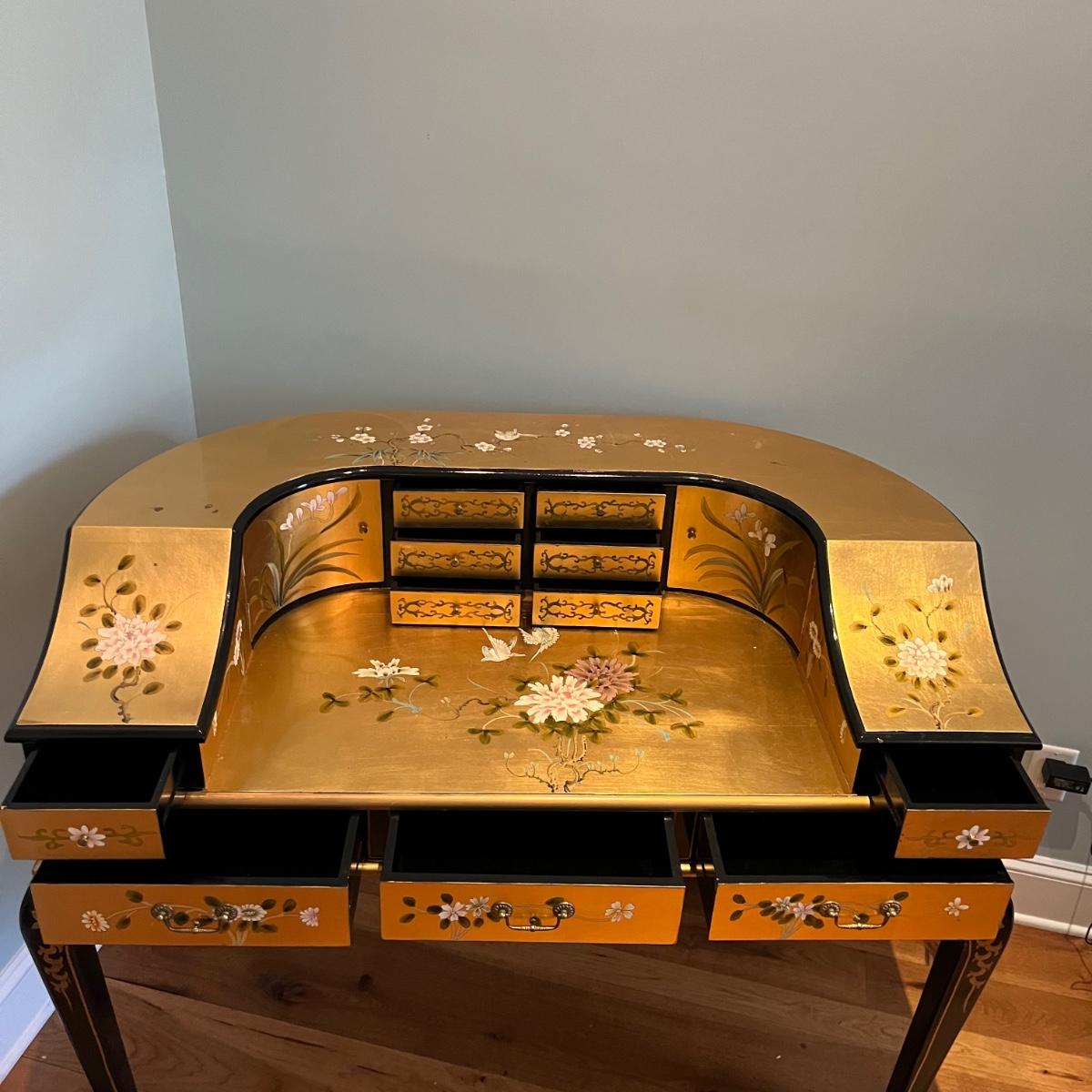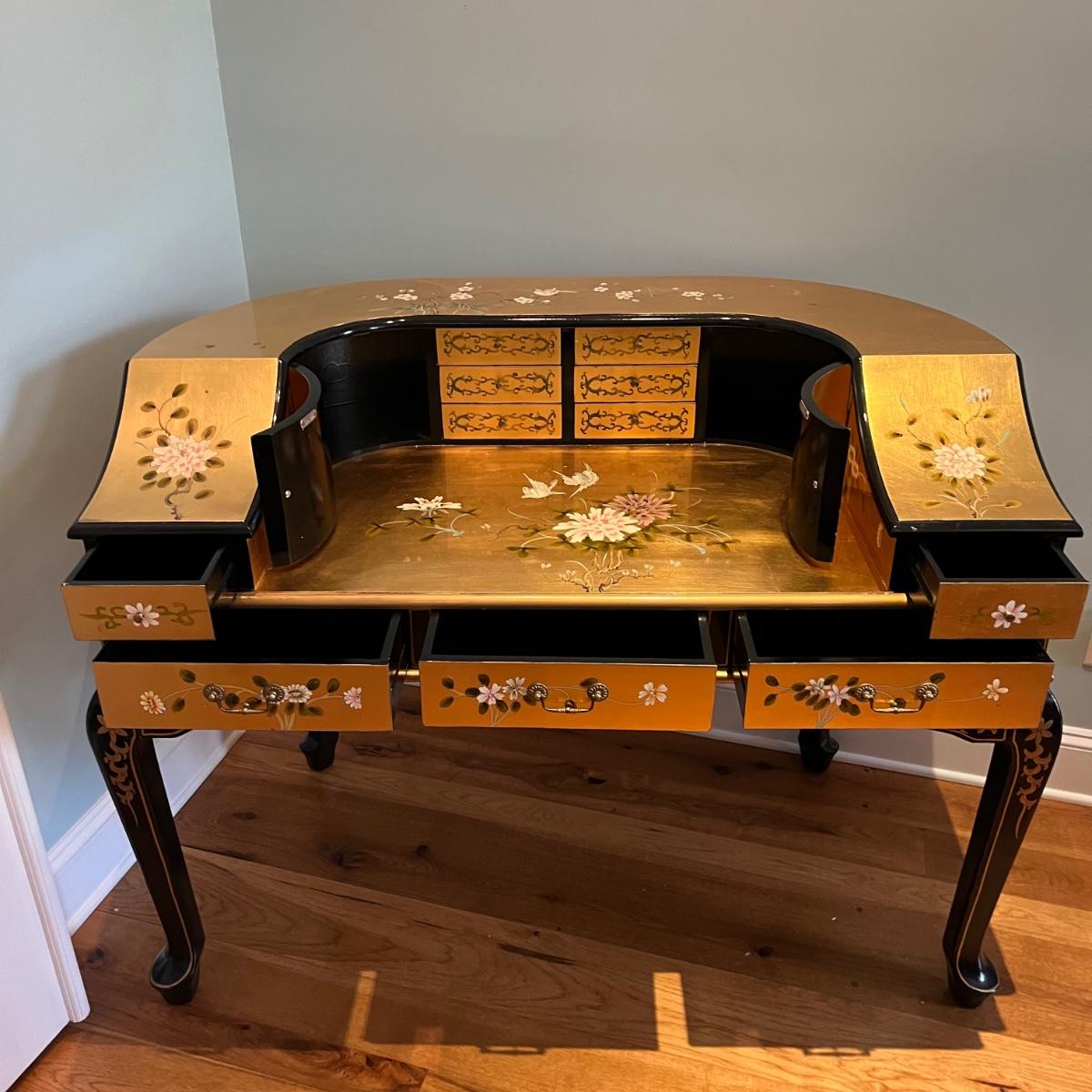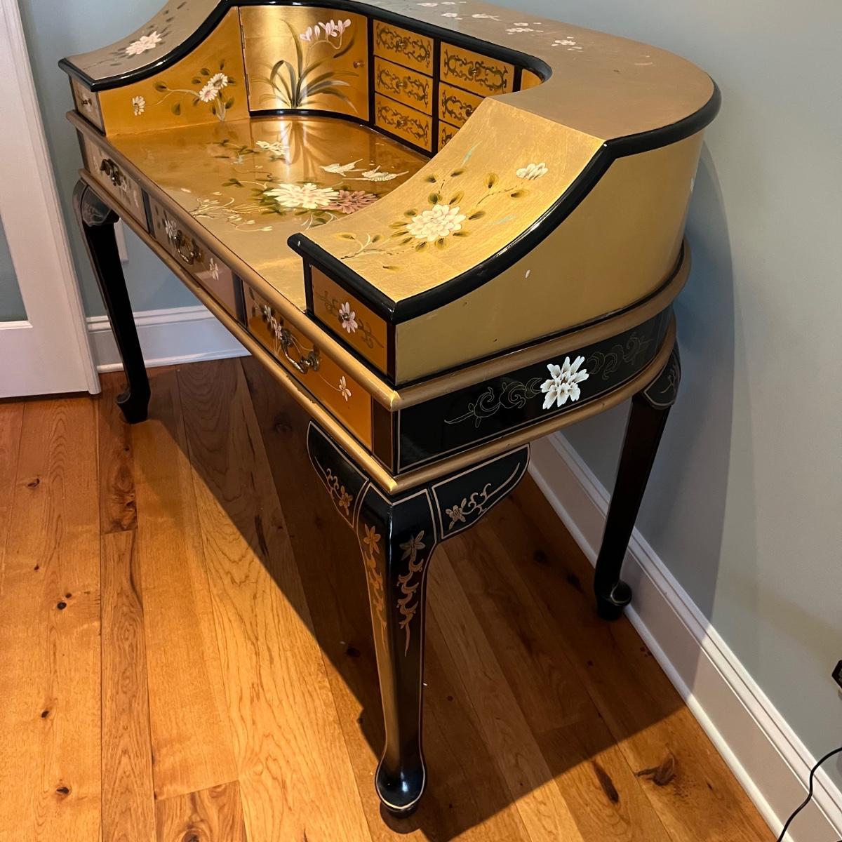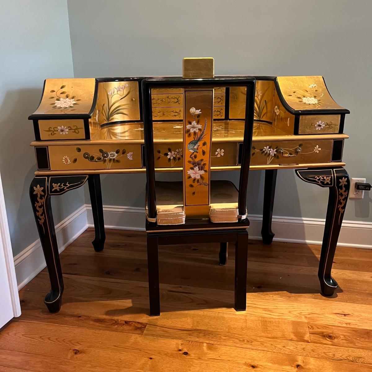 Lot contains a harpsichord style desk set that includes a desk that has 11 drawers and two compartments. Also includes a matching chair with a removable pad. Desk and chair appear to be laquer painted. Desk measures 49” x 27” x 38.5”H and chair measures 17” x 17” x 42”H with a seat height of 18.5”.