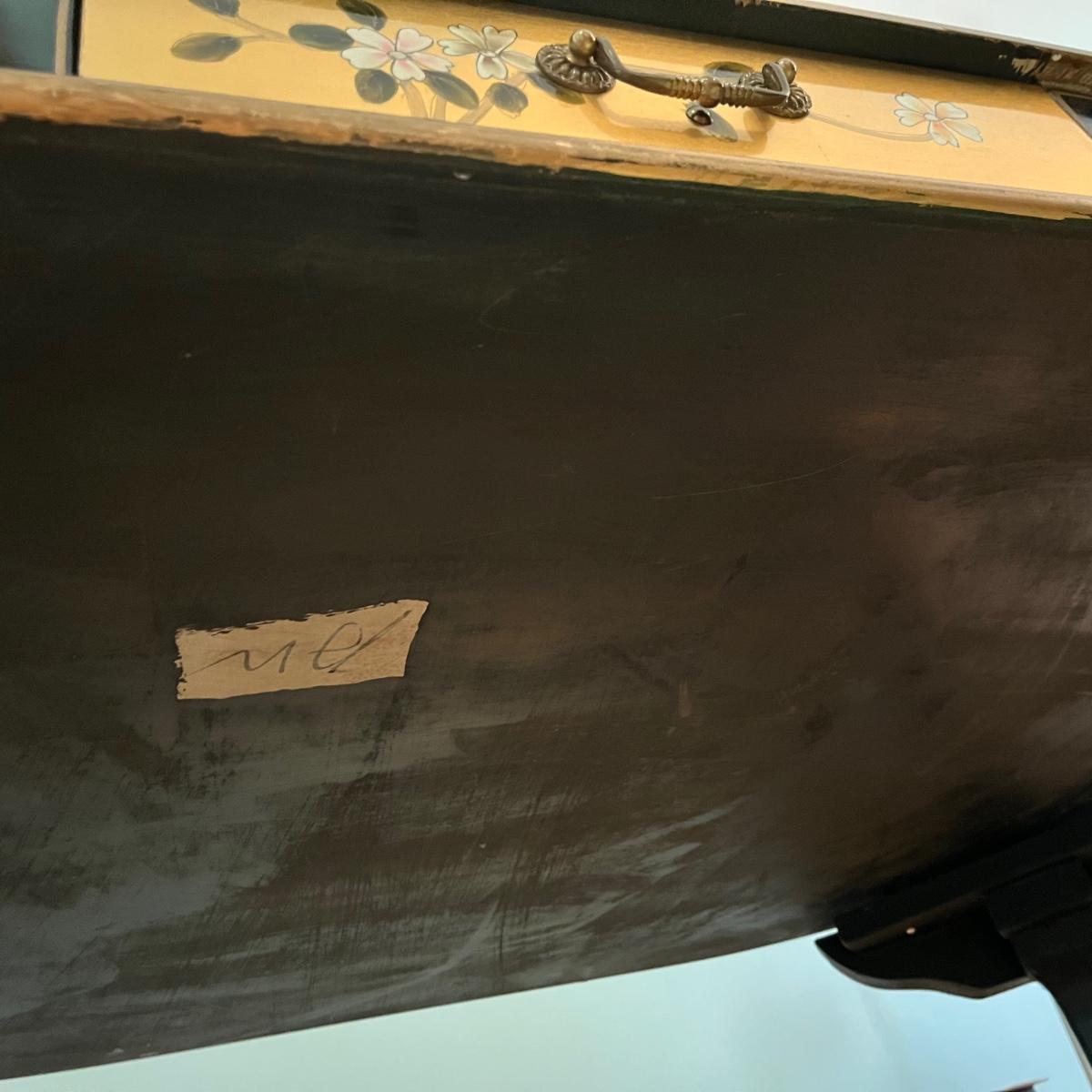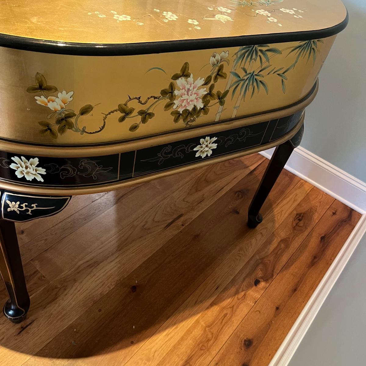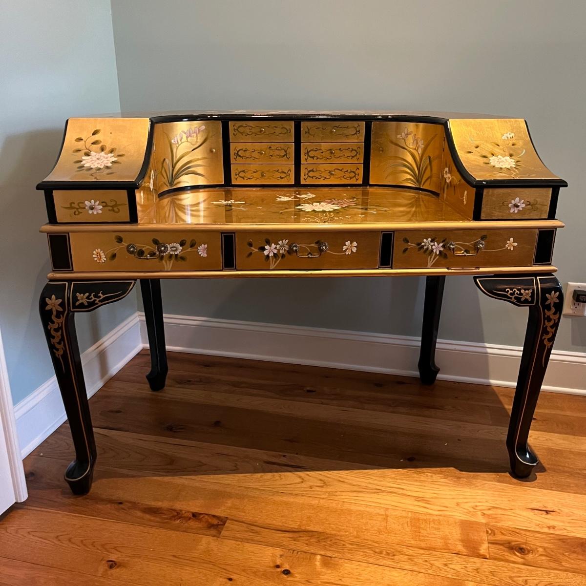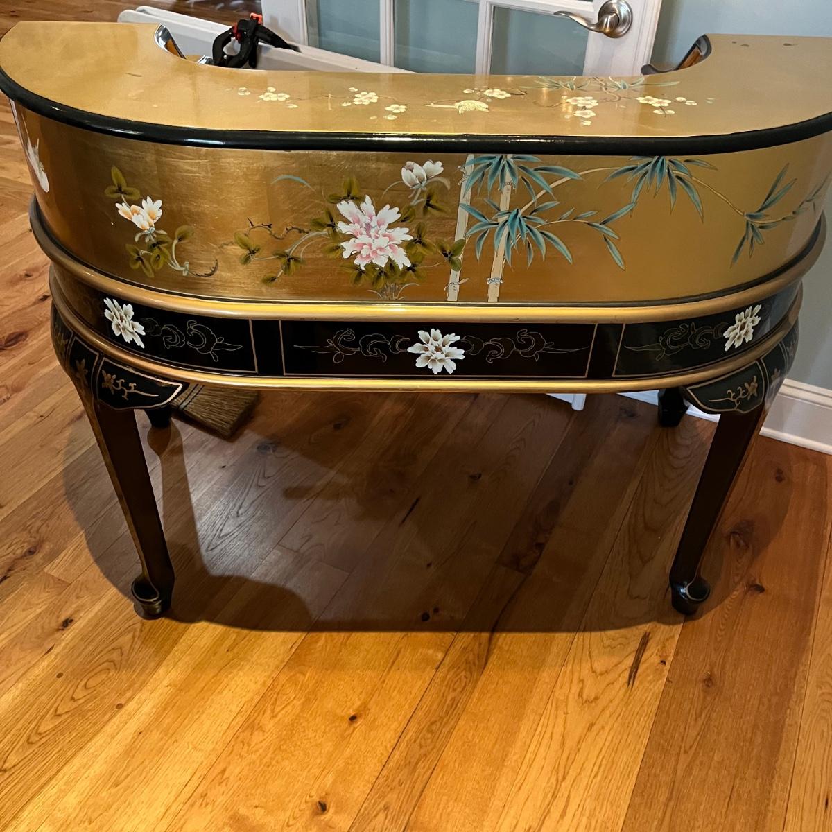 Lot contains a harpsichord style desk set that includes a desk that has 11 drawers and two compartments. Also includes a matching chair with a removable pad. Desk and chair appear to be laquer painted. Desk measures 49” x 27” x 38.5”H and chair measures 17” x 17” x 42”H with a seat height of 18.5”.