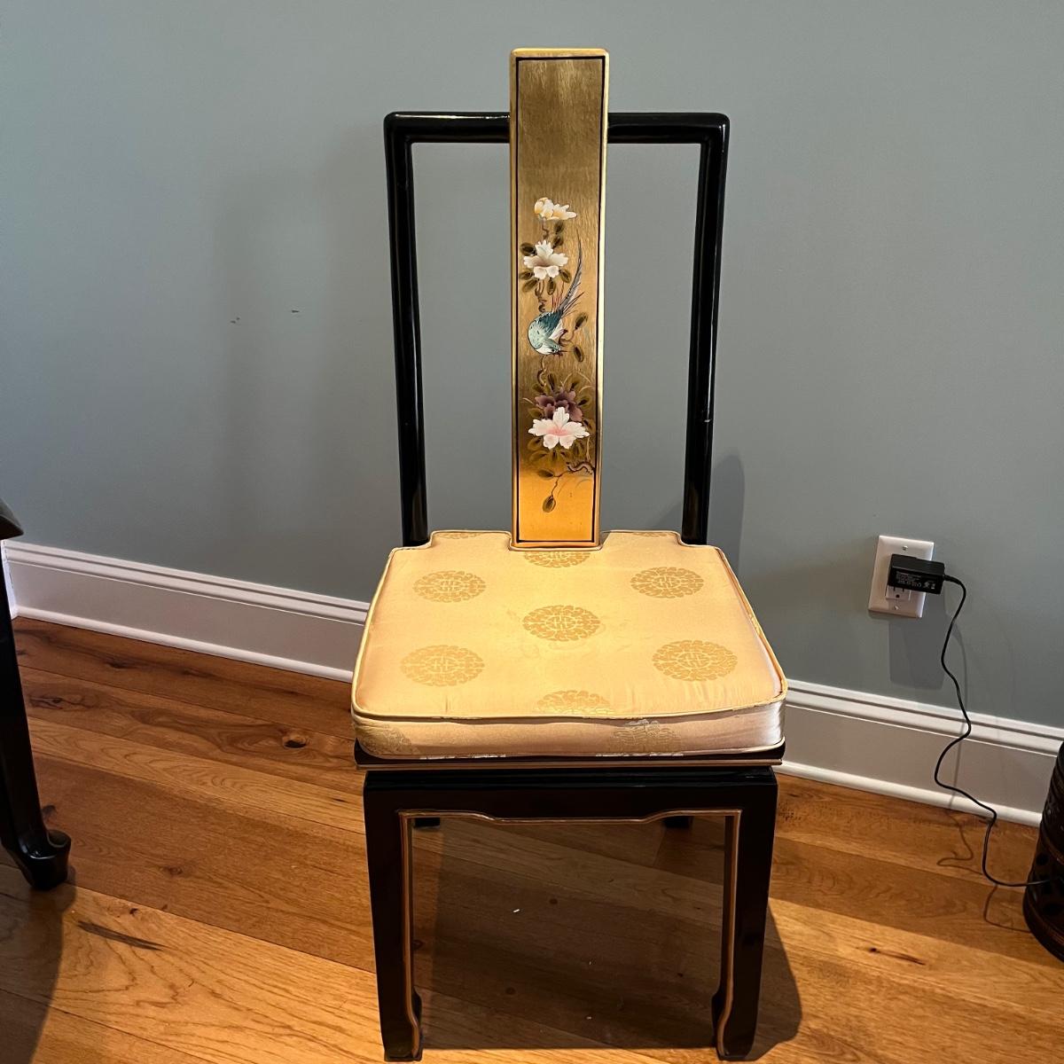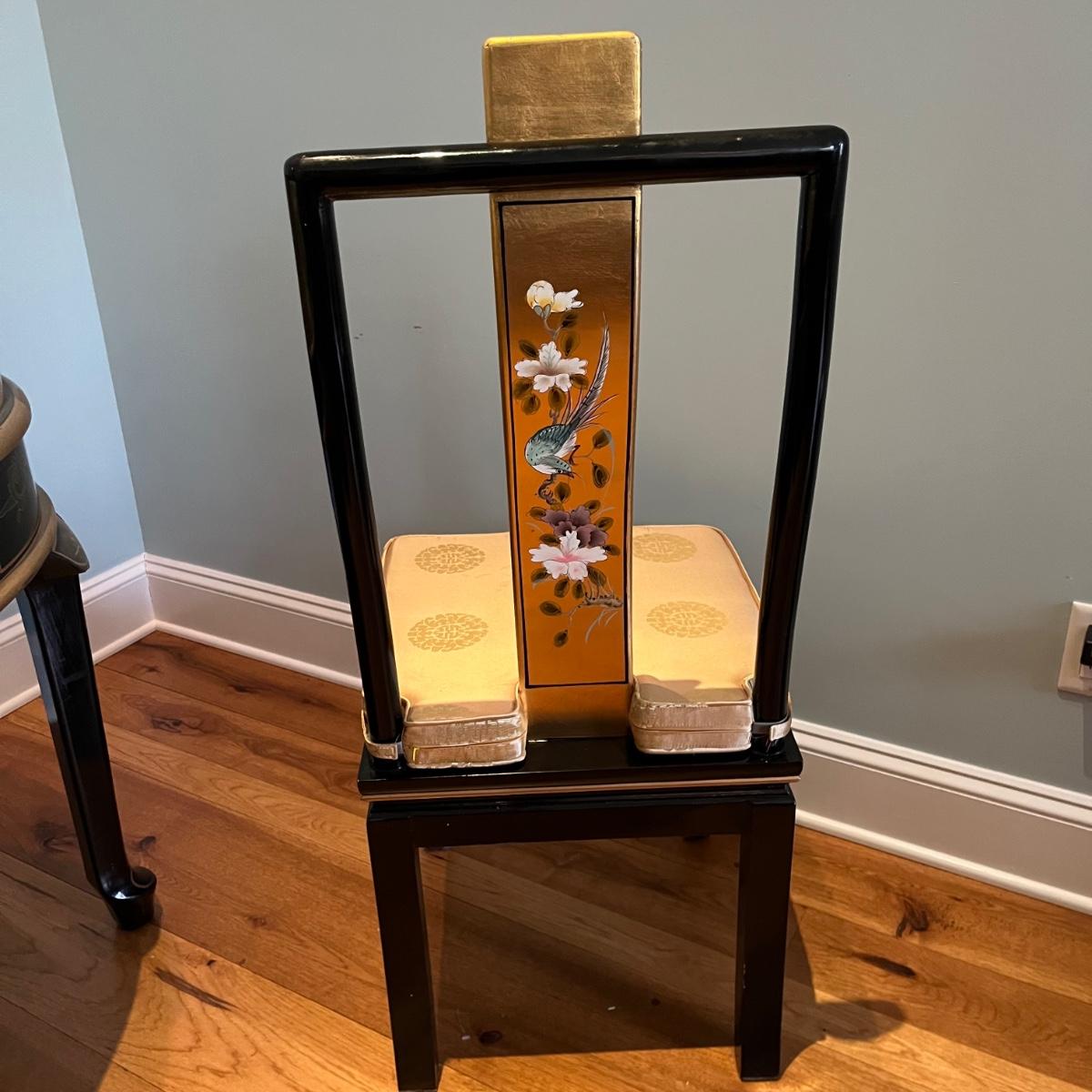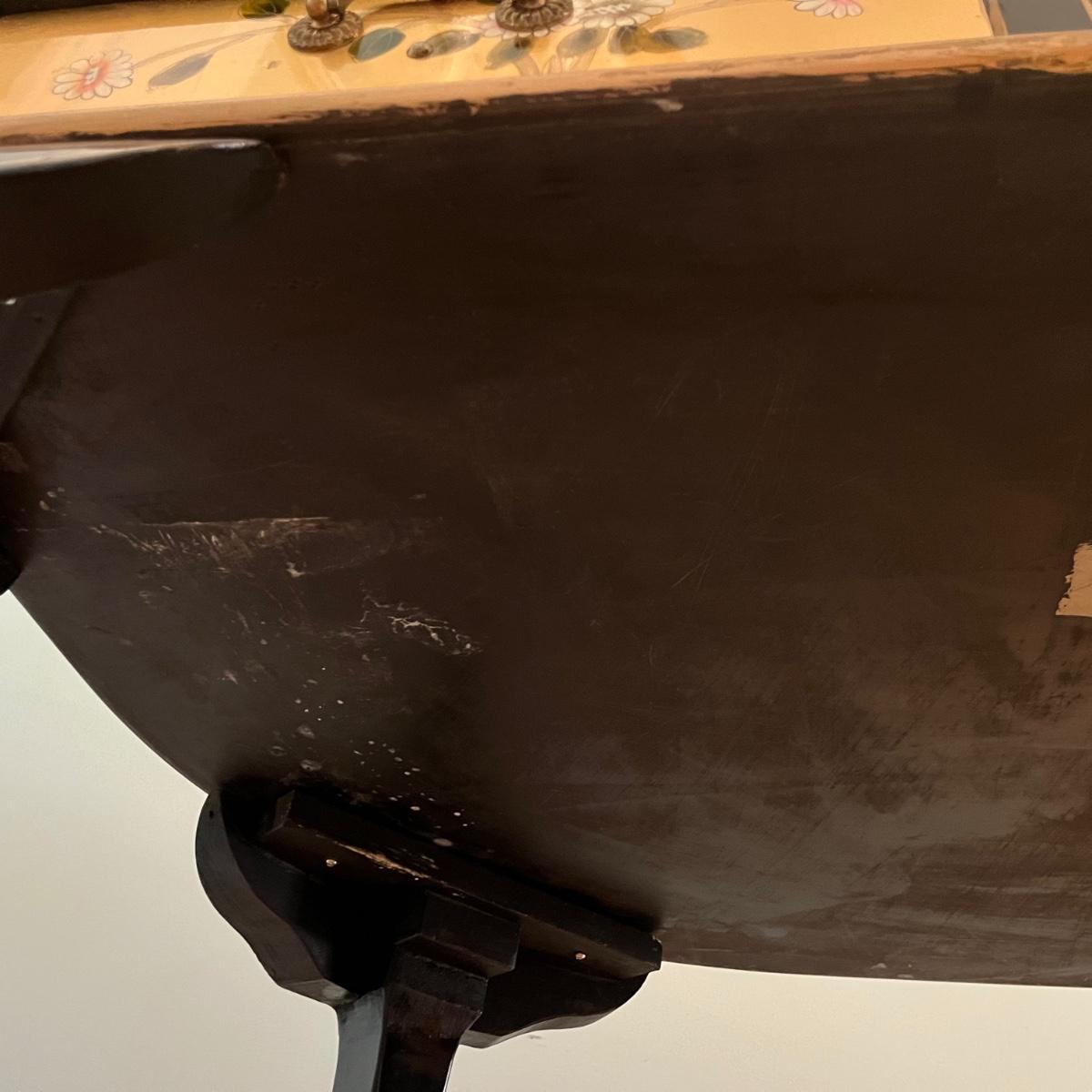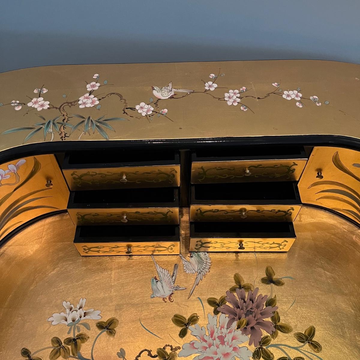 Lot contains a harpsichord style desk set that includes a desk that has 11 drawers and two compartments. Also includes a matching chair with a removable pad. Desk and chair appear to be laquer painted. Desk measures 49” x 27” x 38.5”H and chair measures 17” x 17” x 42”H with a seat height of 18.5”.