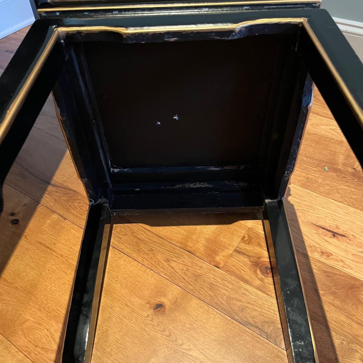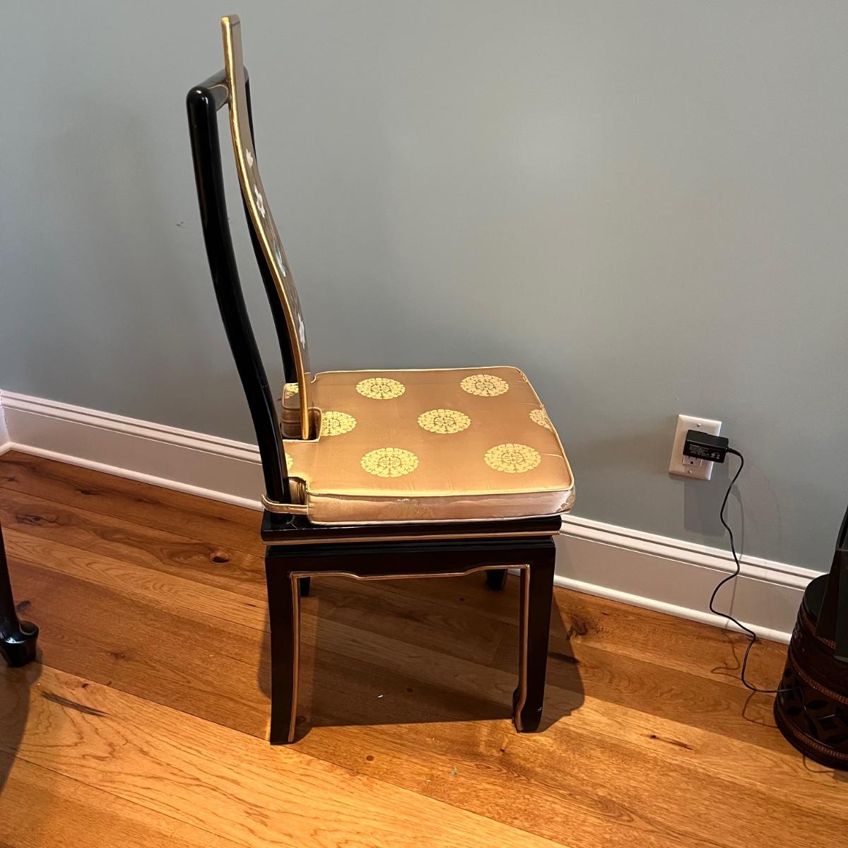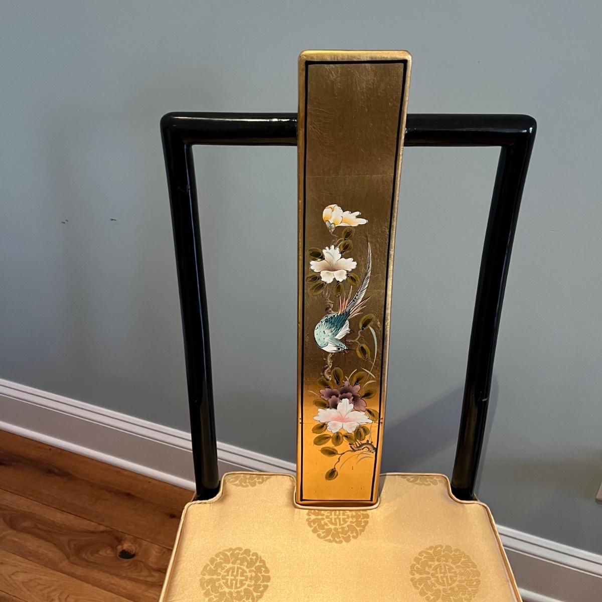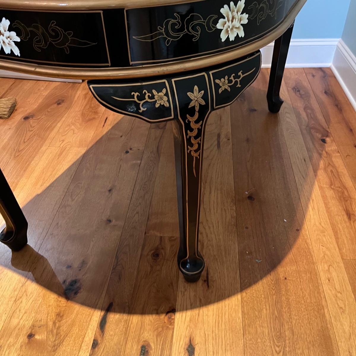 Lot contains a harpsichord style desk set that includes a desk that has 11 drawers and two compartments. Also includes a matching chair with a removable pad. Desk and chair appear to be laquer painted. Desk measures 49” x 27” x 38.5”H and chair measures 17” x 17” x 42”H with a seat height of 18.5”.