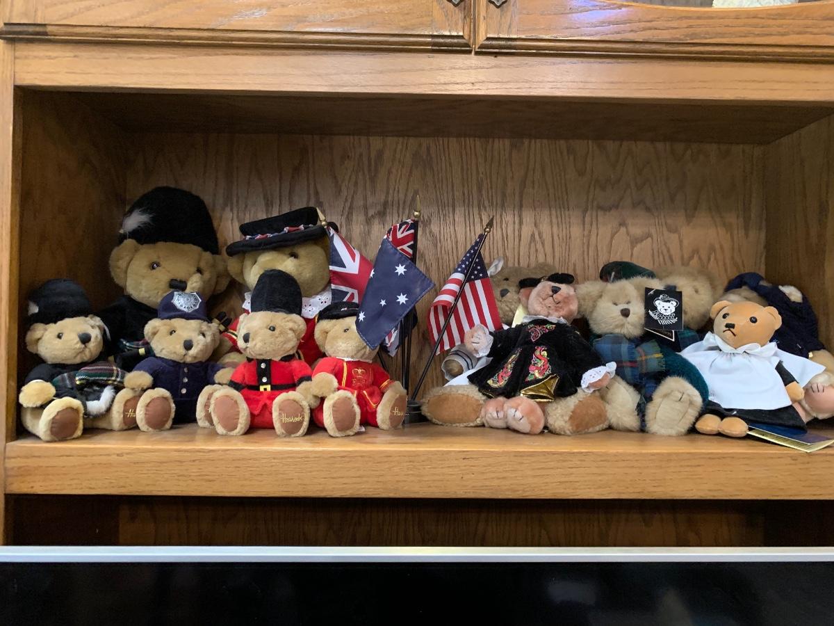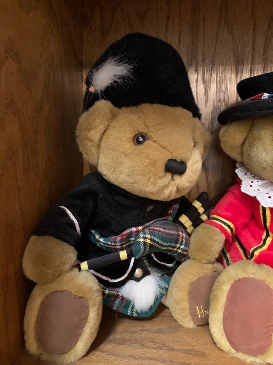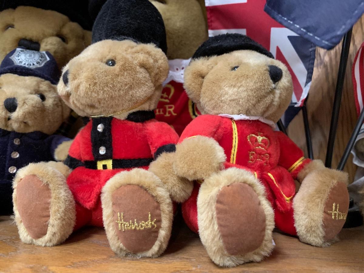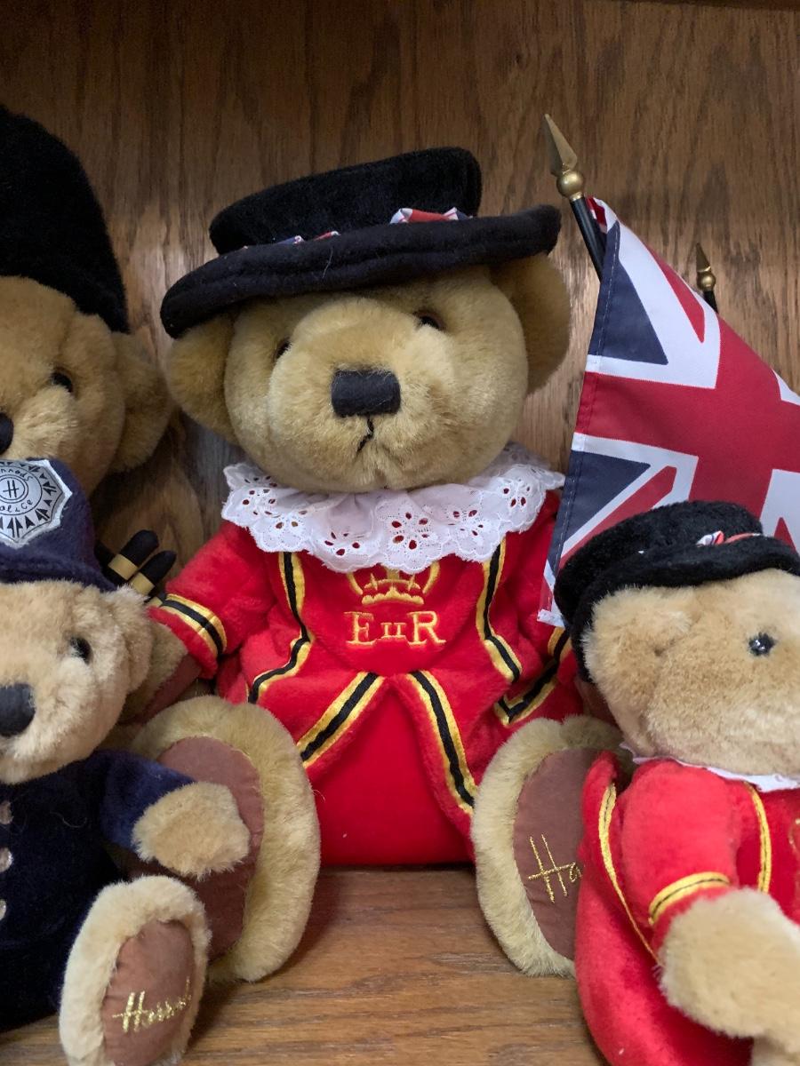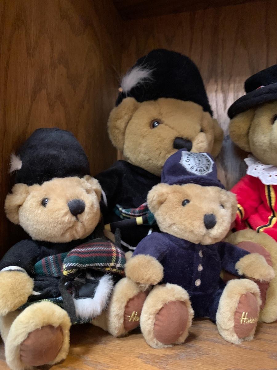 Harrods Bear collection (6 in total), and 6 misc additional bears and one small flag stand