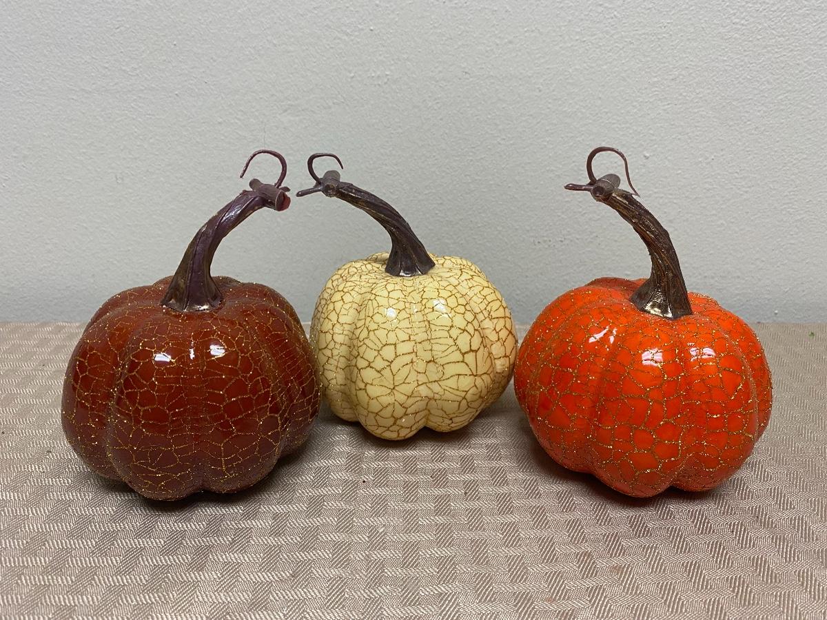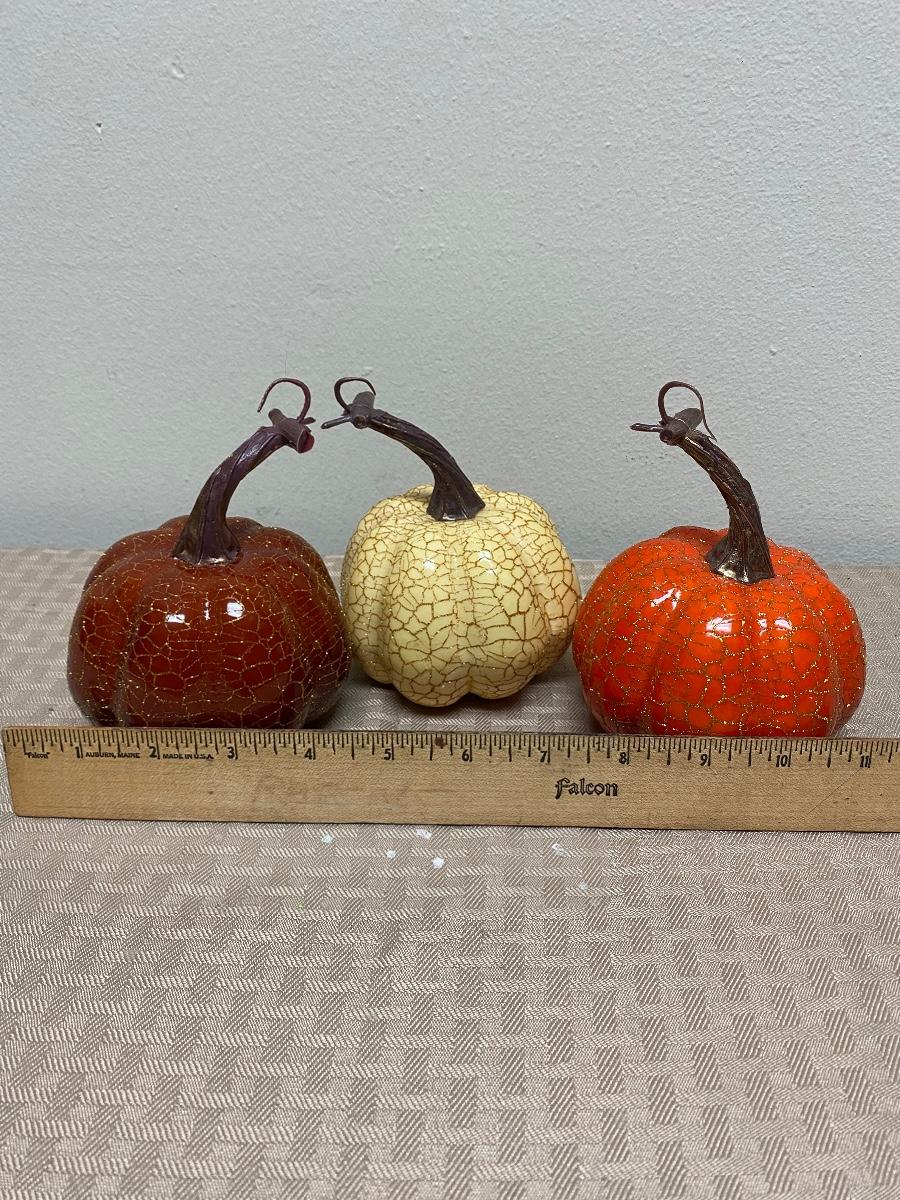 Set of 3 Plastic Crackle Finish Autumn Fall Thanksgiving Halloween Pumpkins. Crackle finish has a bit of glitter for sparkle. Good condition. Under 4" size.