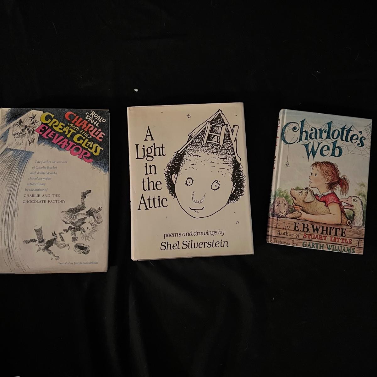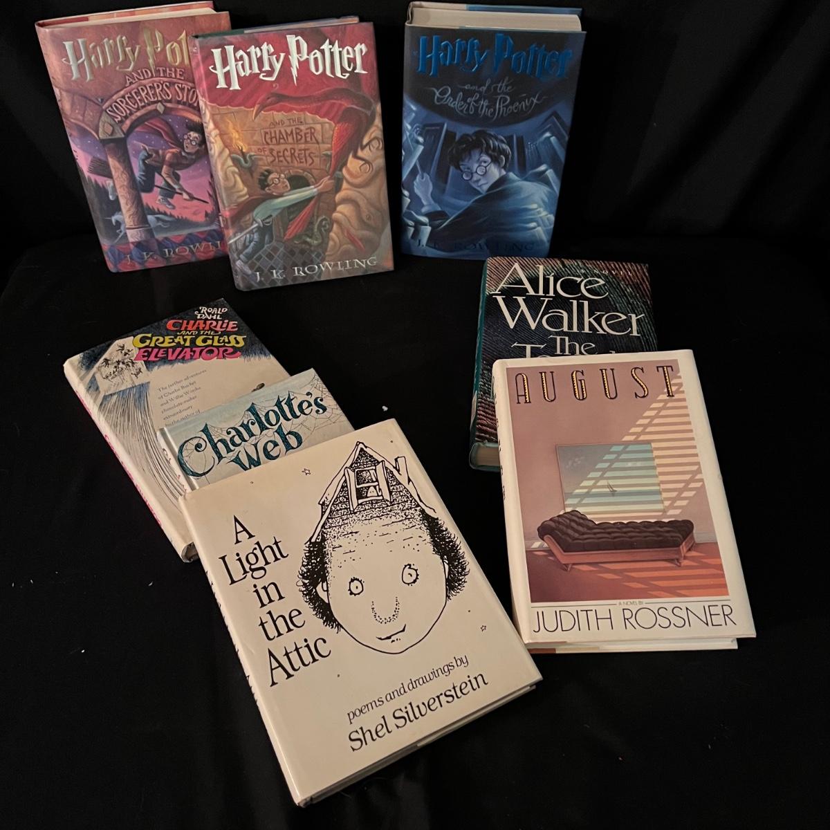 Eight classic books. Harry Potter and the Chamber of Secrets, Harry Potter and the Order of the Phoenix, and Harry Potter and the Sorcerer’s Stone. Also, August, by Judith Rosner, Alice Walker, The Temple of My Family, Charlotte“˜s Web, by EB White, A Light in the Attic by Shel Silverstein, and Charlie, and the Great Glass Elevator by Ronald Dahl.