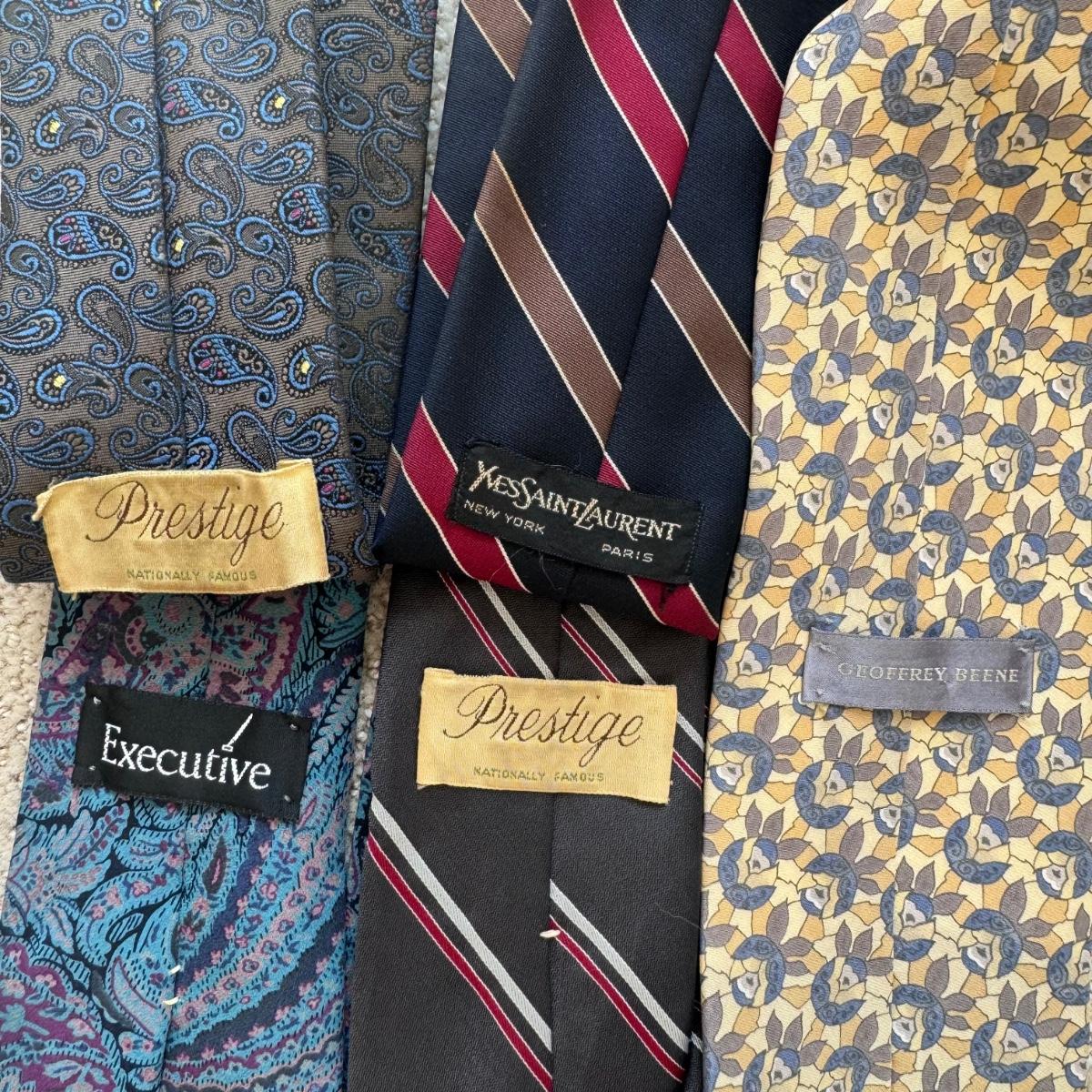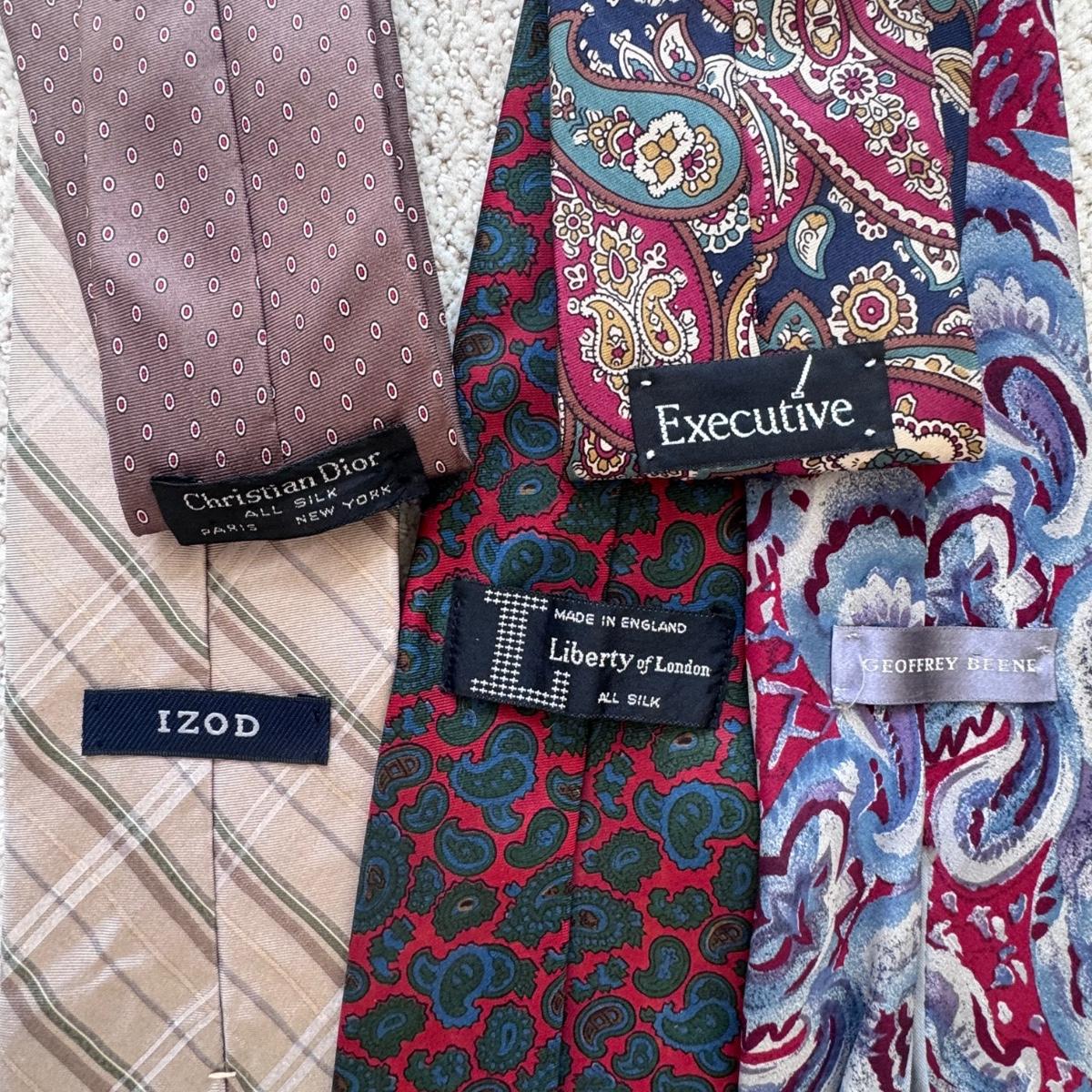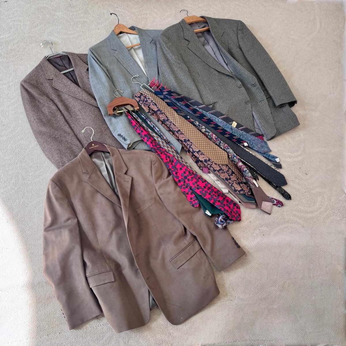 This lot includes four men’s suit jackets from Hart Schaffner & Marx, Jefferson, Chereskin and Tailor’s Row by Deansmith. All suit jackets have no size listed, but they appear to all be size XL and measure an average of 19” across back shoulders and center back of 31”. It also includes over twenty men’s ties. You’ll find ties that are 100% silk or 100% wool all from the following brands: King’s Road Shop, Izod, Christian Dior, Liberty of London, Geffrey Beene, Prestige, and more. See photos for other brands. Shipping available.
