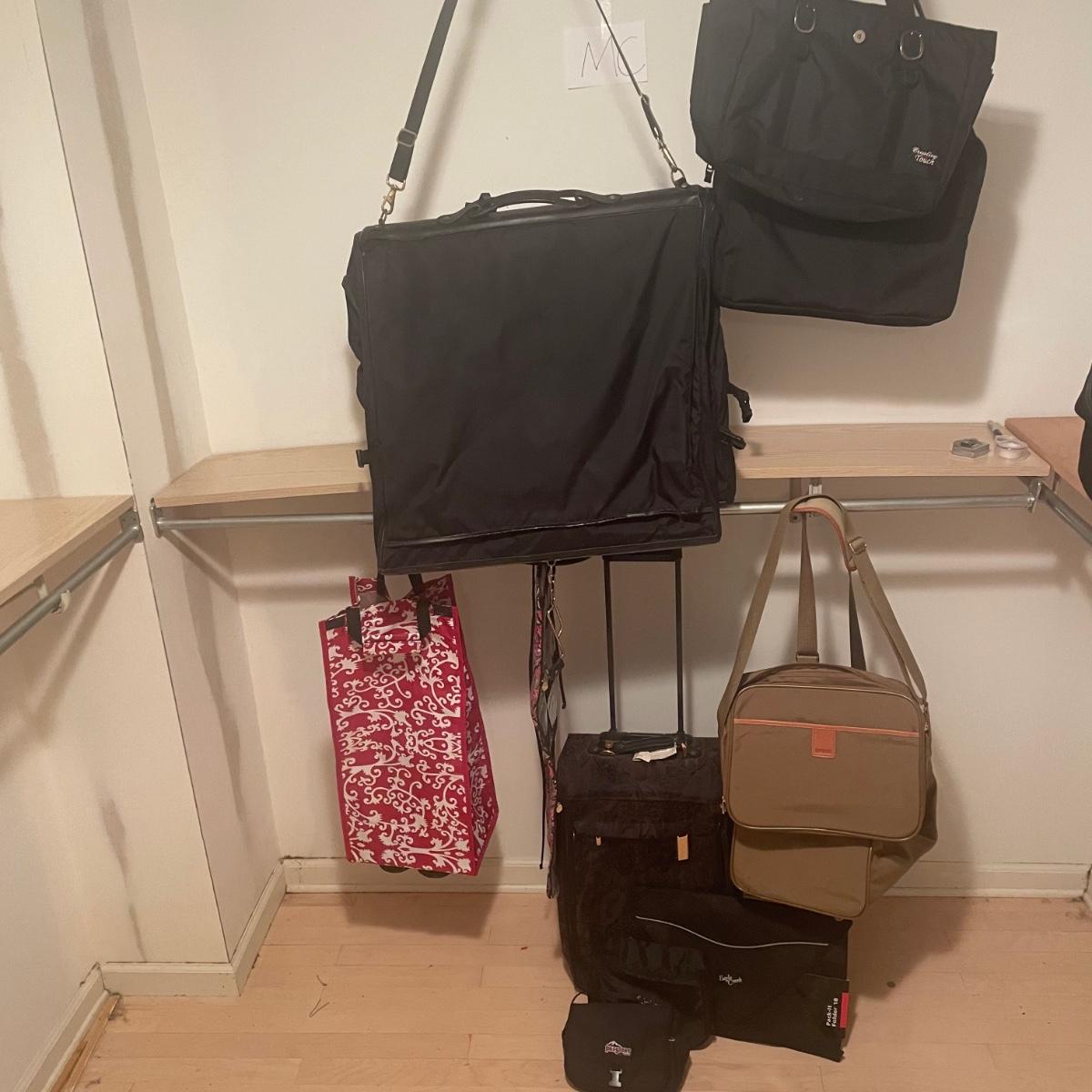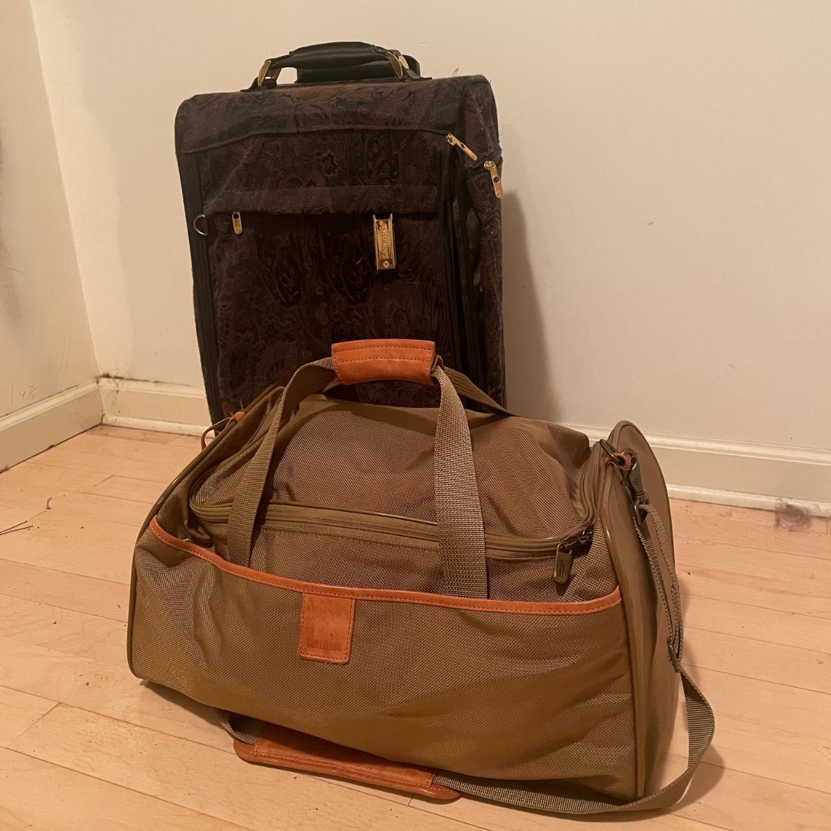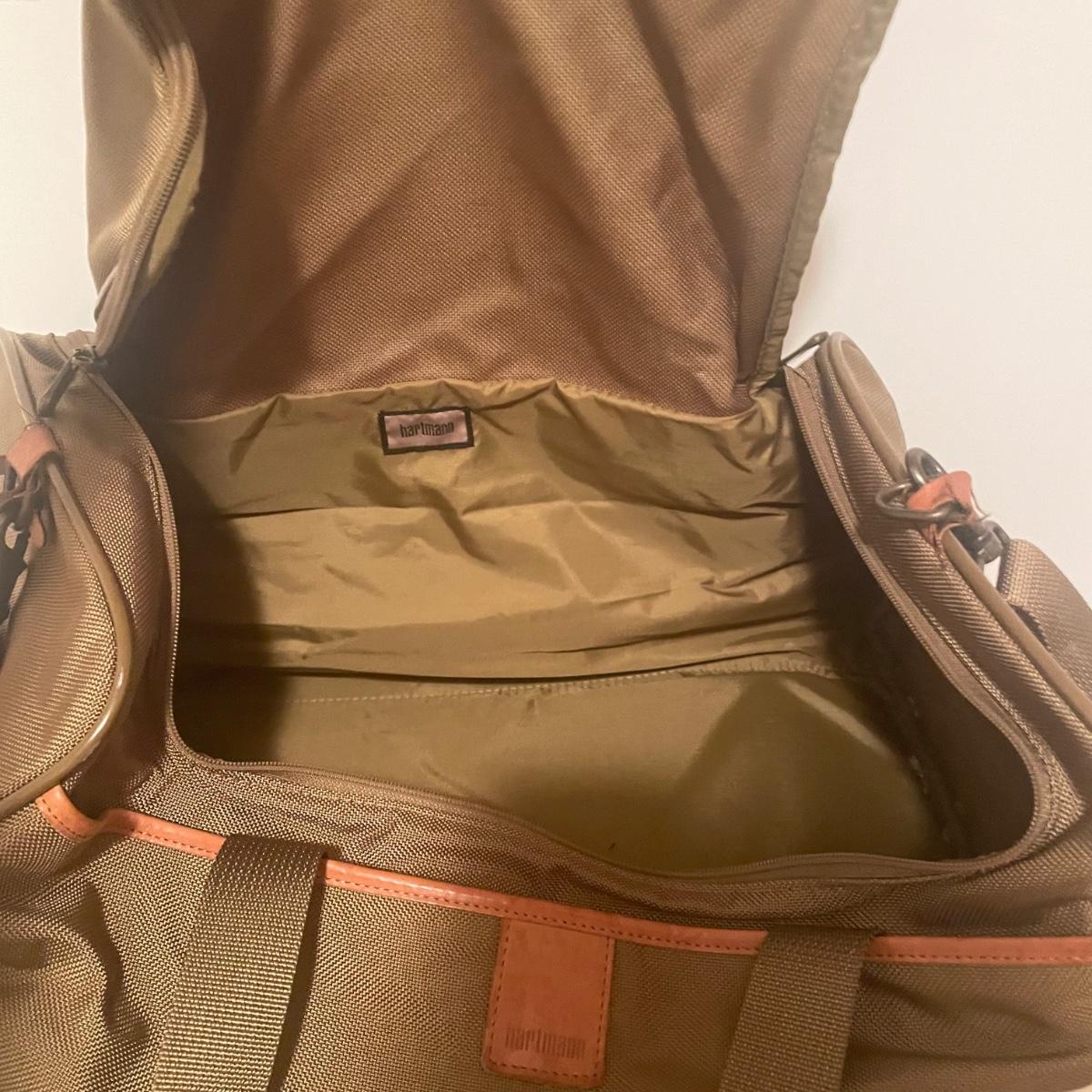 Some great luggage items in this lot along with other travel essentials. A matching Hartmann duo includes a medium sized duffel and a smaller bag. The Samsonite is a rolling carry-on suitcase (some minor signs of wear and tear on the bottom, see images) that measures 14” x 22” x 7”. Lot also includes a suit garment bag (one attachment needs gluing), Swissgear laptop case, and much more.