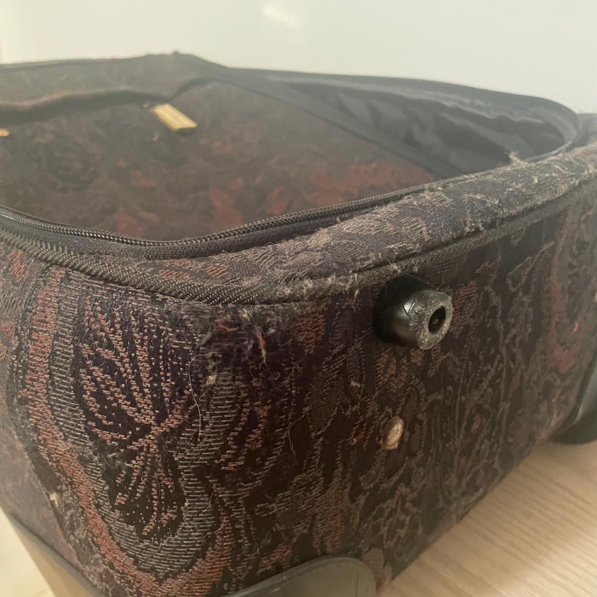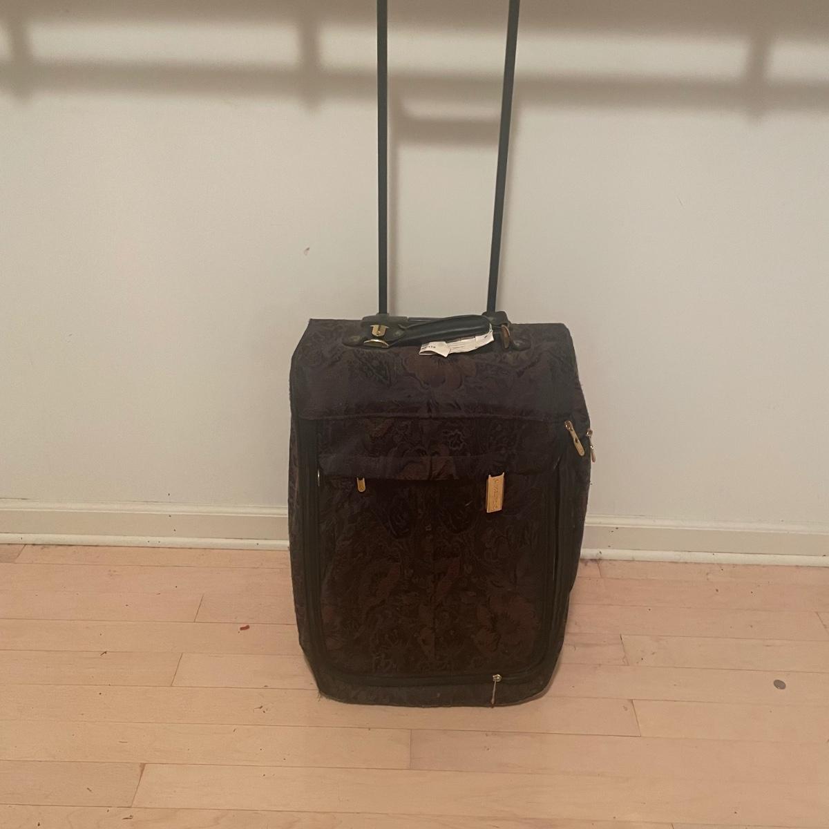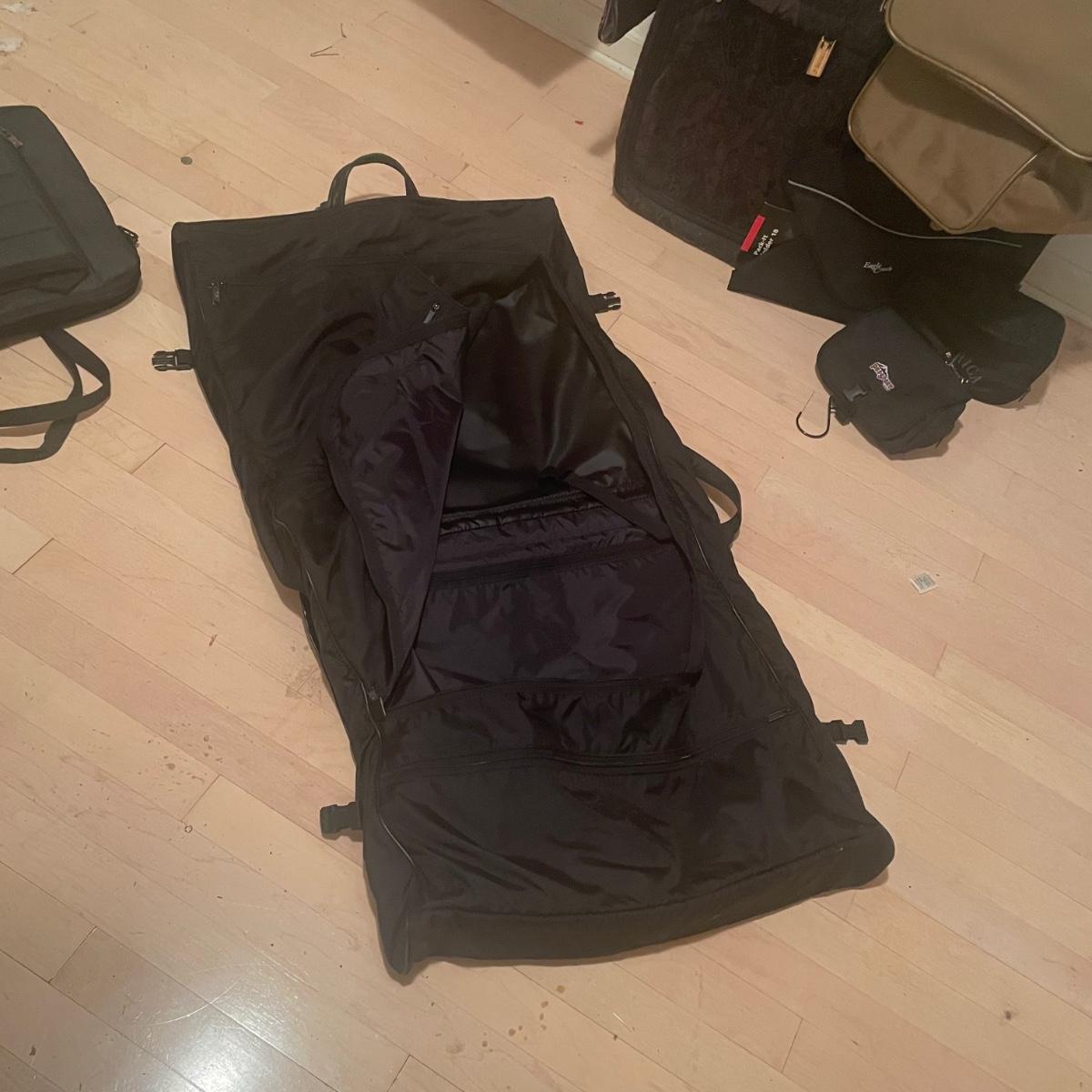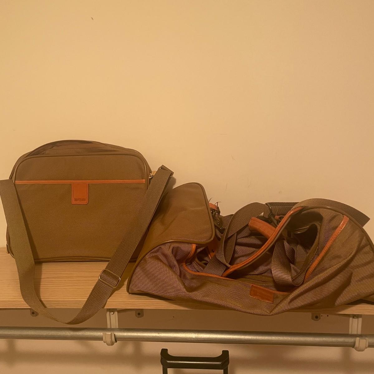 Some great luggage items in this lot along with other travel essentials. A matching Hartmann duo includes a medium sized duffel and a smaller bag. The Samsonite is a rolling carry-on suitcase (some minor signs of wear and tear on the bottom, see images) that measures 14” x 22” x 7”. Lot also includes a suit garment bag (one attachment needs gluing), Swissgear laptop case, and much more.