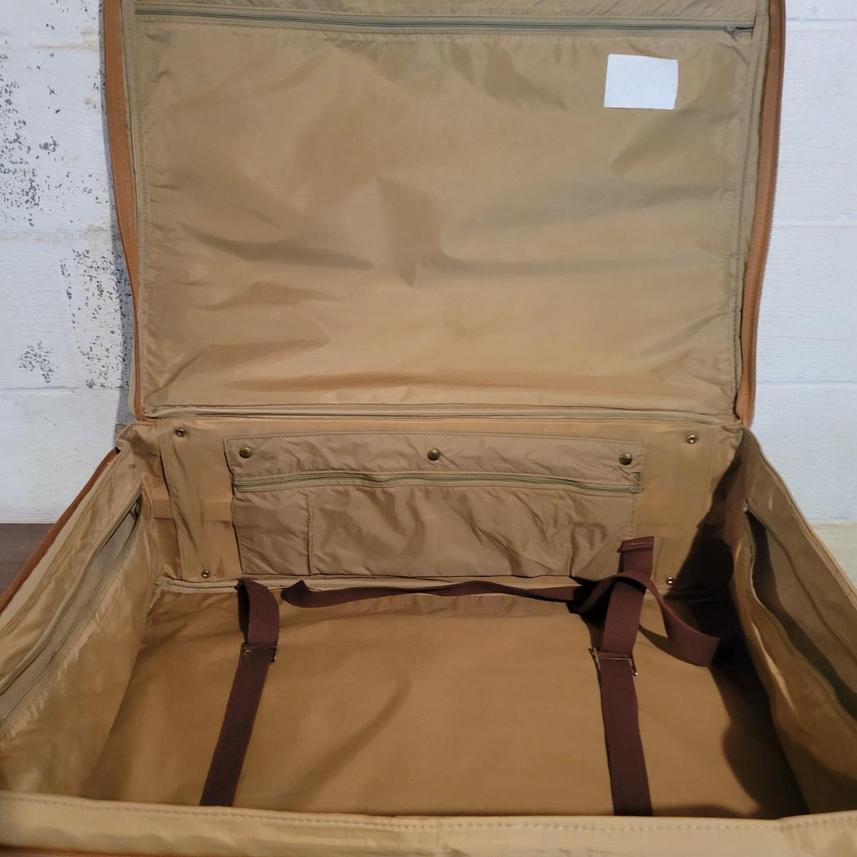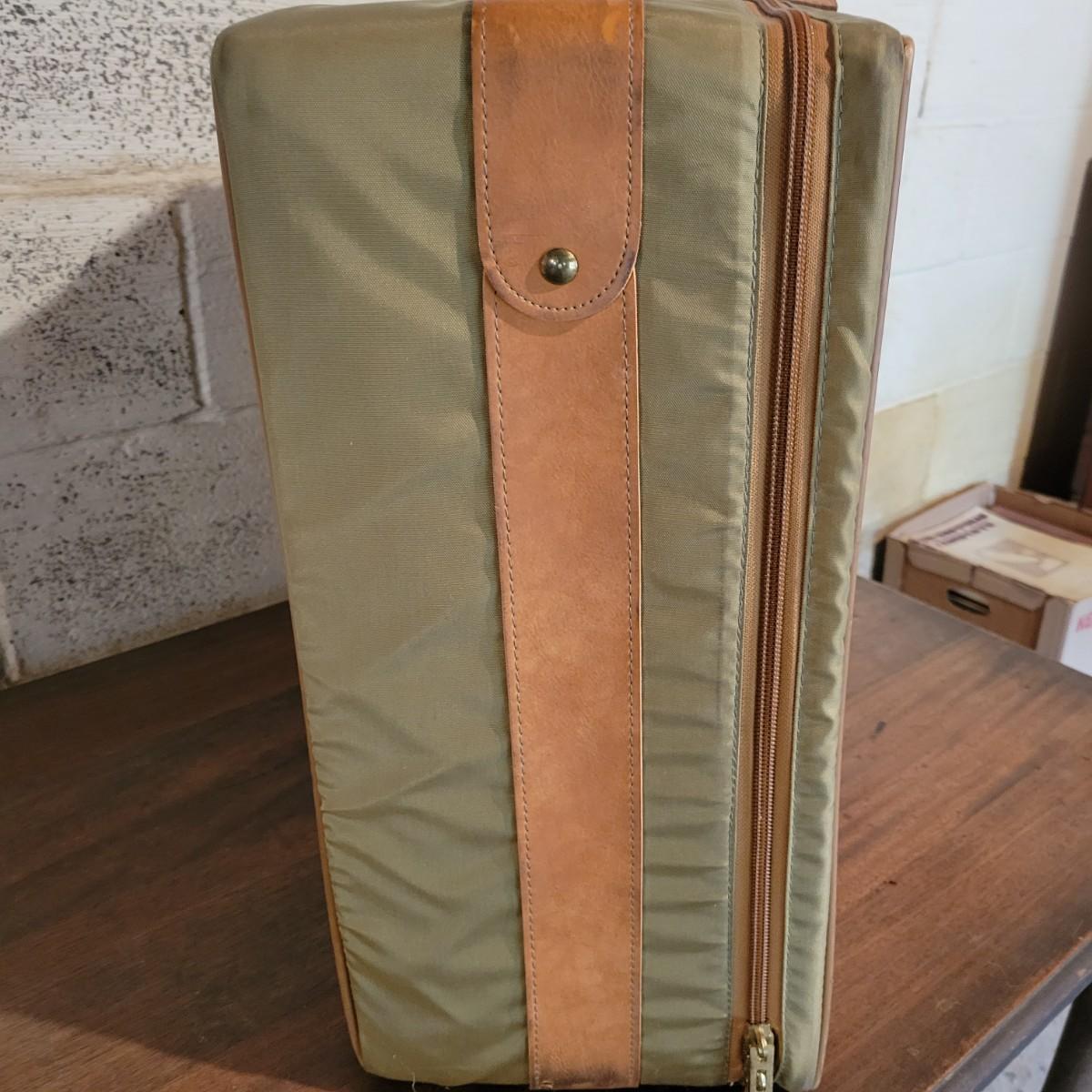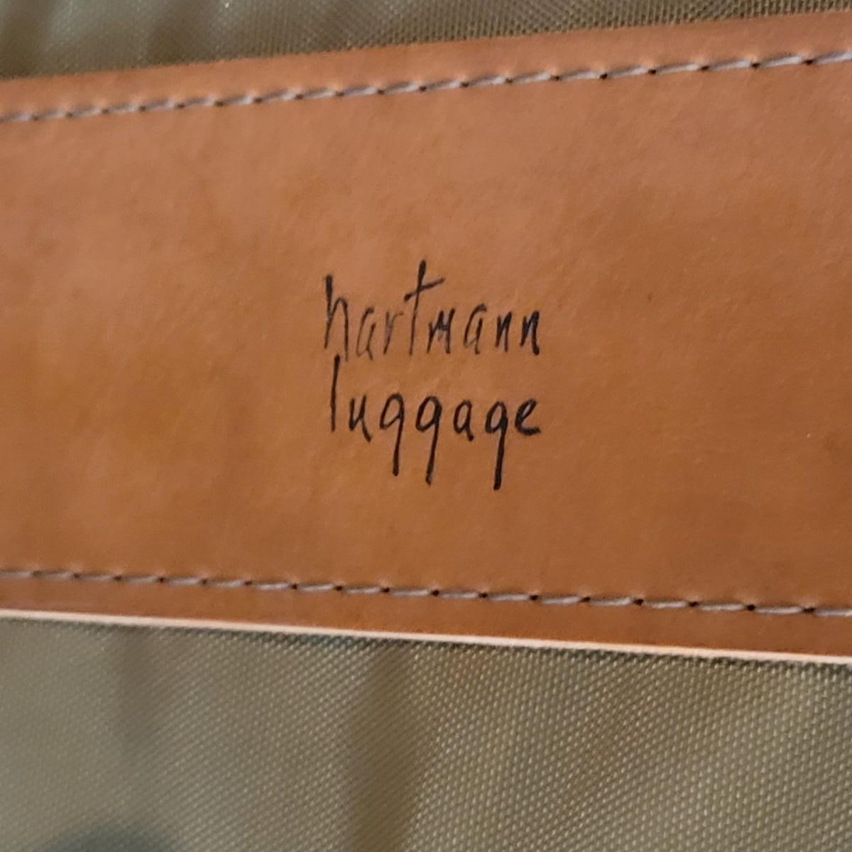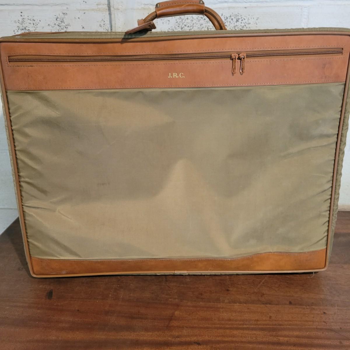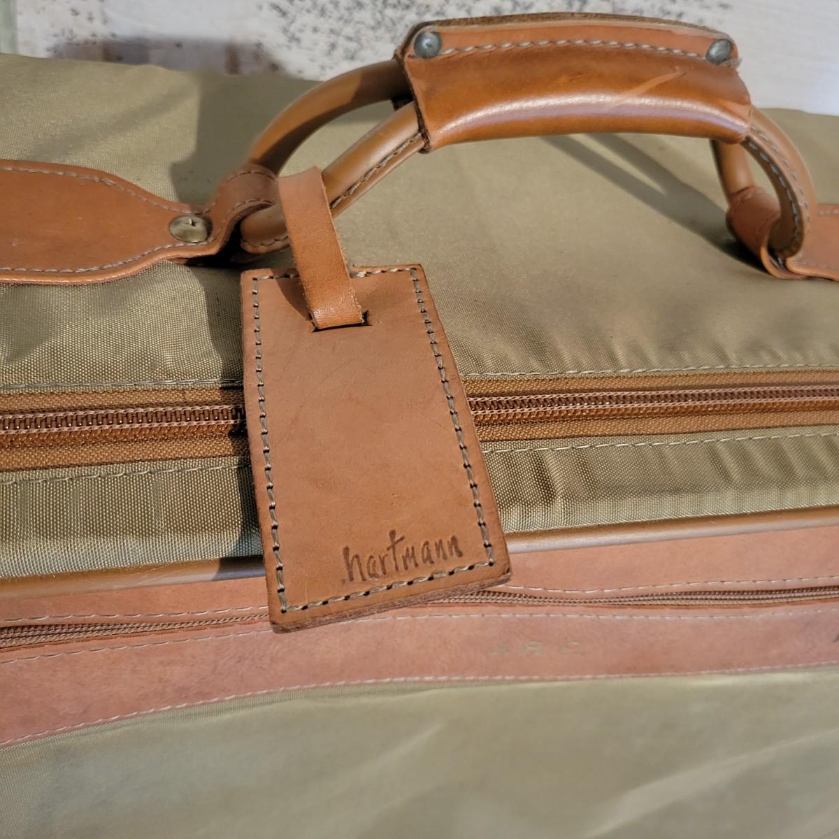 A Hartmann soft sided suitcase with leather trim and accents in good condition with minor blemishes from use. Suitcae is monogrammed "J.R.C.". This suitcase features a nylon fabric exterior with leather trim and handle, a large exterior pocket, three interior pockets and a deep main body. Measures approximately 27" x 20.5" x 9". Shipping available
