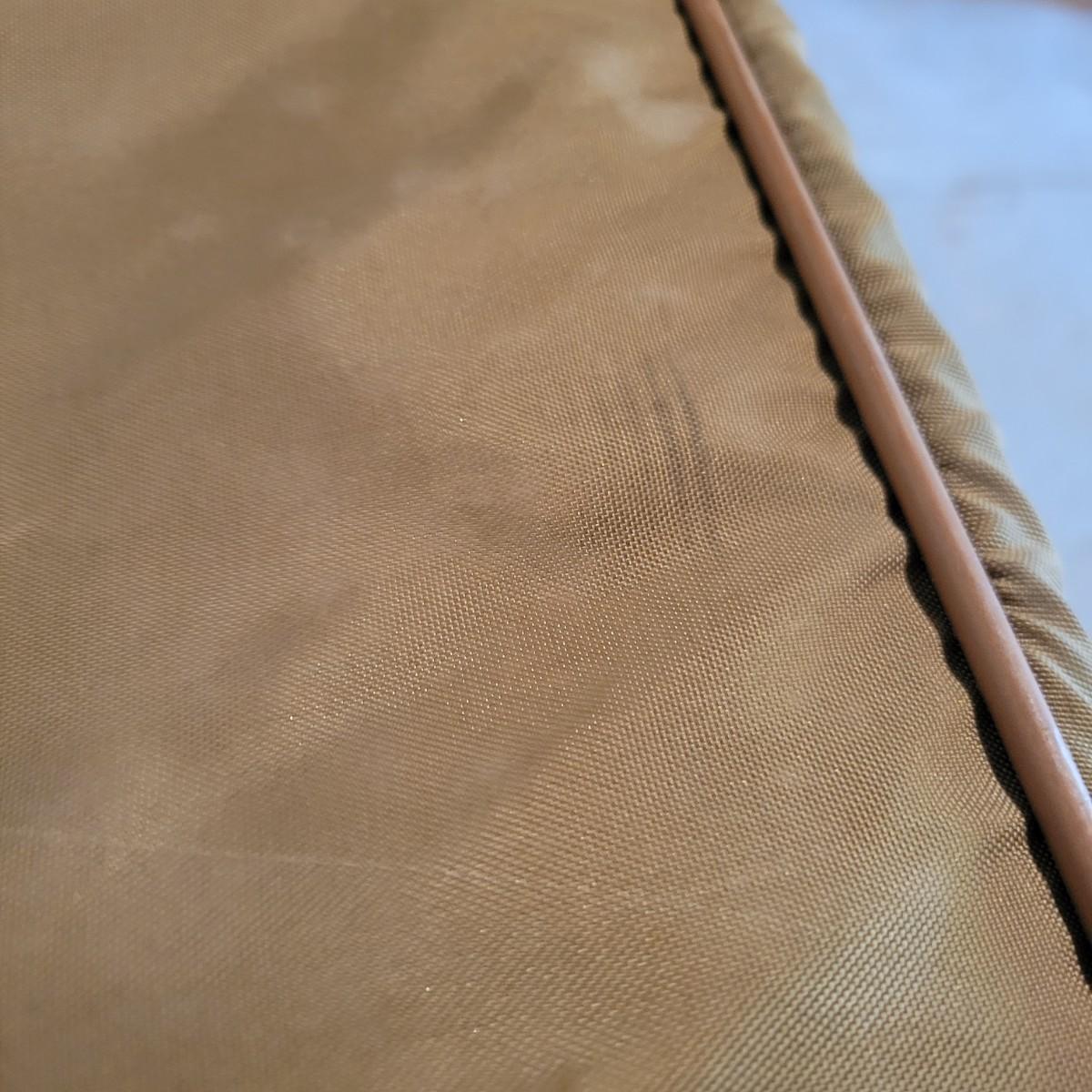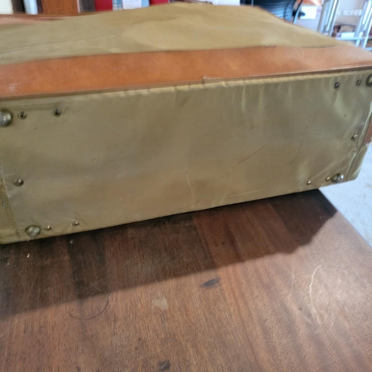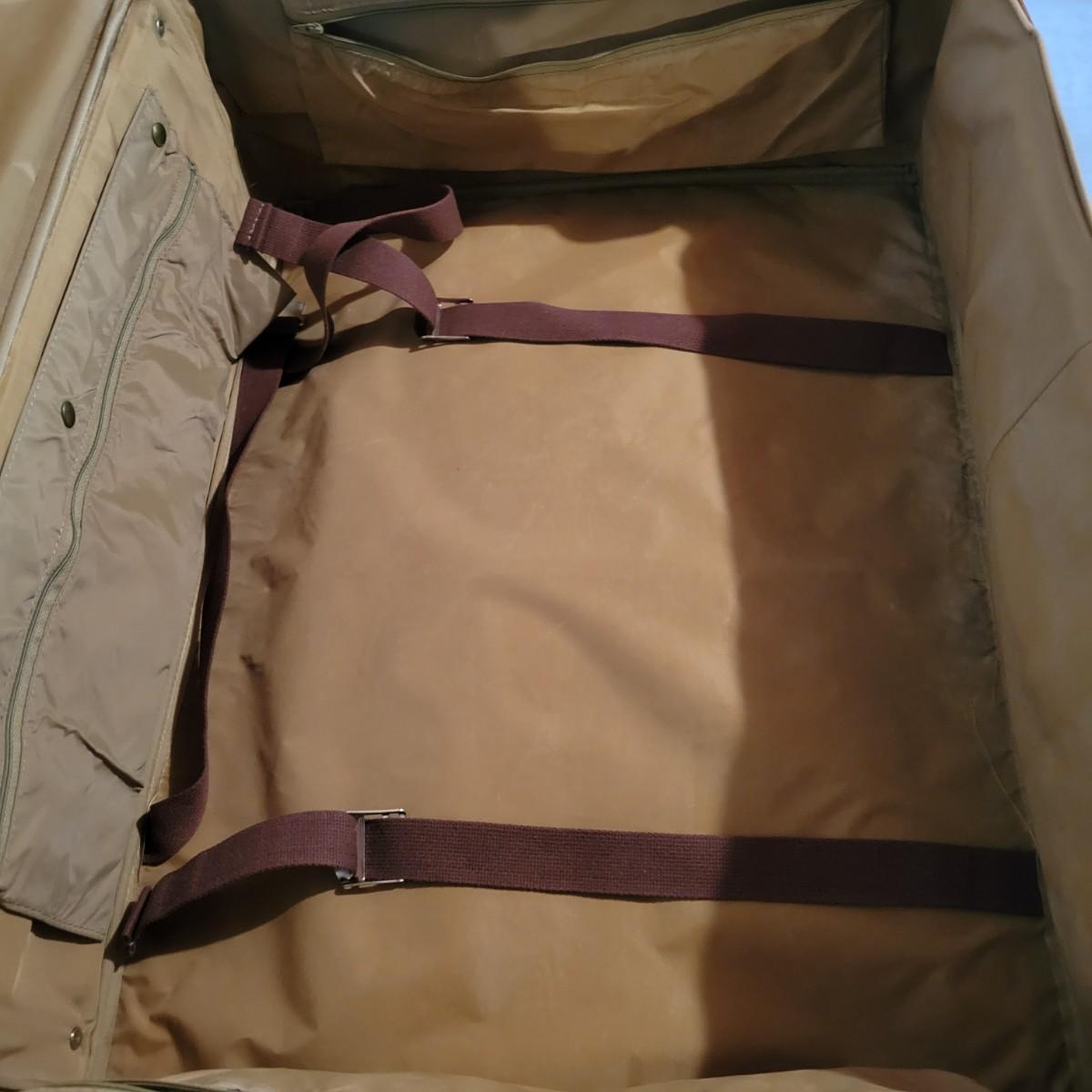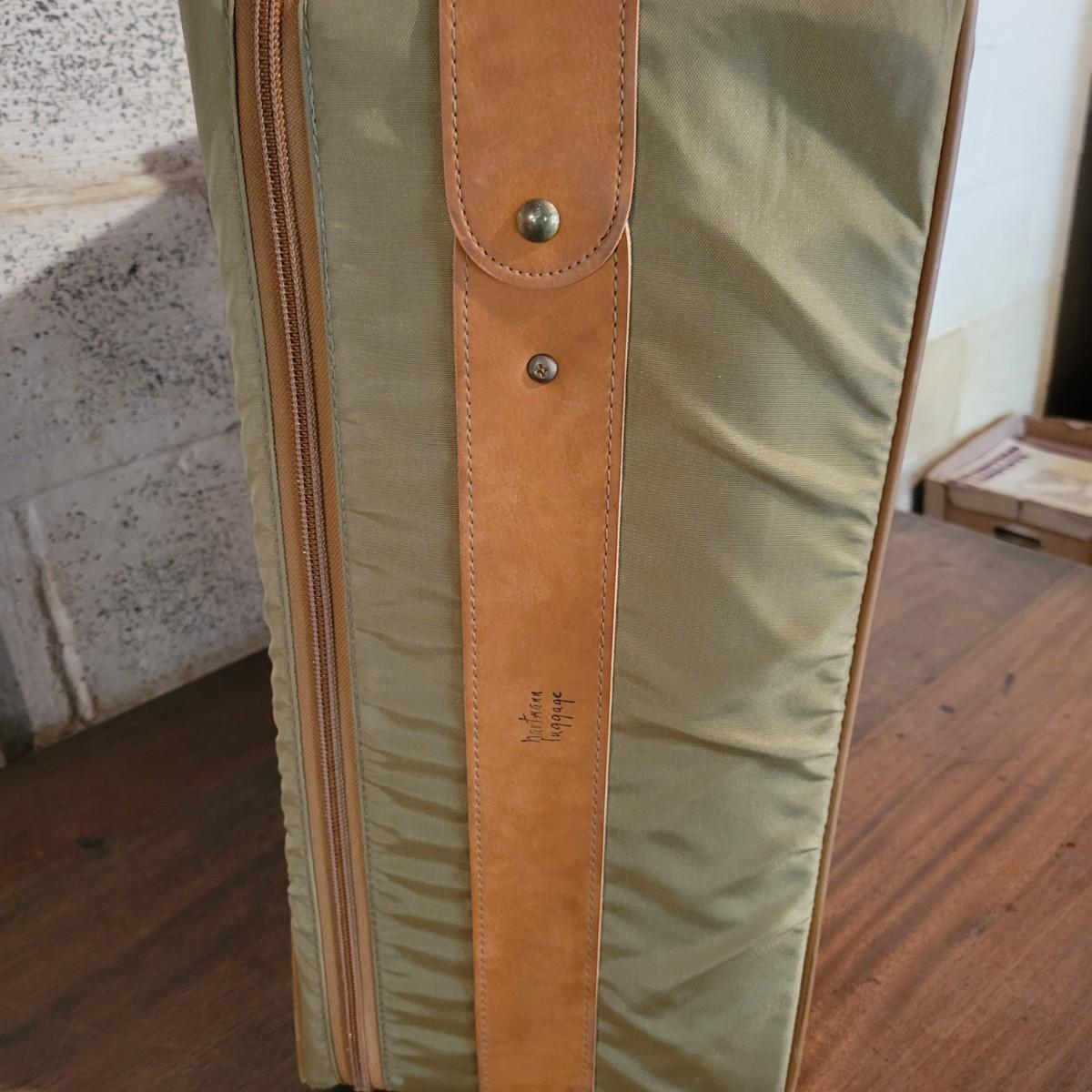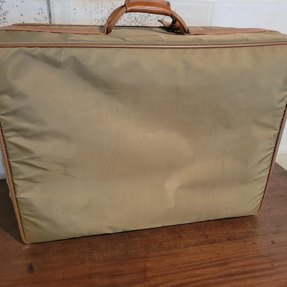 A Hartmann soft sided suitcase with leather trim and accents in good condition with minor blemishes from use. Suitcae is monogrammed "J.R.C.". This suitcase features a nylon fabric exterior with leather trim and handle, a large exterior pocket, three interior pockets and a deep main body. Measures approximately 27" x 20.5" x 9". Shipping available