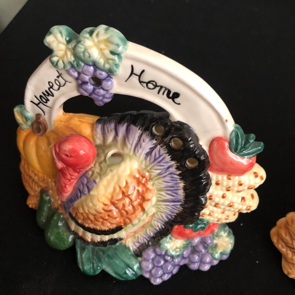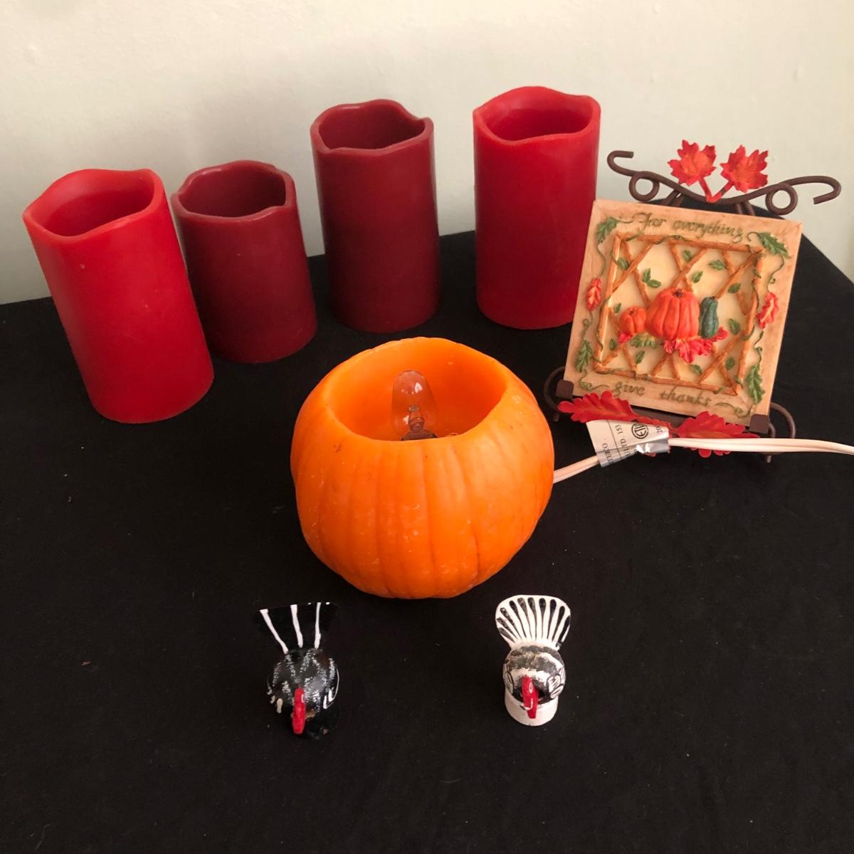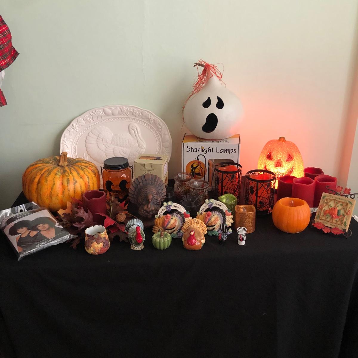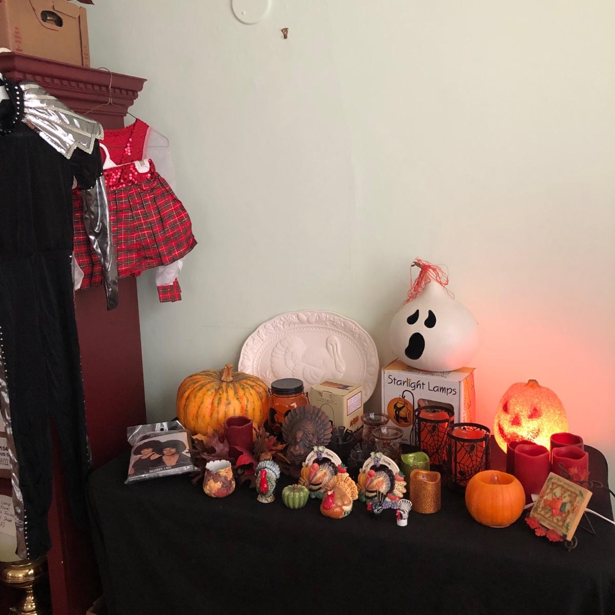 This lot is all about the fall season! It has 2 children’s Halloween costumes and a Halloween Afro wig. It has items to decorate your table: candles, salt & pepper shakers and Jack-o-lantern jars. It has Halloween decorations: pumpkins that light up, starlight lamp and a gourd ghost and more! The Turkey platter measures 18” x 13.5”. The pumpkin is made of a light weight material such as styrofoam. There are 2 lantern jars-both still in their boxes. There are 3 salt& pepper shakers-2 turkeys and one green pumpkin. Shipping Available.