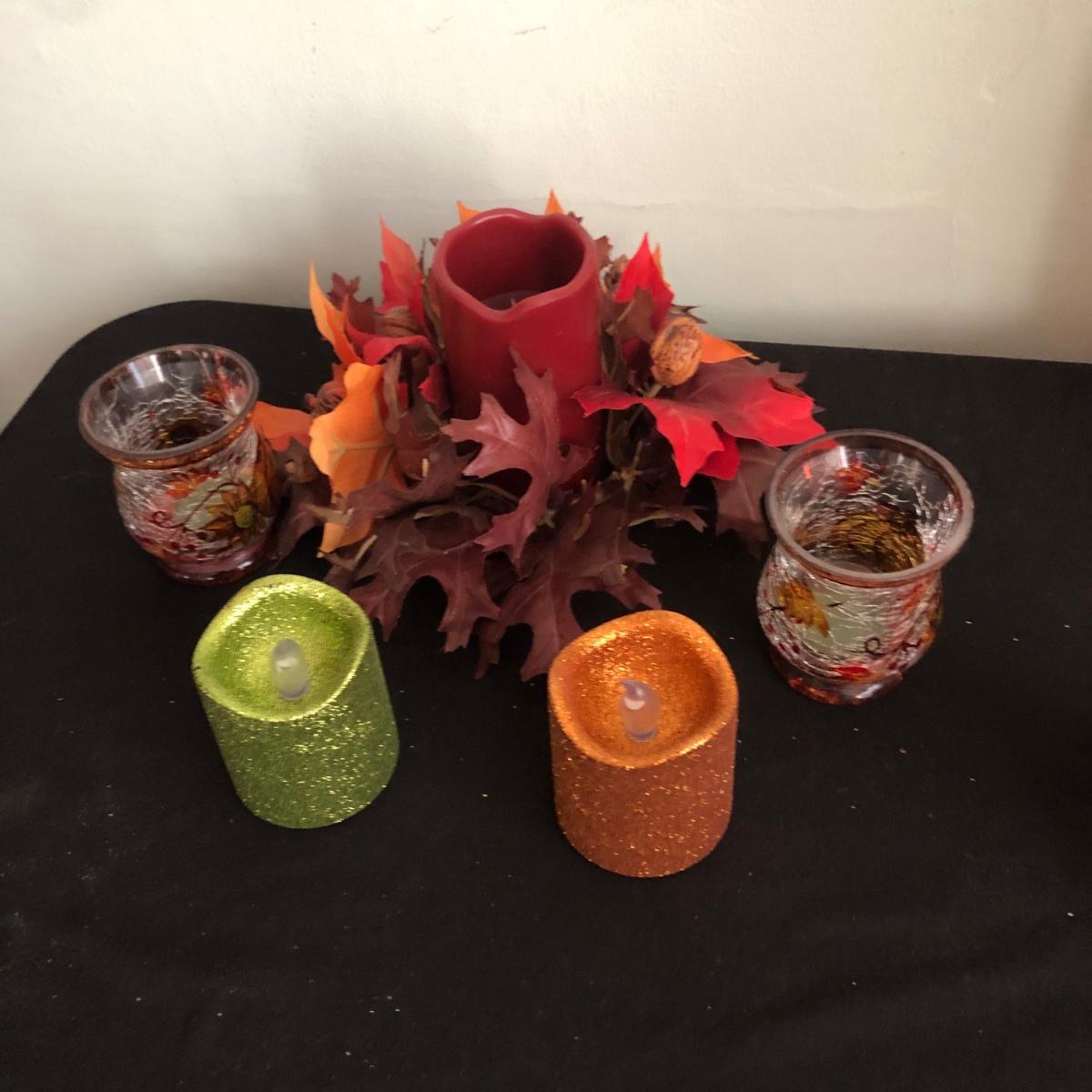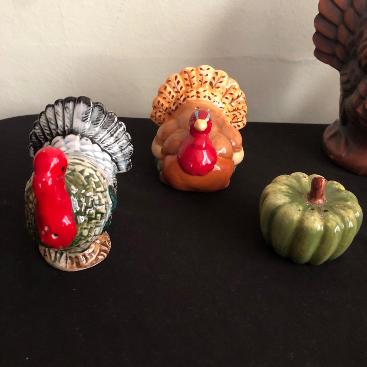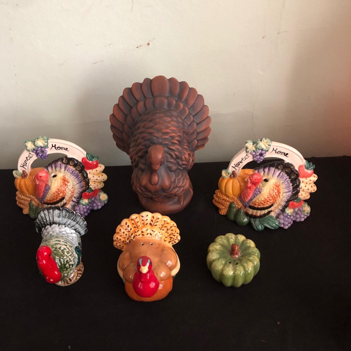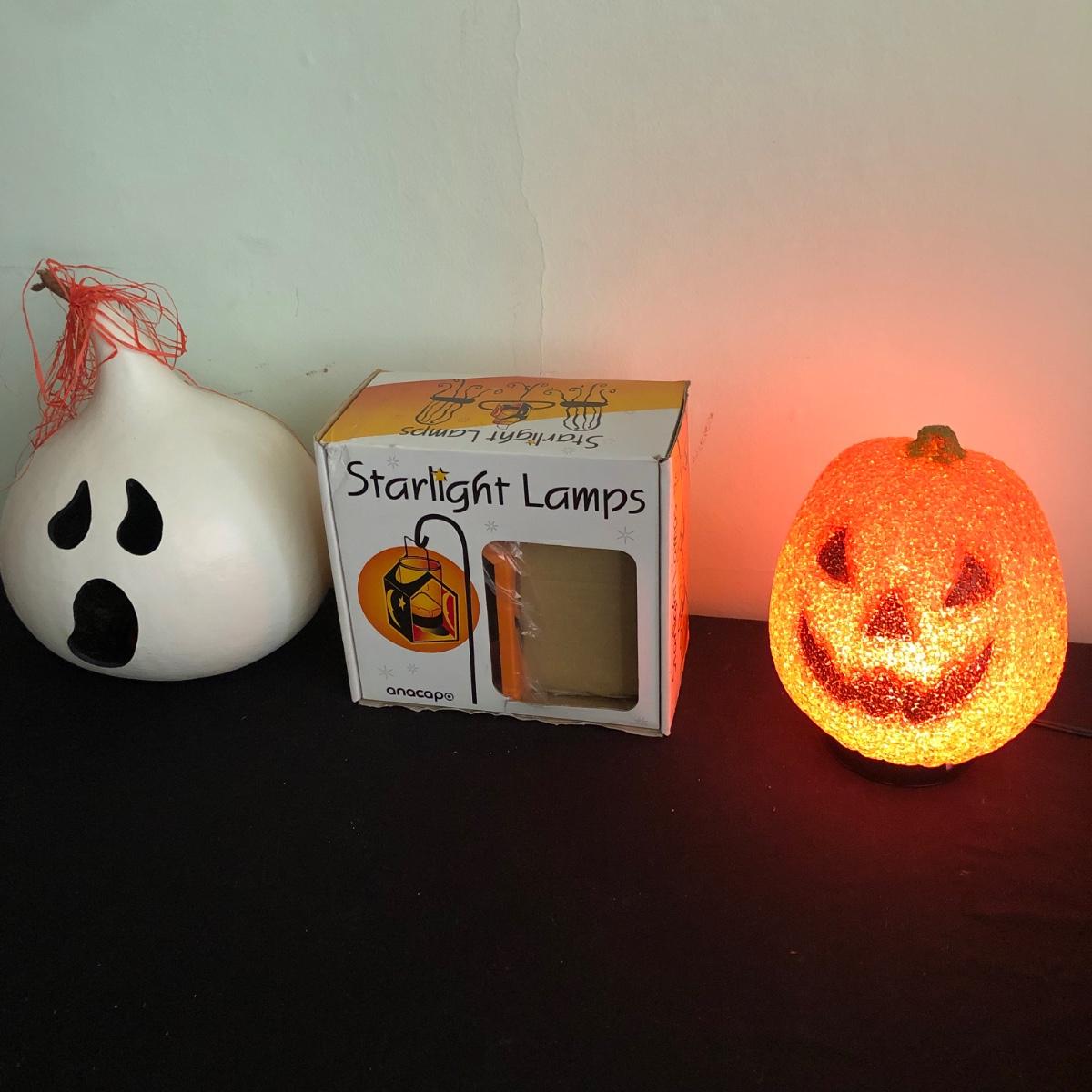 This lot is all about the fall season! It has 2 children’s Halloween costumes and a Halloween Afro wig. It has items to decorate your table: candles, salt & pepper shakers and Jack-o-lantern jars. It has Halloween decorations: pumpkins that light up, starlight lamp and a gourd ghost and more! The Turkey platter measures 18” x 13.5”. The pumpkin is made of a light weight material such as styrofoam. There are 2 lantern jars-both still in their boxes. There are 3 salt& pepper shakers-2 turkeys and one green pumpkin. Shipping Available.