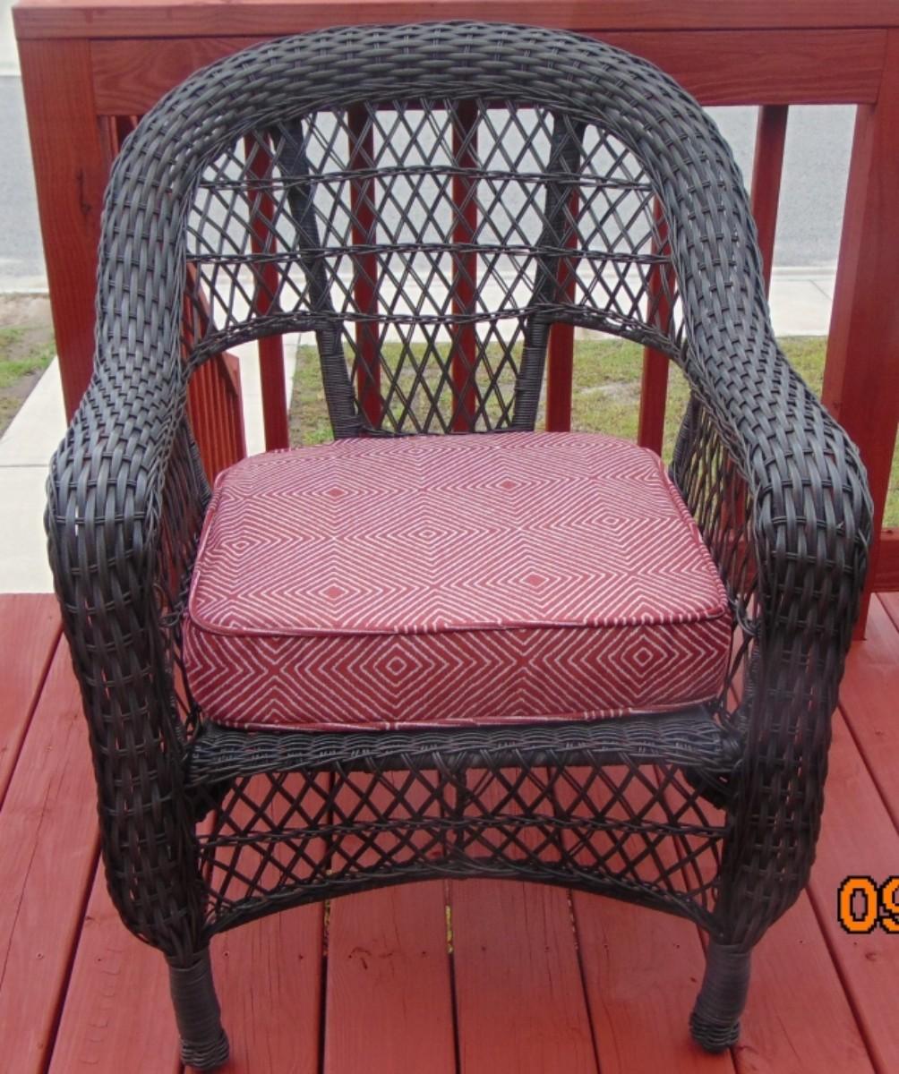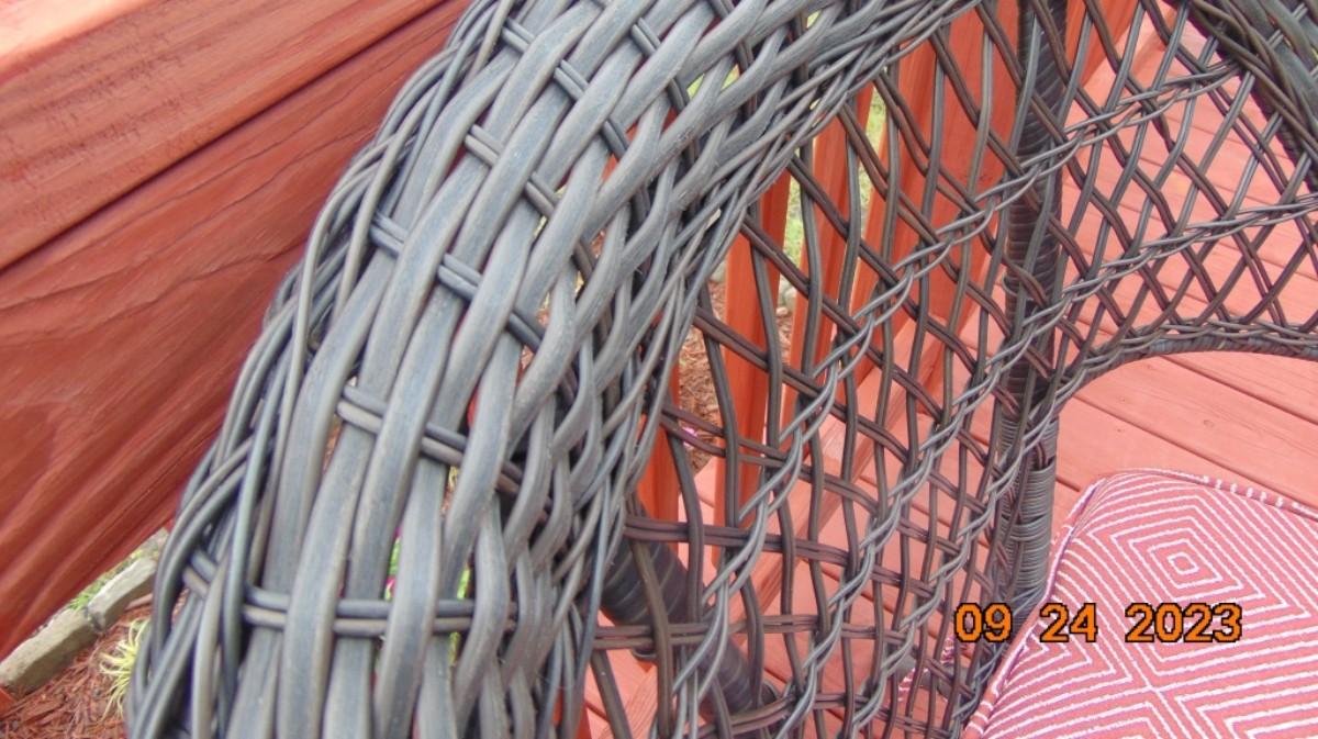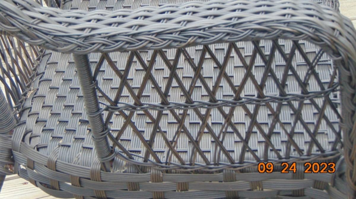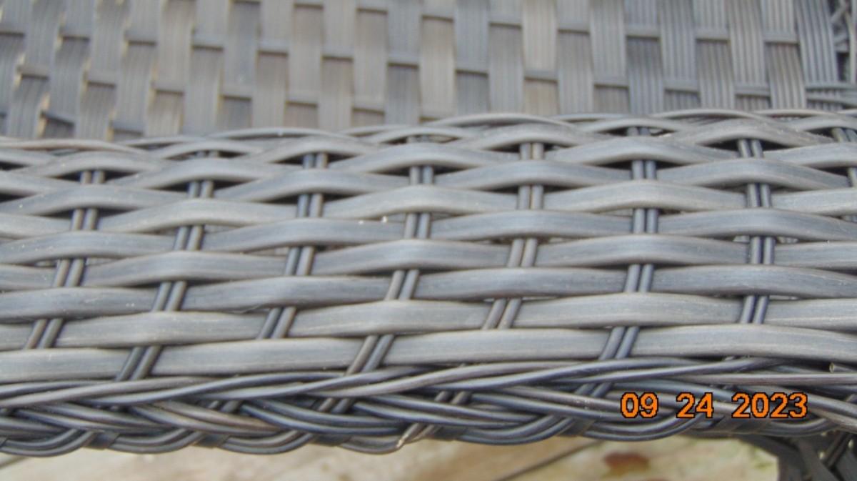 All-weather wicker with a curved backrest and arms in a mixture of closed and open weave stylings. Weather-resistant