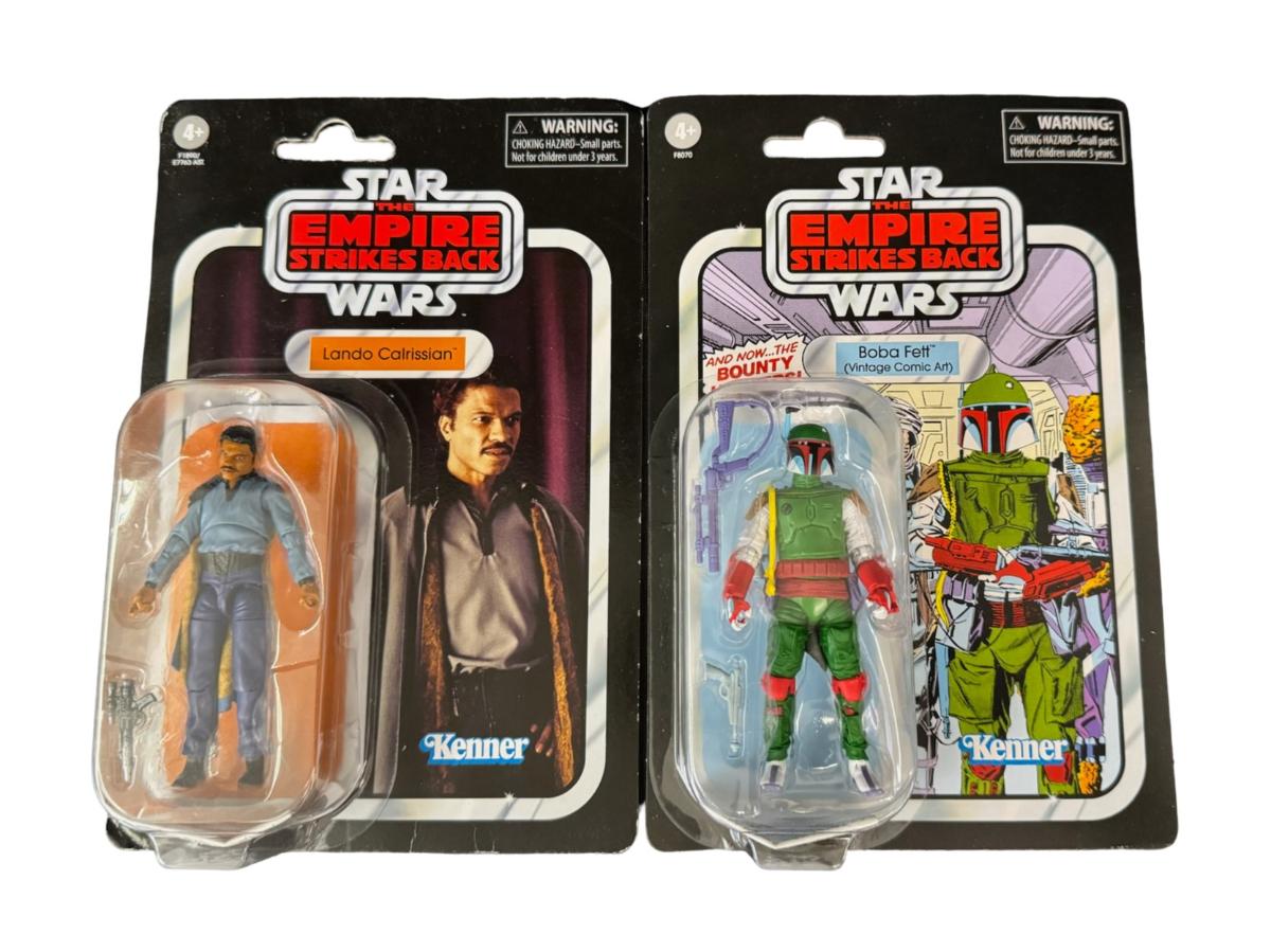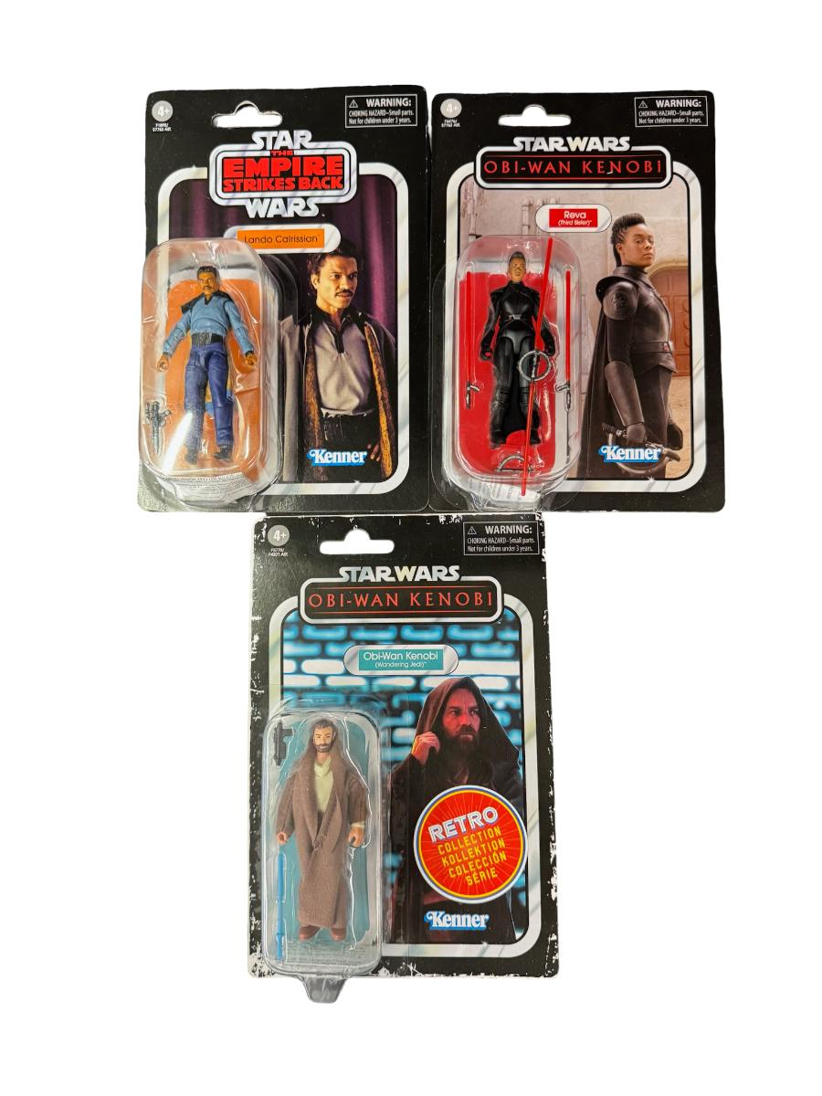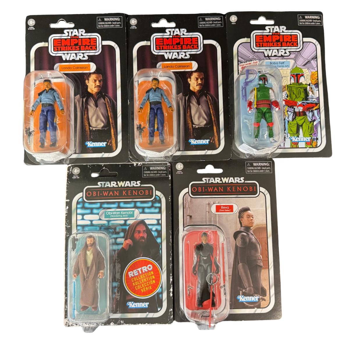 Made by Kenner. From the Obi-Wan Kenobi and The Empire Strikes Back collections. Includes Reva, Obi-Wan Kenobi, Lando Calrissian (x2), and Boba Fett. Total of five pieces. In the original packaging, which may have storage related wear.
