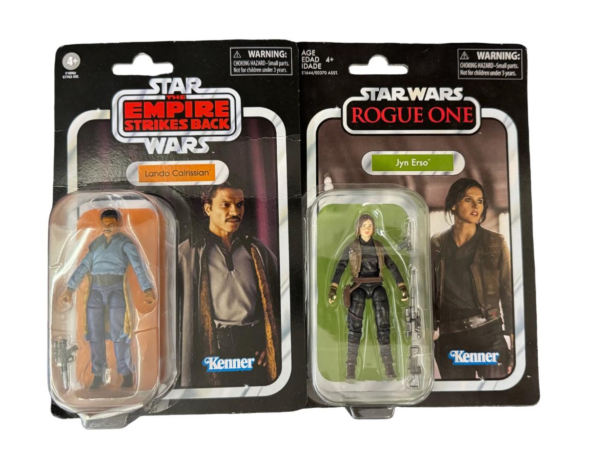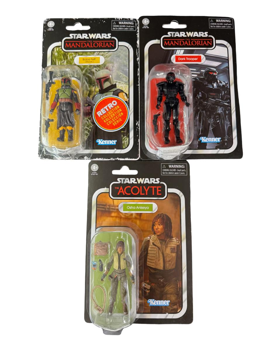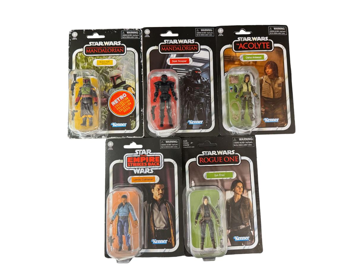 Made by Kenner. From The Mandalorian, The Empire Strikes Back, The Acolyte, and Rogue One collections. Includes Boba Fett, Dark Trooper, Lando Calrissian, Osha Aniseya, and Jyn Erso. Total of five pieces. In the original packages, which may have storage related wear.