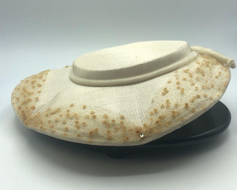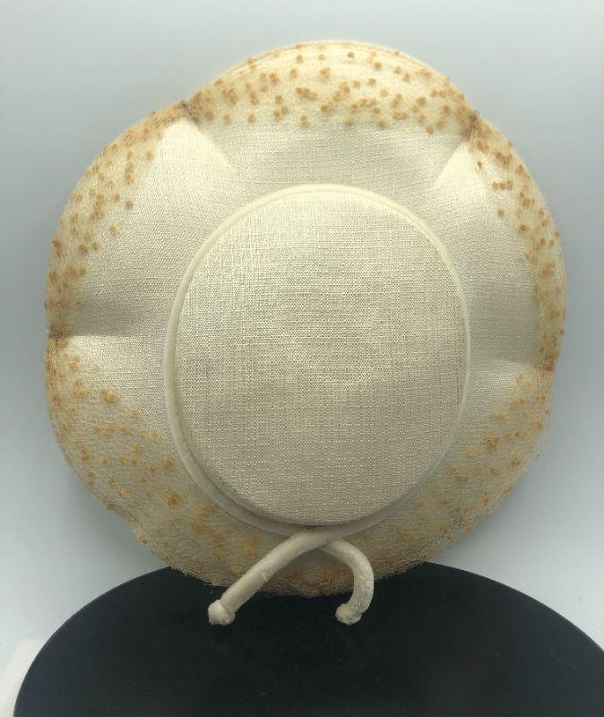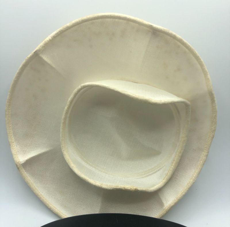 Woman’s hat, satin fabric stretched and pressed into a hard, stiff shell. Maker and size unknown, measures approx. 6 1/2” inside. Shape is flat and round, approx. 12” across.