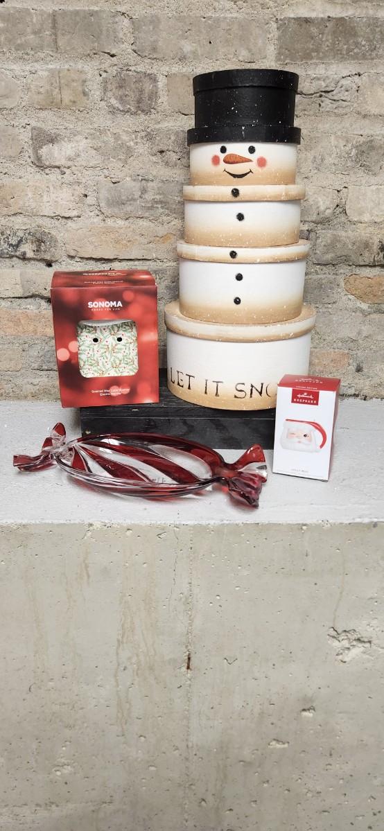 New hallmark candy dish, ornament, new target candle warmer and a cute hatbox snowman