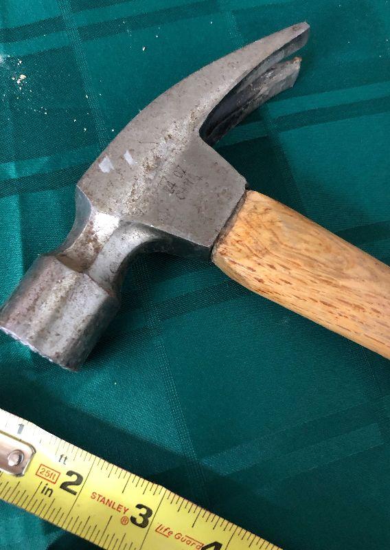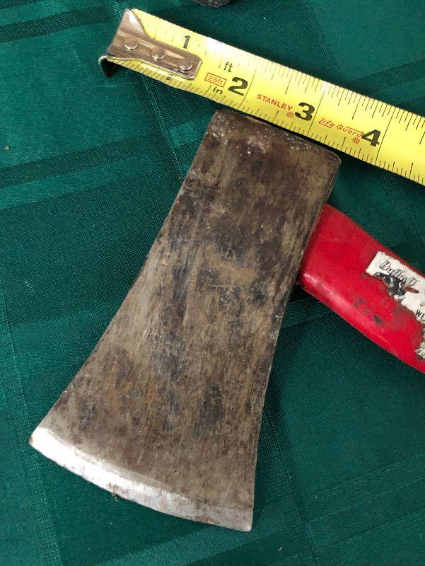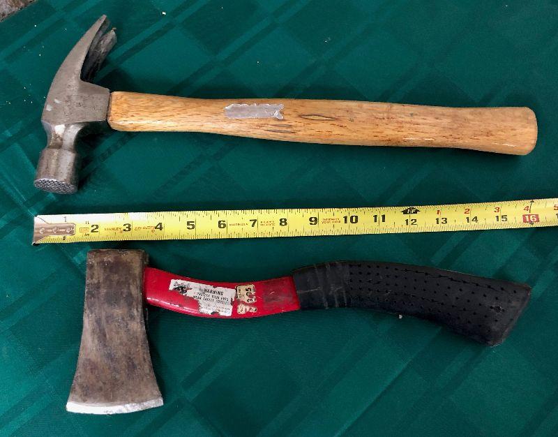 Here in good used condition are a framing hammer and a hatchet or hand axe...