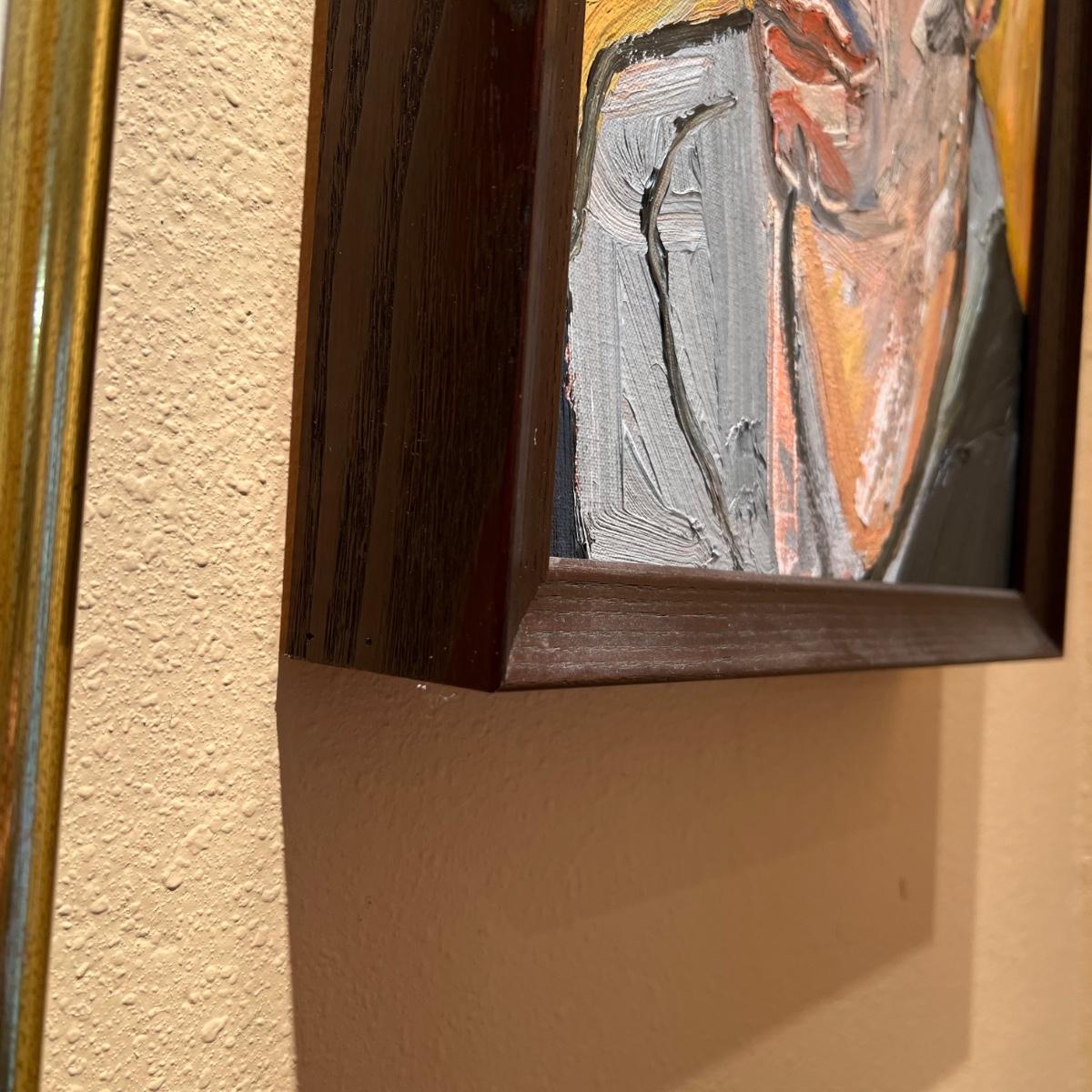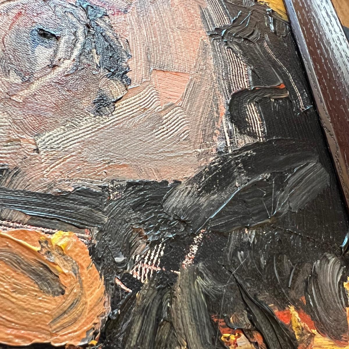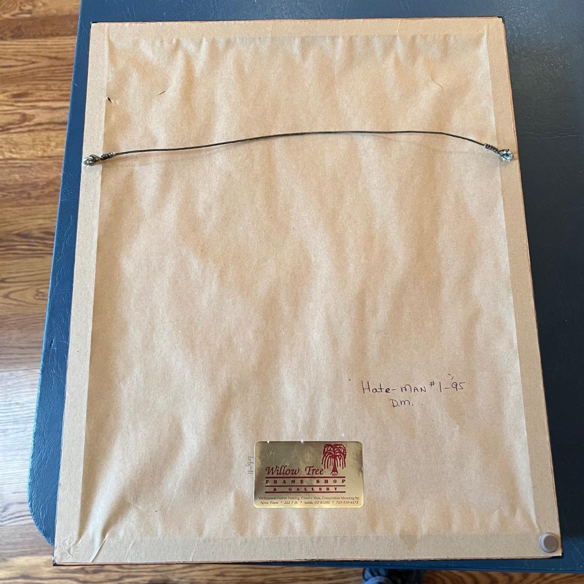 This portrait has “Hate-Man”written on the back and appears to be an acrylic original painting. Paint was heavily applied in areas and scraped back in other areas for dramatic effect. Mounted (not under glass) in a shadow box style wooden frame which measures 13.5” x 3” x 16.5”H. No artist signature found.