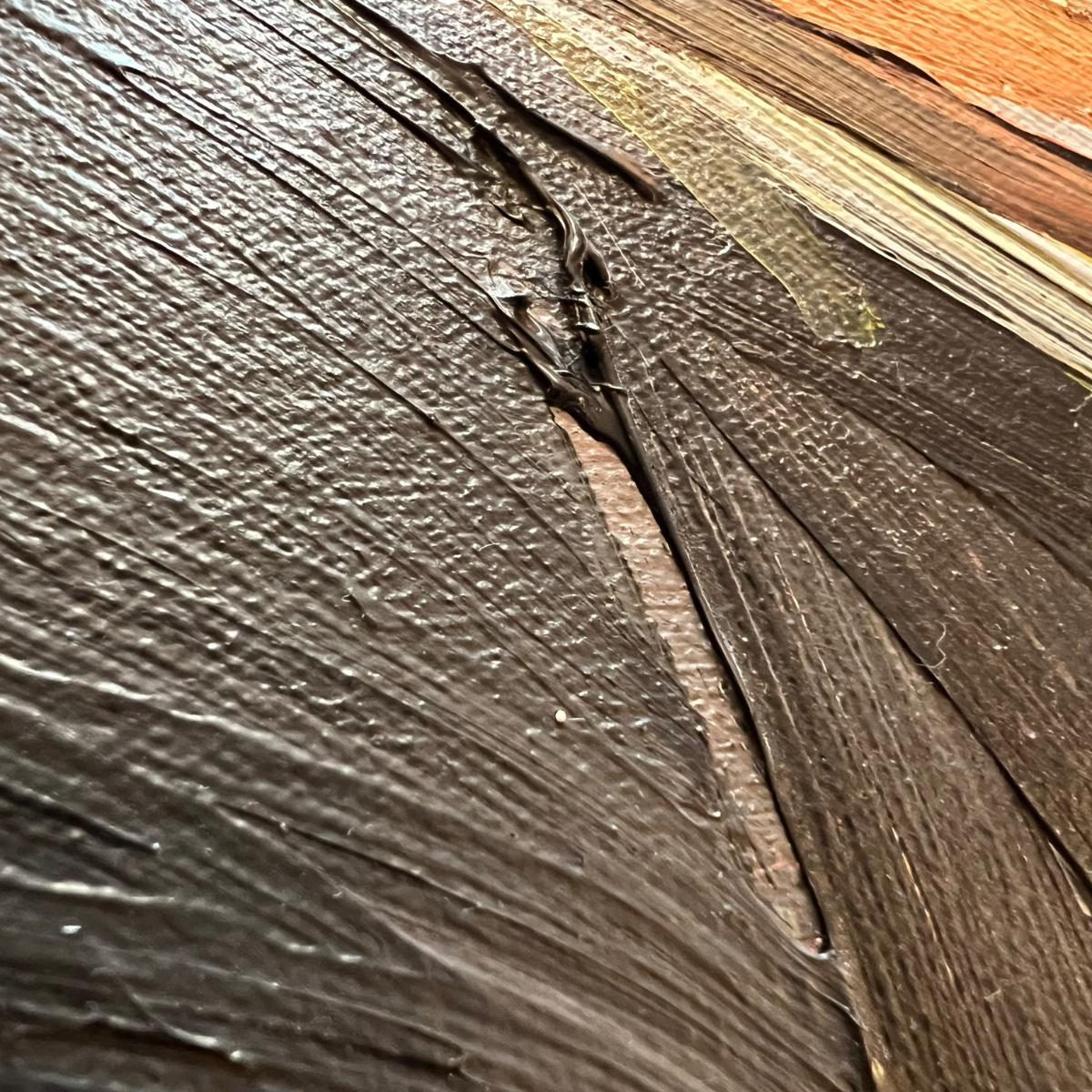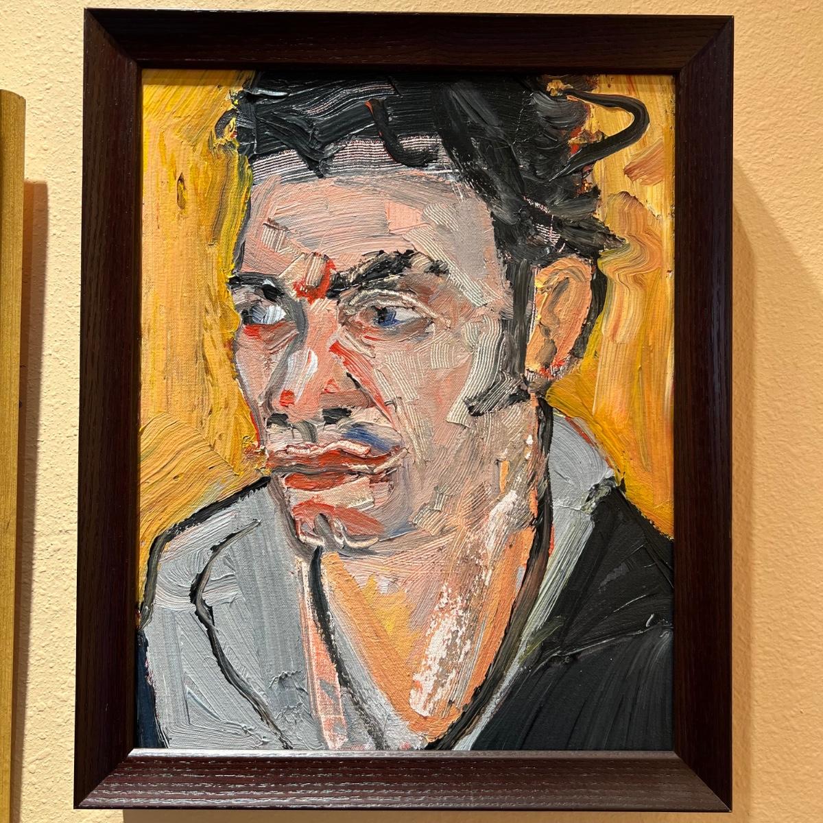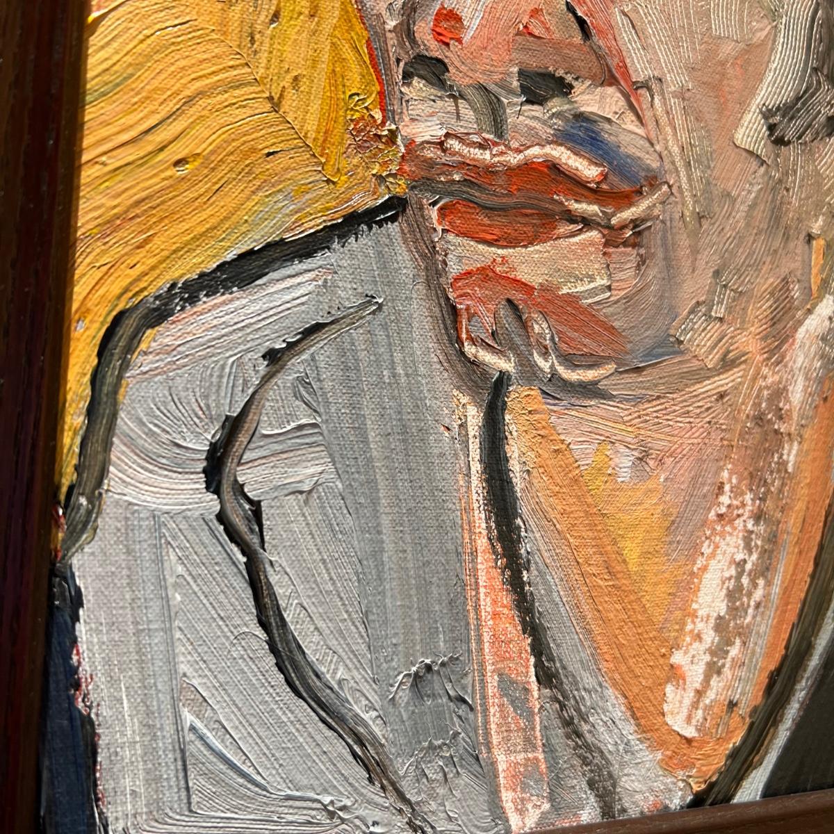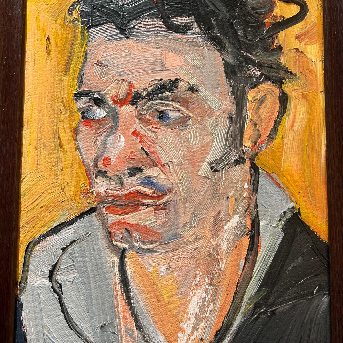 This portrait has “Hate-Man”written on the back and appears to be an acrylic original painting. Paint was heavily applied in areas and scraped back in other areas for dramatic effect. Mounted (not under glass) in a shadow box style wooden frame which measures 13.5” x 3” x 16.5”H. No artist signature found.