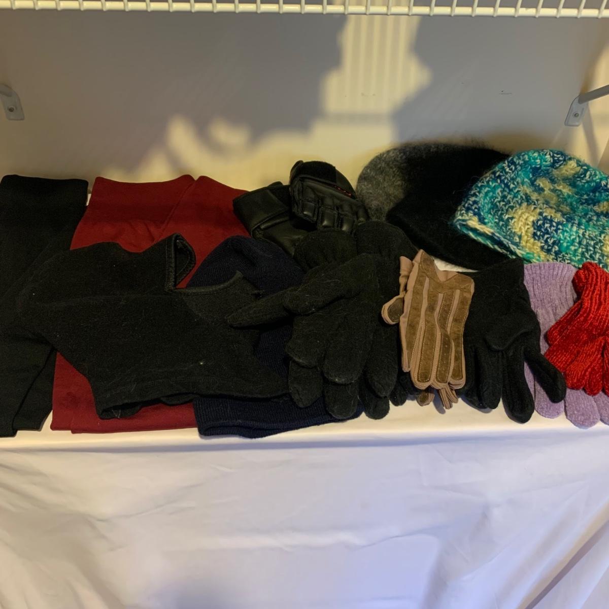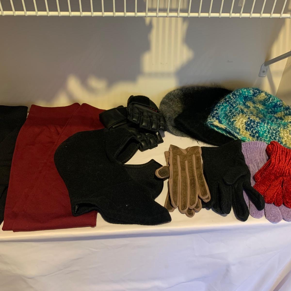 This lot includes 5 winter hats, 2 ski masks, 2 pairs of long-johns, 7 pairs of gloves, and more. Sizes appear to range from Small to Medium. Shipping available.