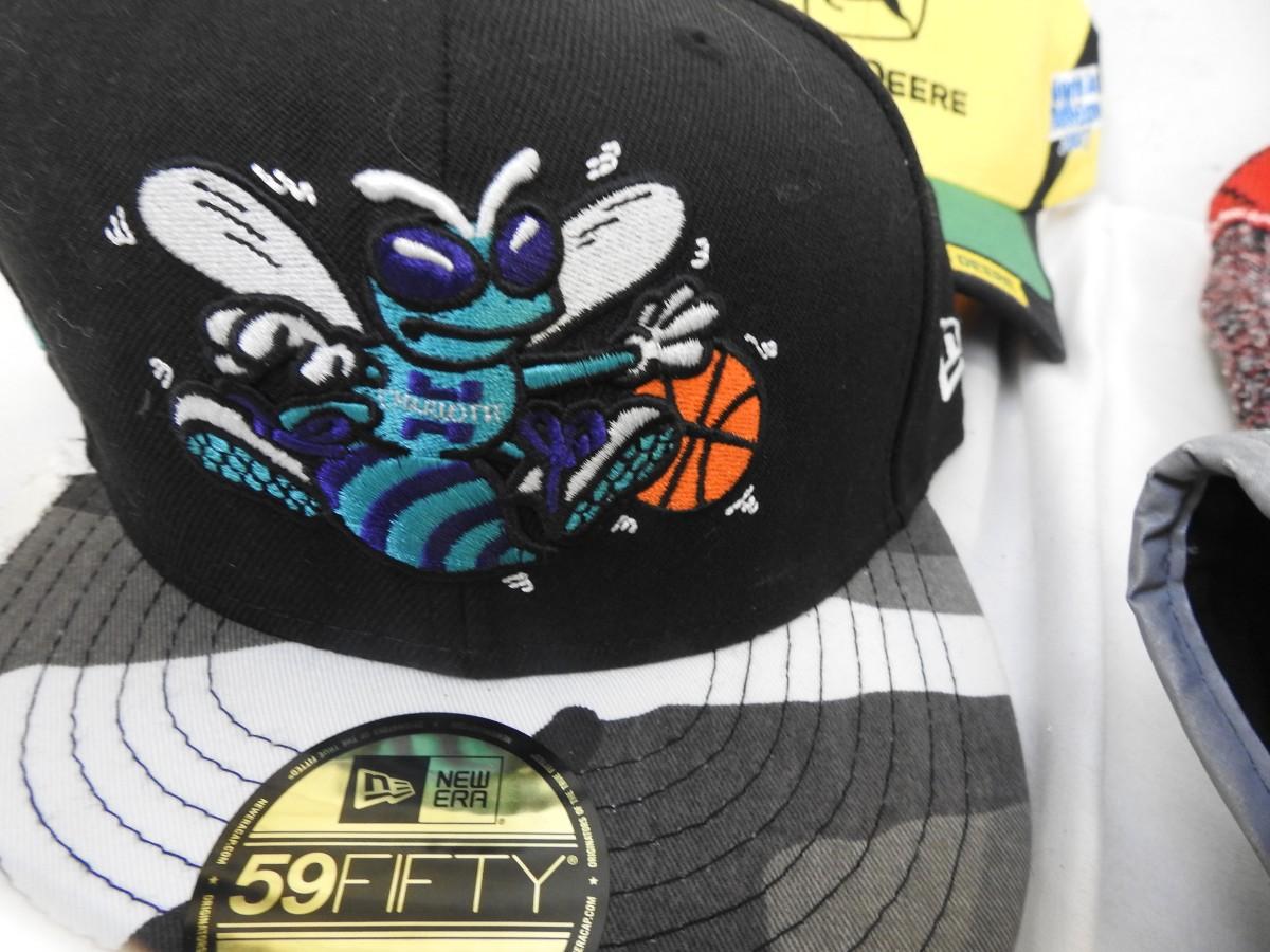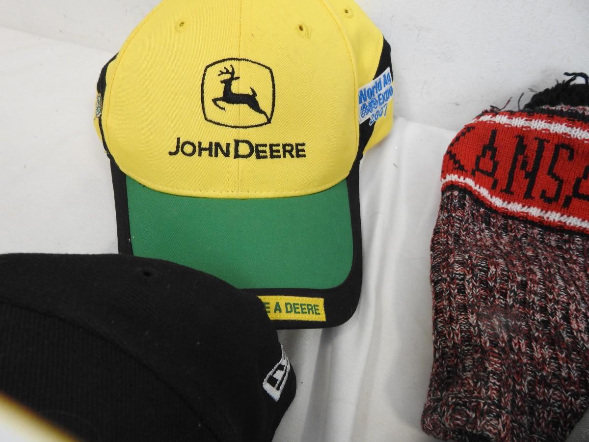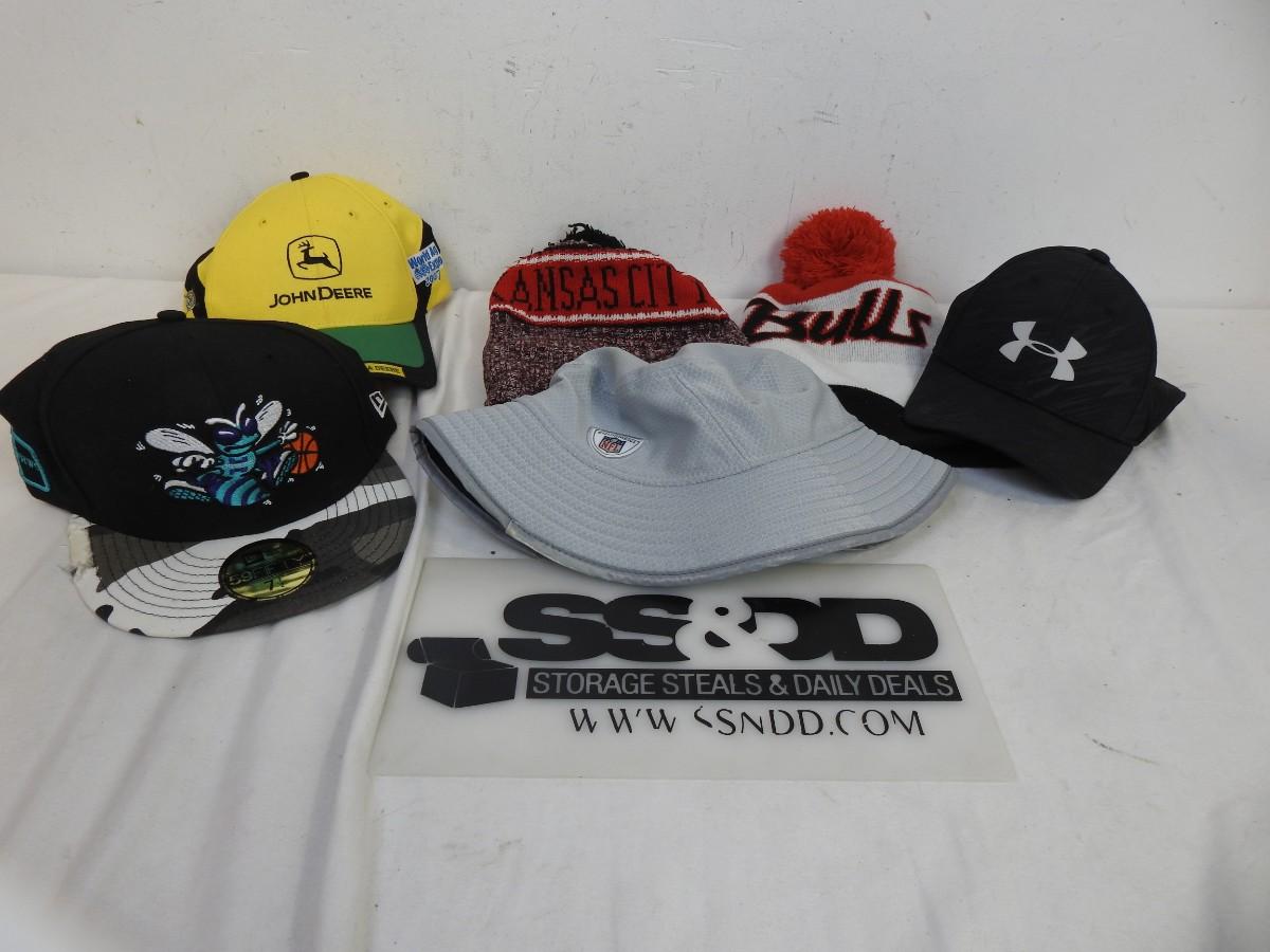 Hats, 6 total: John Deere, Bulls, Charlotte Hornets, NFL, Kansas City, Under Armour