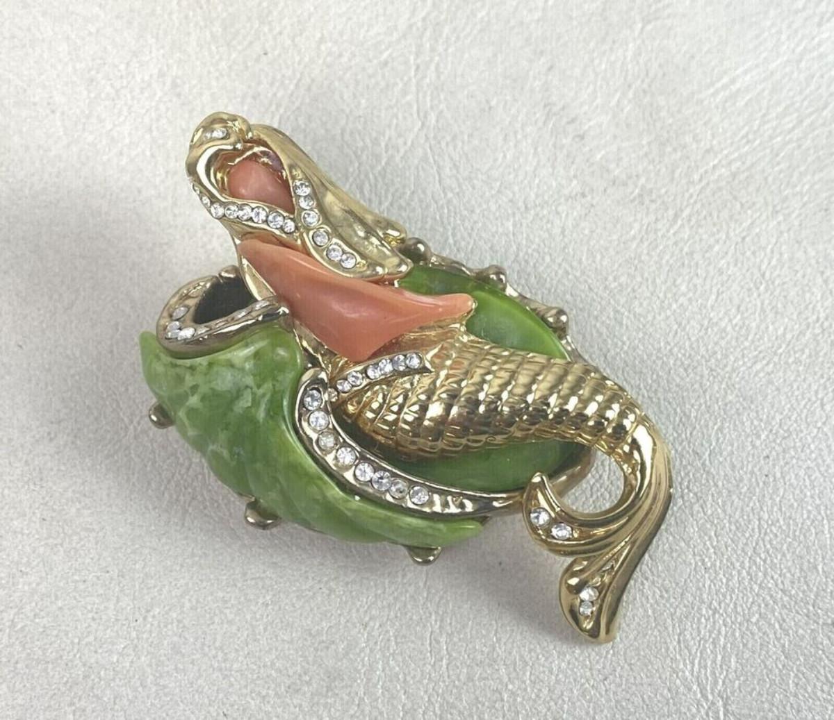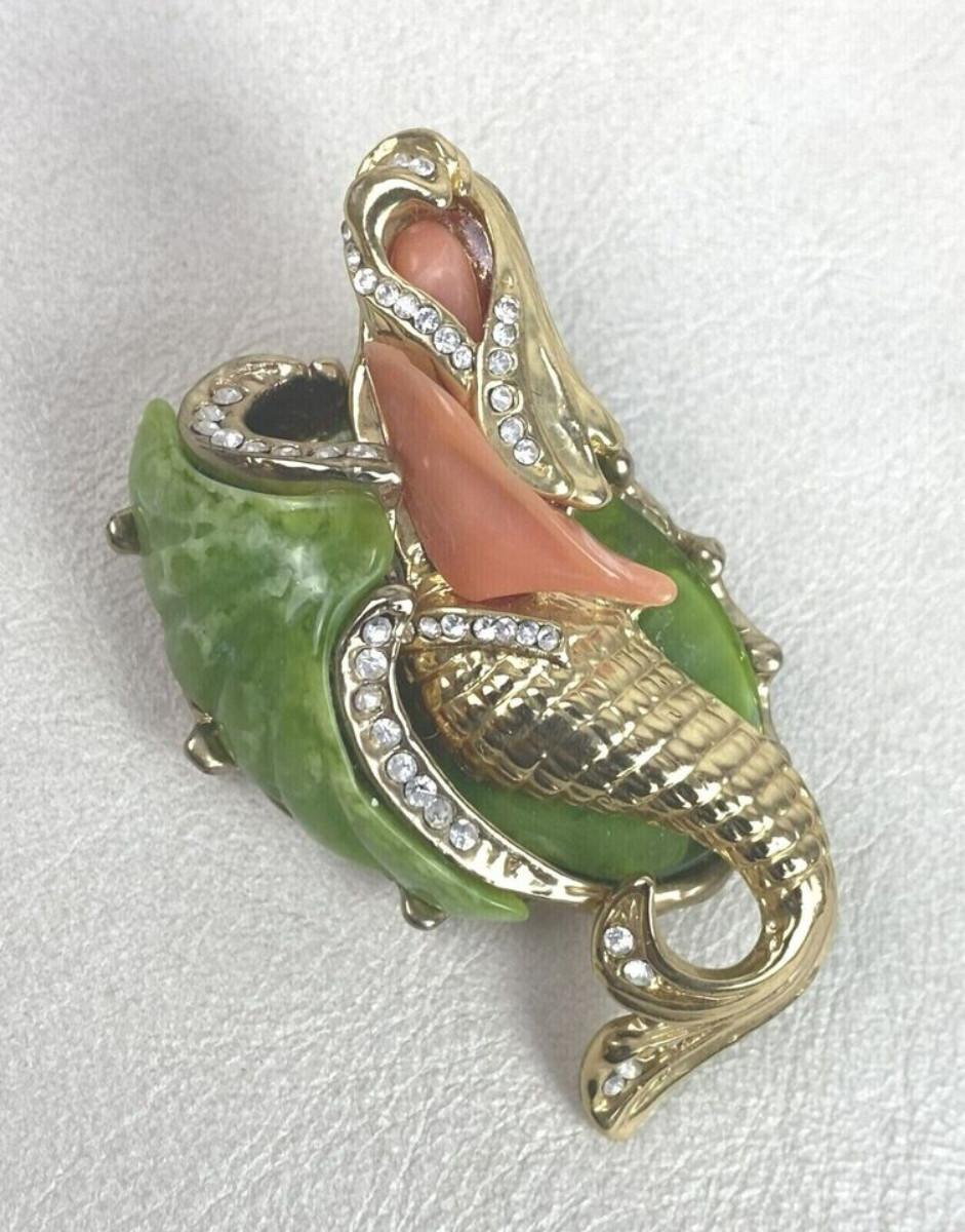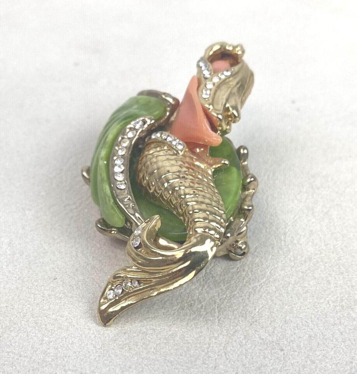 Here is an unsigned piece attributed to Hattie Carnegie...This striking reclining Mermaid pin or brooch is in excellent condition..all of the Austrian rhinestones are in place..No tarnish on the gold plated finish..Faux coral and shell..Circa 1960's...Approx. 54mm...As shown...