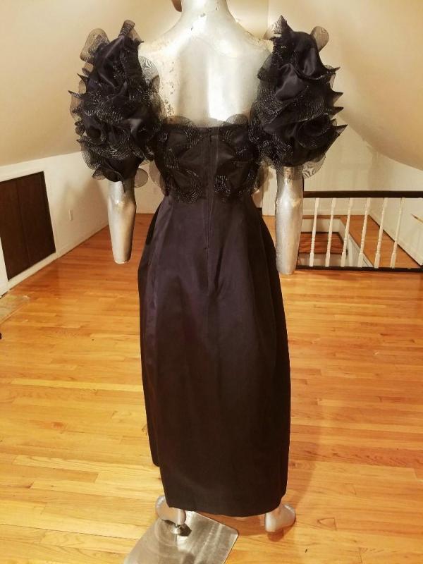 A very rare Haute Couture Museum worthy silk evening gown By Iconic Designer Bill Blass . Bubble skirt with amazing details ,short balloon sleeves with horsehair ribbons in a swirl embroidered design, and a cerise cloth millinery flower. CB seam was let out at the back by the zipper but could be let in very easily . In amazing vintage condition.
