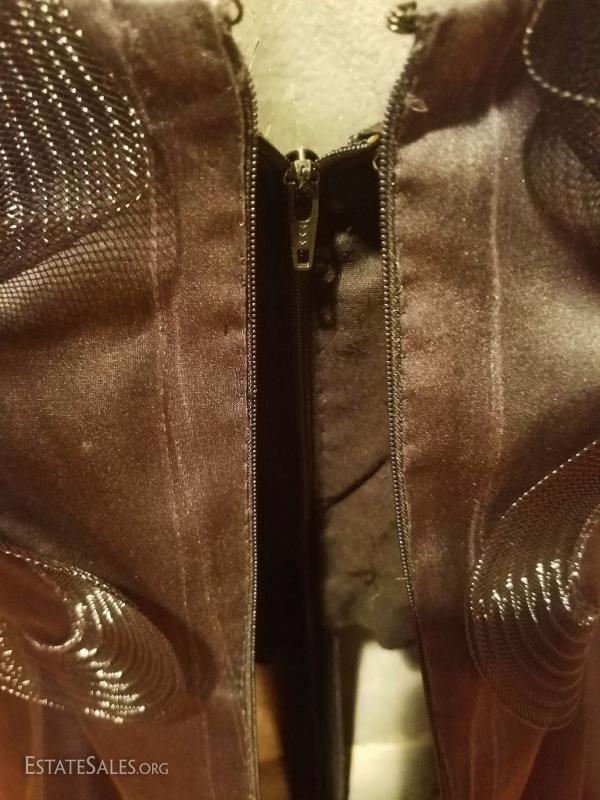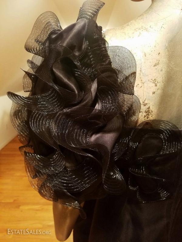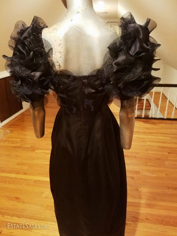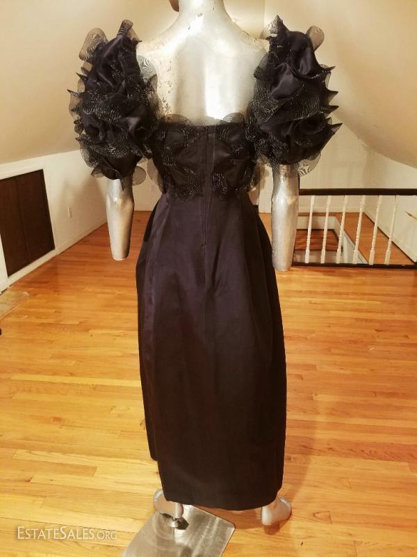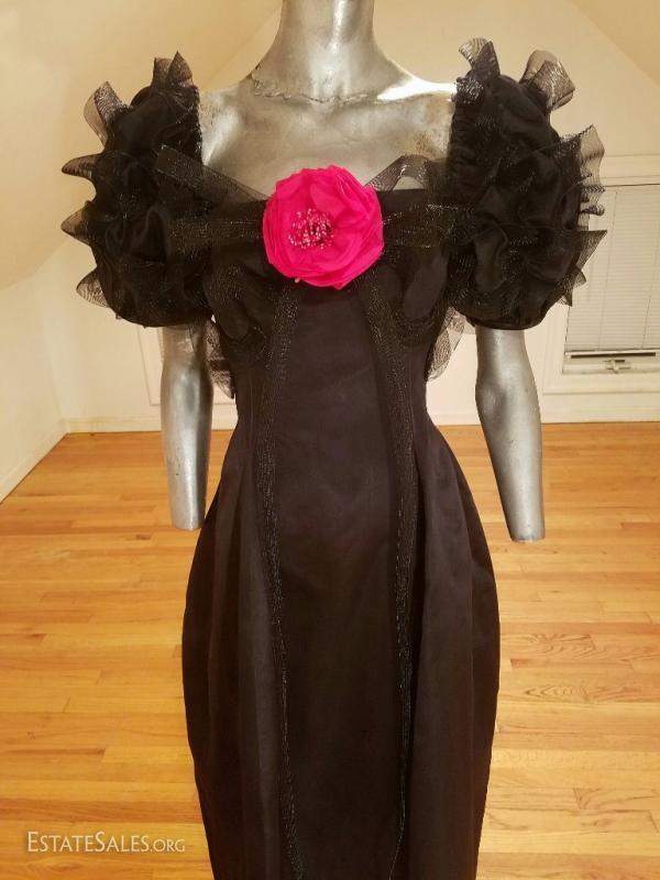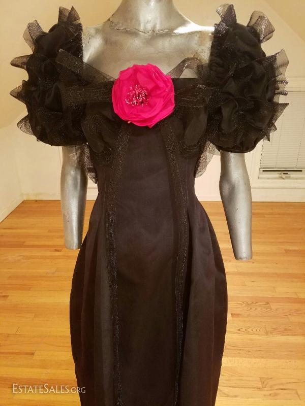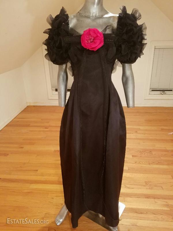 A very rare Haute Couture Museum worthy silk evening gown By Iconic Designer Bill Blass . Bubble skirt with amazing details ,short balloon sleeves with horsehair ribbons in a swirl embroidered design, and a cerise cloth millinery flower. CB seam was let out at the back by the zipper but could be let in very easily . In amazing vintage condition.