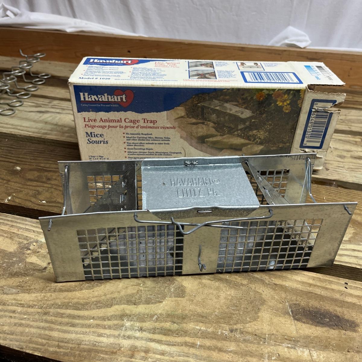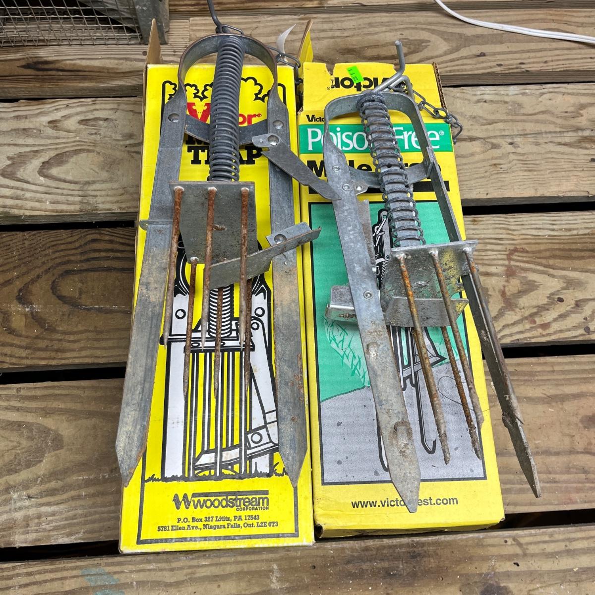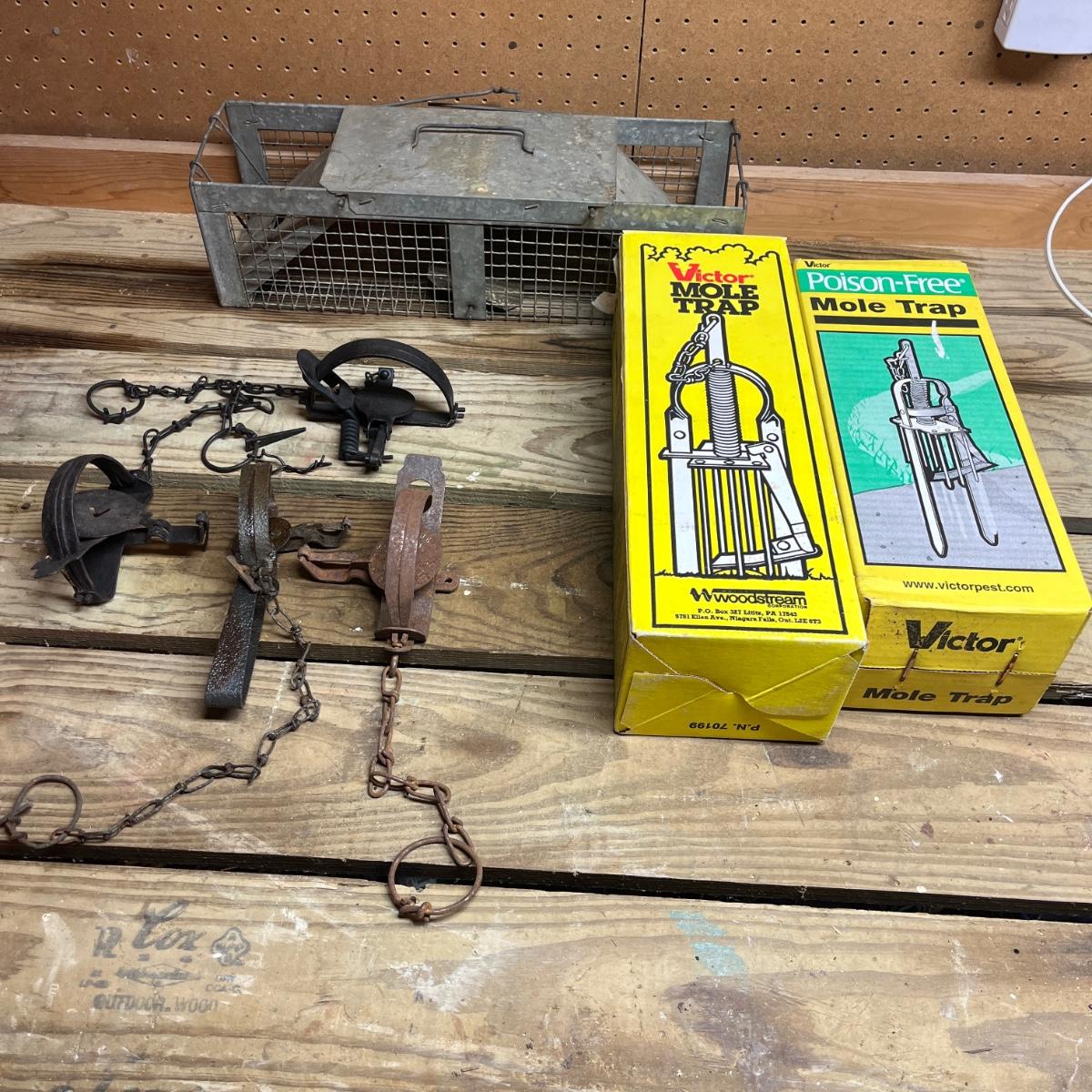 Lot includes two Havahart metal humane animal traps, two metal mole traps and four metal leg hold traps. Largest trap measures 18” x 5” x 5”H. Also includes an 8” x 3.5” x 3.5”H Havahart trap.