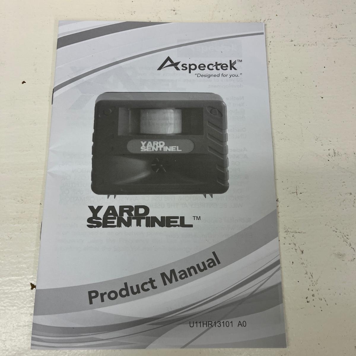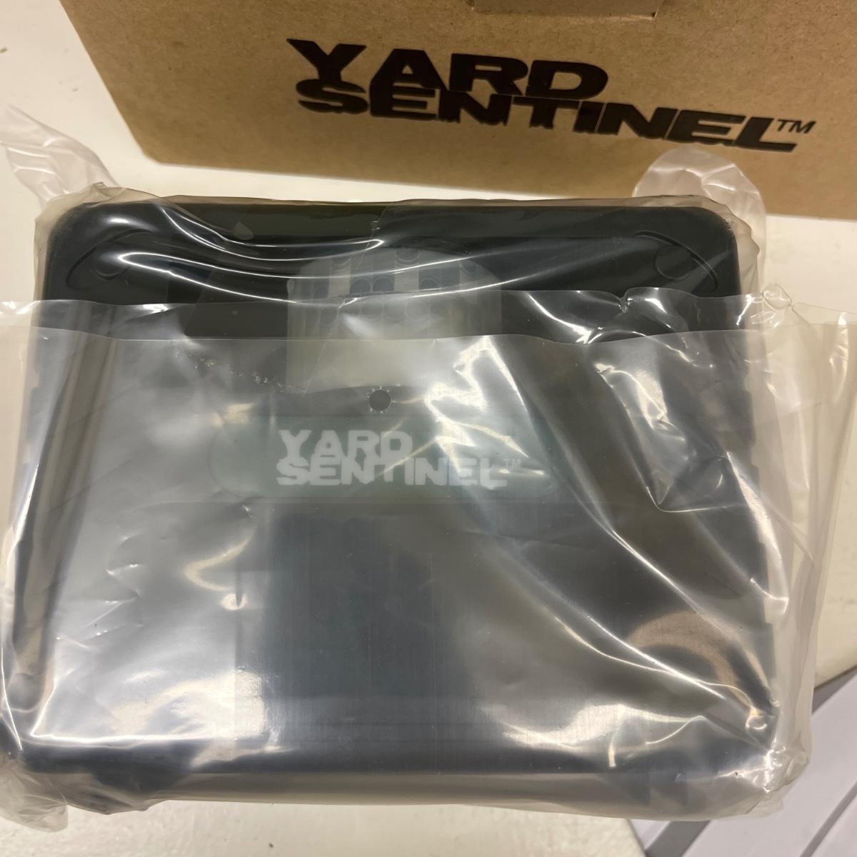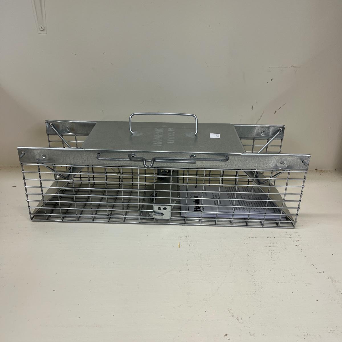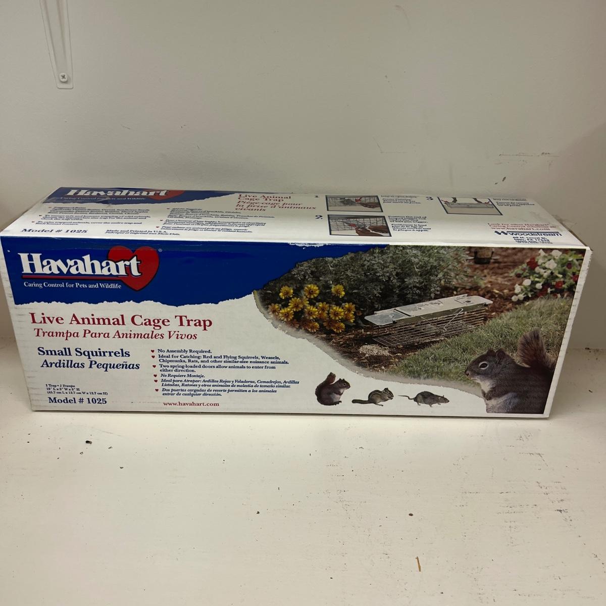 Lot includes a Havahart live animal cage trap and a Yard Sentinel animal repeller. Both items are NIB. Cage measures 18” x 5” x 5”H.