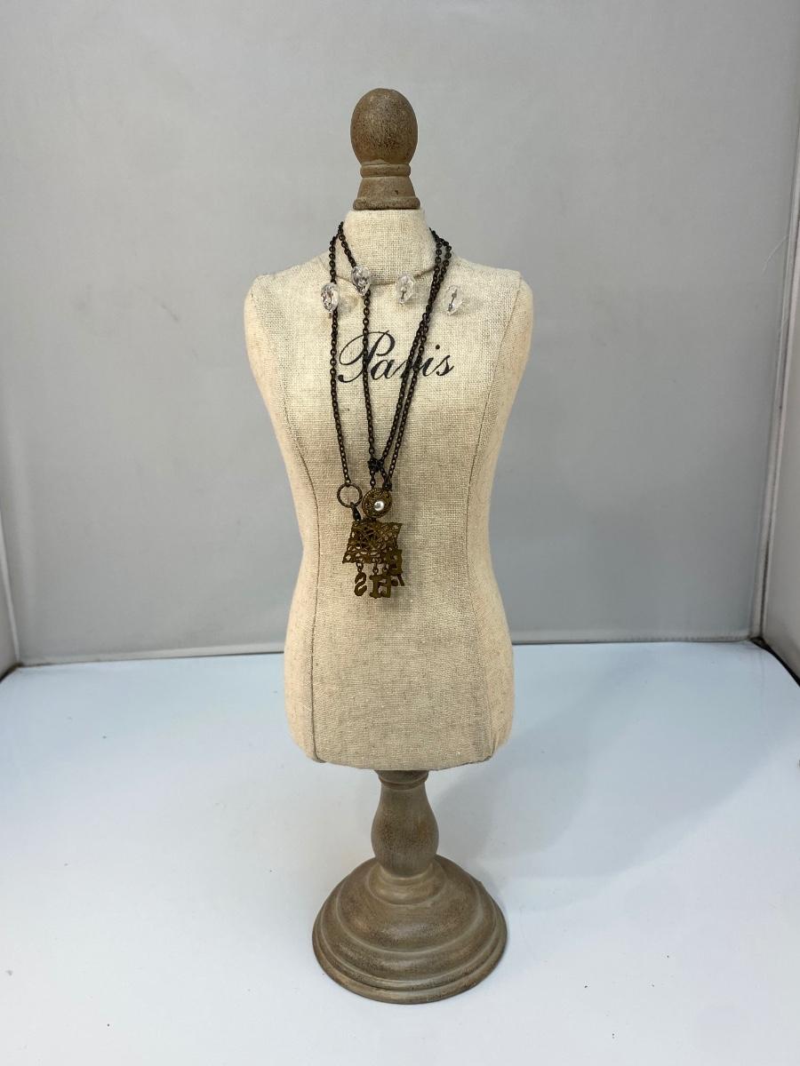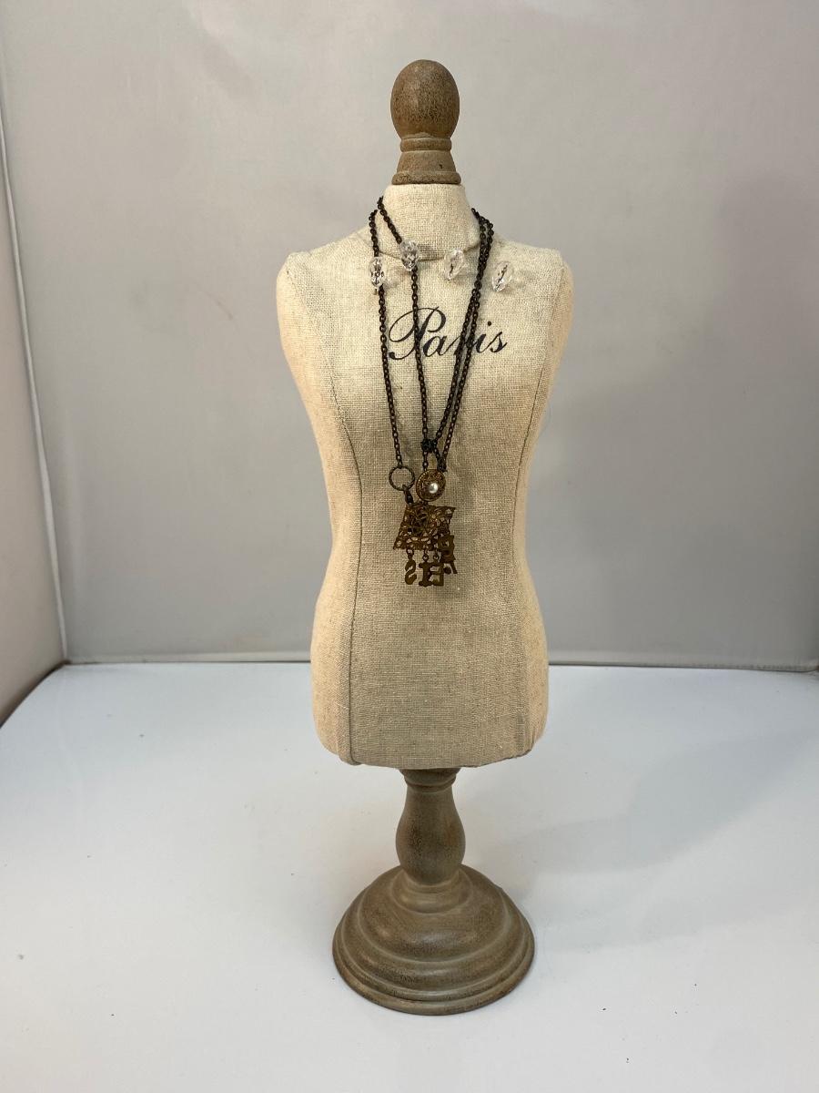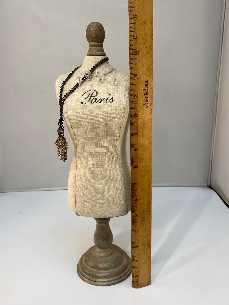 Paris Themed Miniature Dress Form with Necklace Mannequin Jewelry Holder by Parisian Home. In good previously displayed condition. Gold tone metal necklace has charms that spell Paris on the end. About 16" size. Made of material, included is four push pins for hanging or pinning things to it.