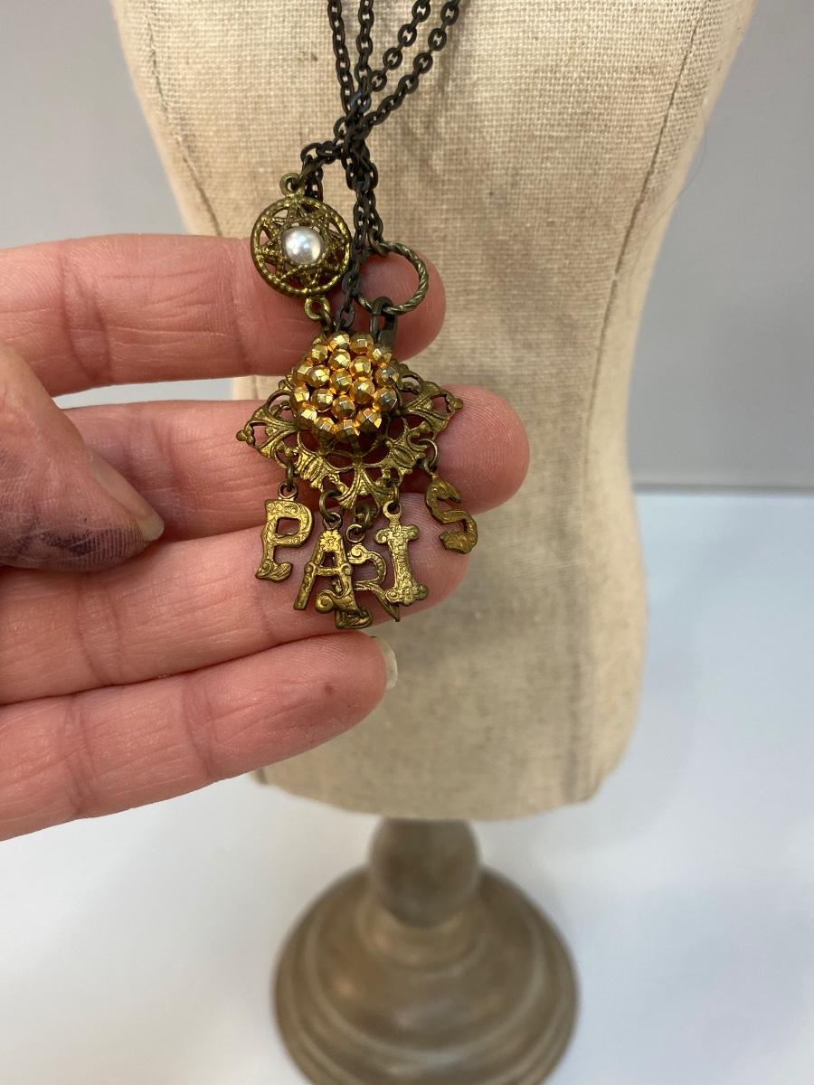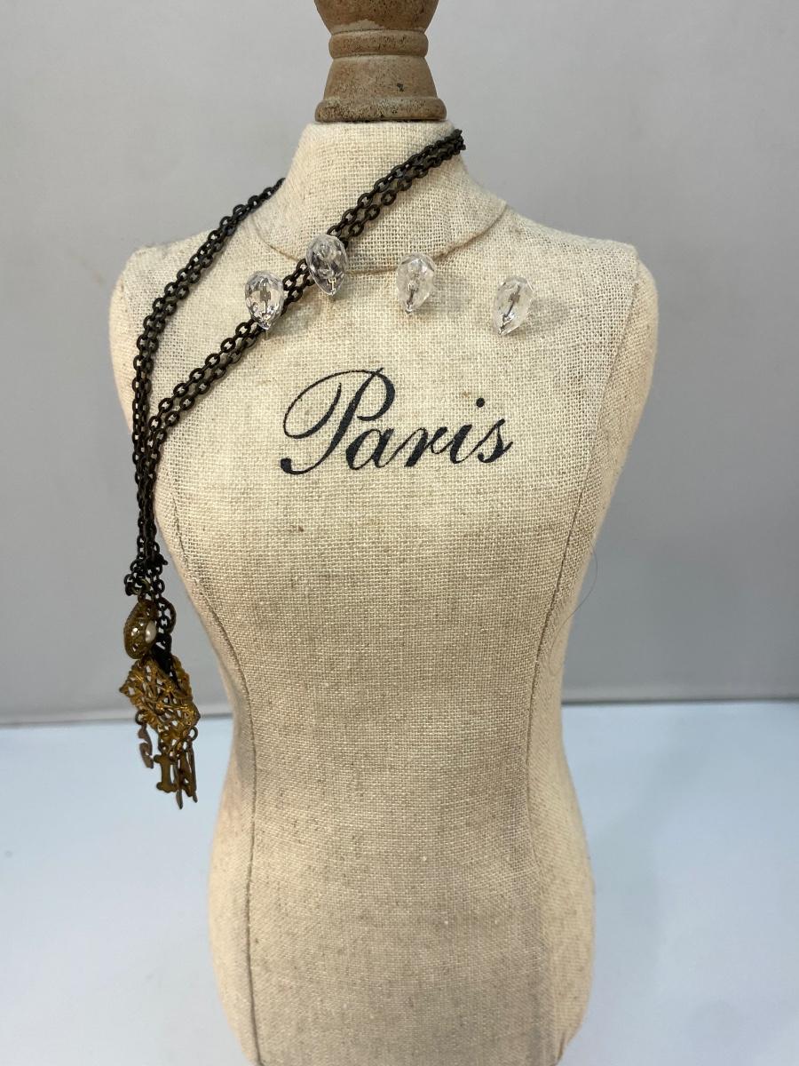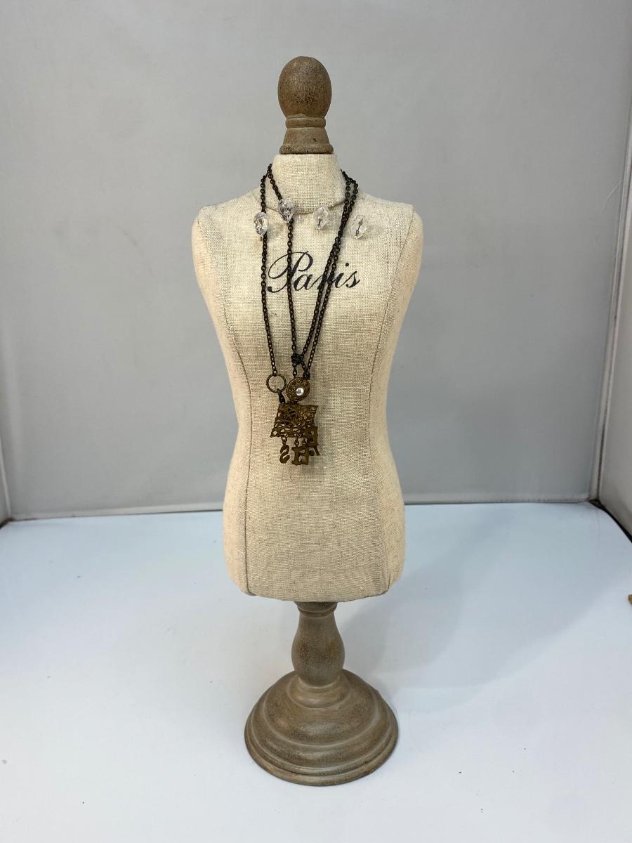 Paris Themed Miniature Dress Form with Necklace Mannequin Jewelry Holder by Parisian Home. In good previously displayed condition. Gold tone metal necklace has charms that spell Paris on the end. About 16" size. Made of material, included is four push pins for hanging or pinning things to it.