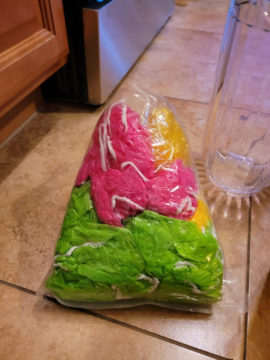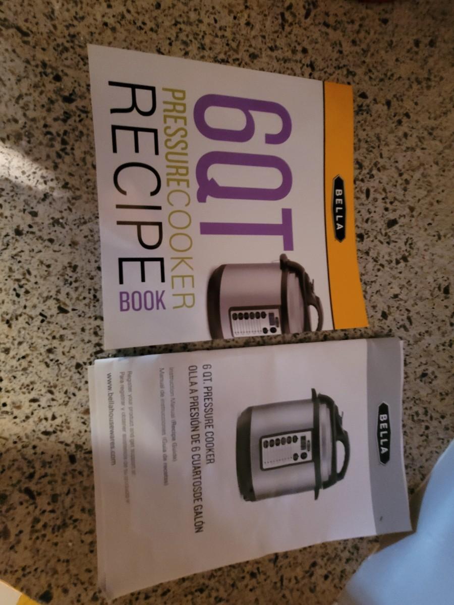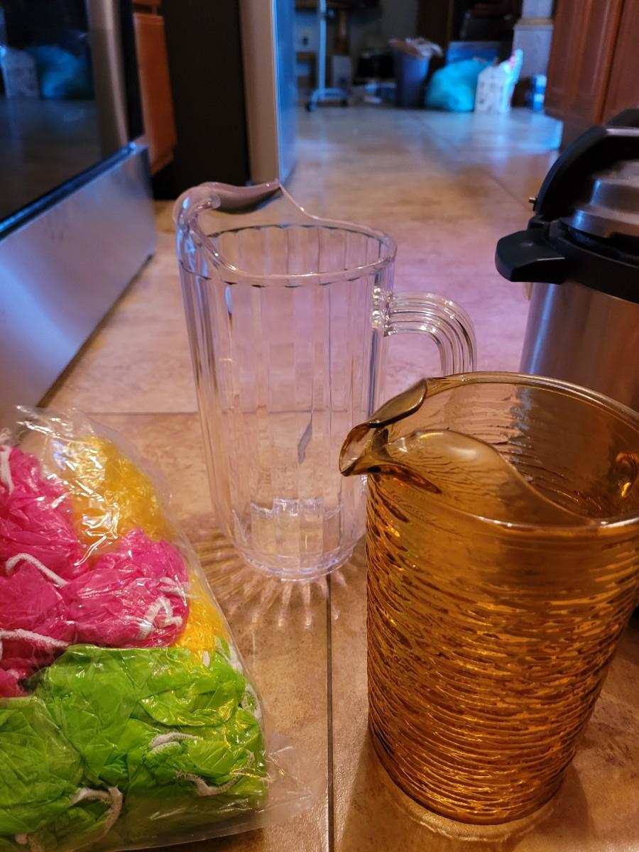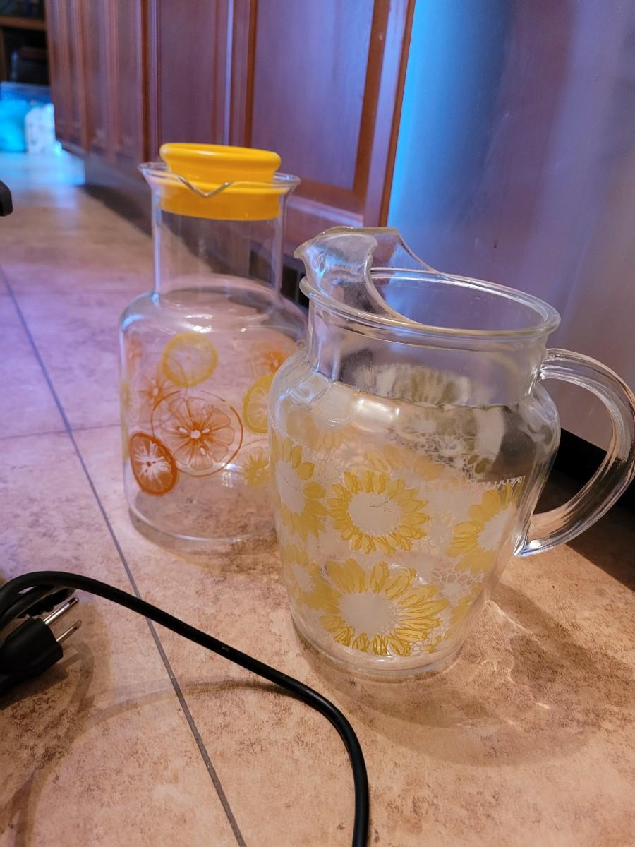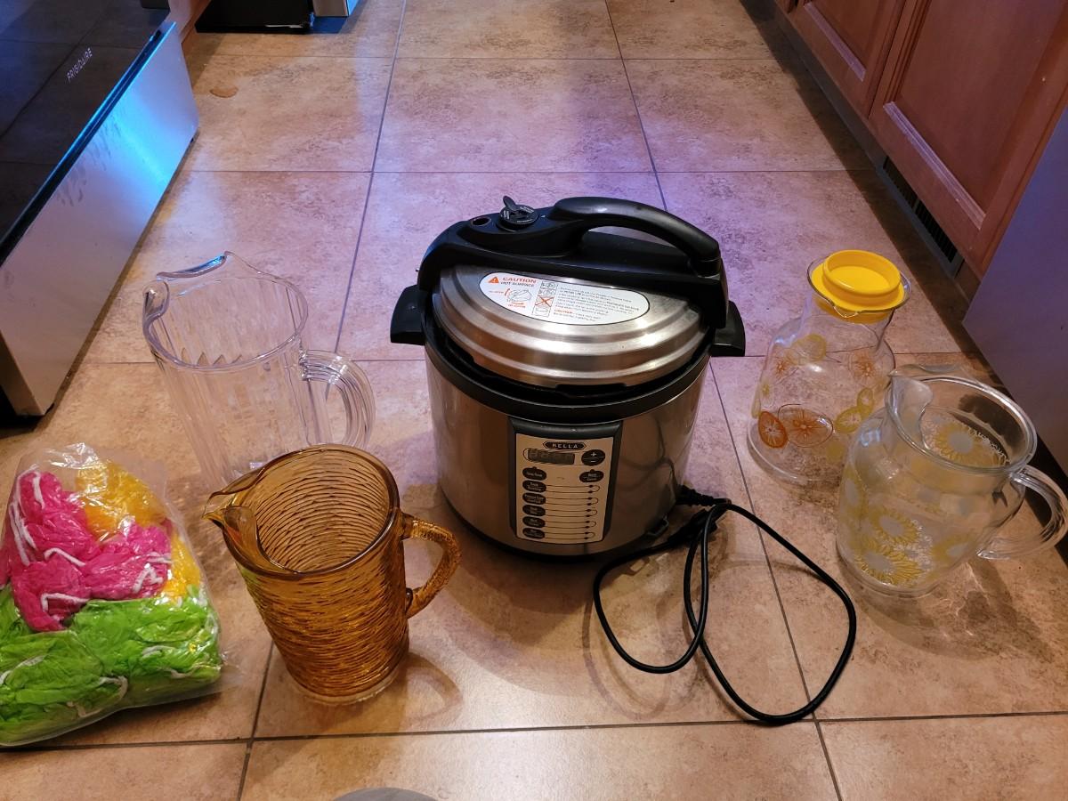 The tallest pitcher is plastic, the other three are glass, not sure if those colored things are hair covers or shoe, pressure cooker works and comes with original manual