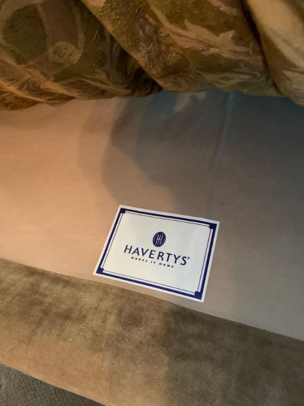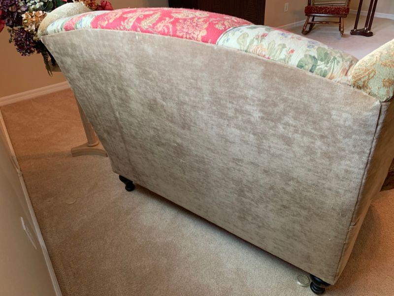 Haverty Love Seat with matching ottoman and side table with floral arrangement