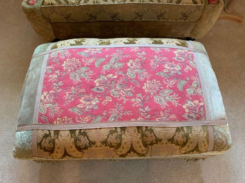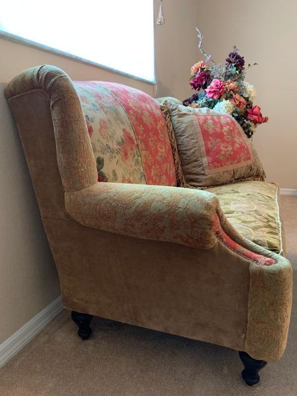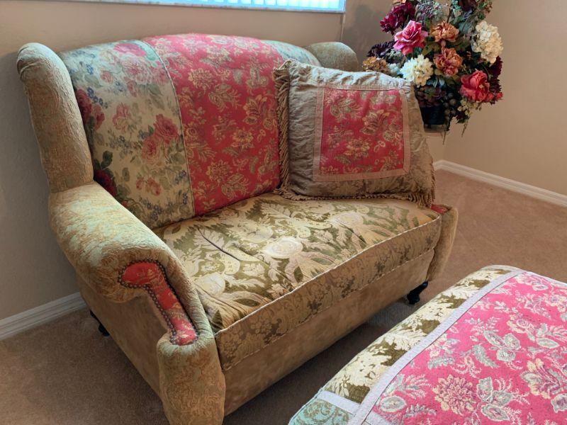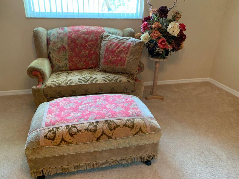 Haverty Love Seat with matching ottoman and side table with floral arrangement. Great Condition. Comes with matching pillow.